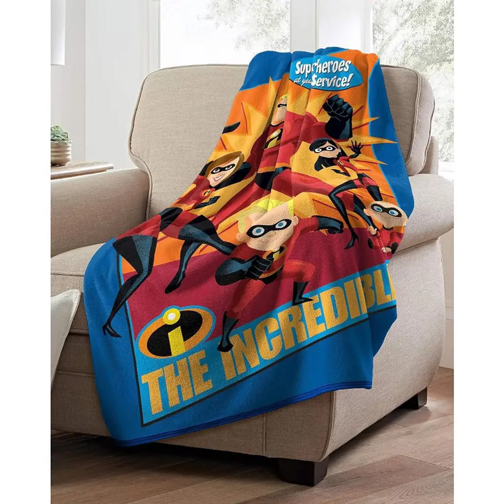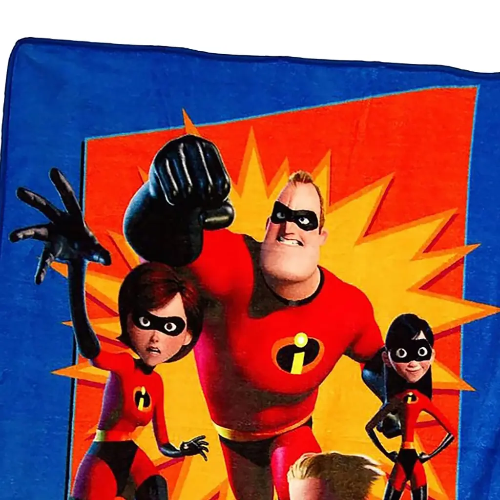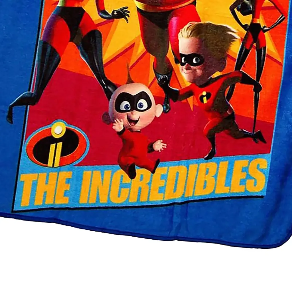Relax and get ready for adventure with this Incredibles fleece throw blanket! Featuring a bold graphic of the Parr family, including Mr. Incredible, Elastigirl, Violet, Dash, and Jack-Jack. This fun and colorful blanket is sure to be a hit with fans. The cozy micro raschel throw blanket measures 46" x 60" and is great for snuggling up on the couch for a movie night, adding an extra layer to your bed, or simply enhancing your superhero-themed decor. Made from soft polyester fabric, this throw is easy to care for. Just machine wash in cold water with like colors and tumble dry on low.