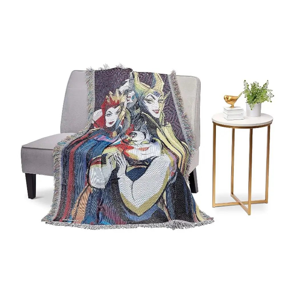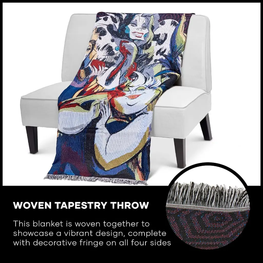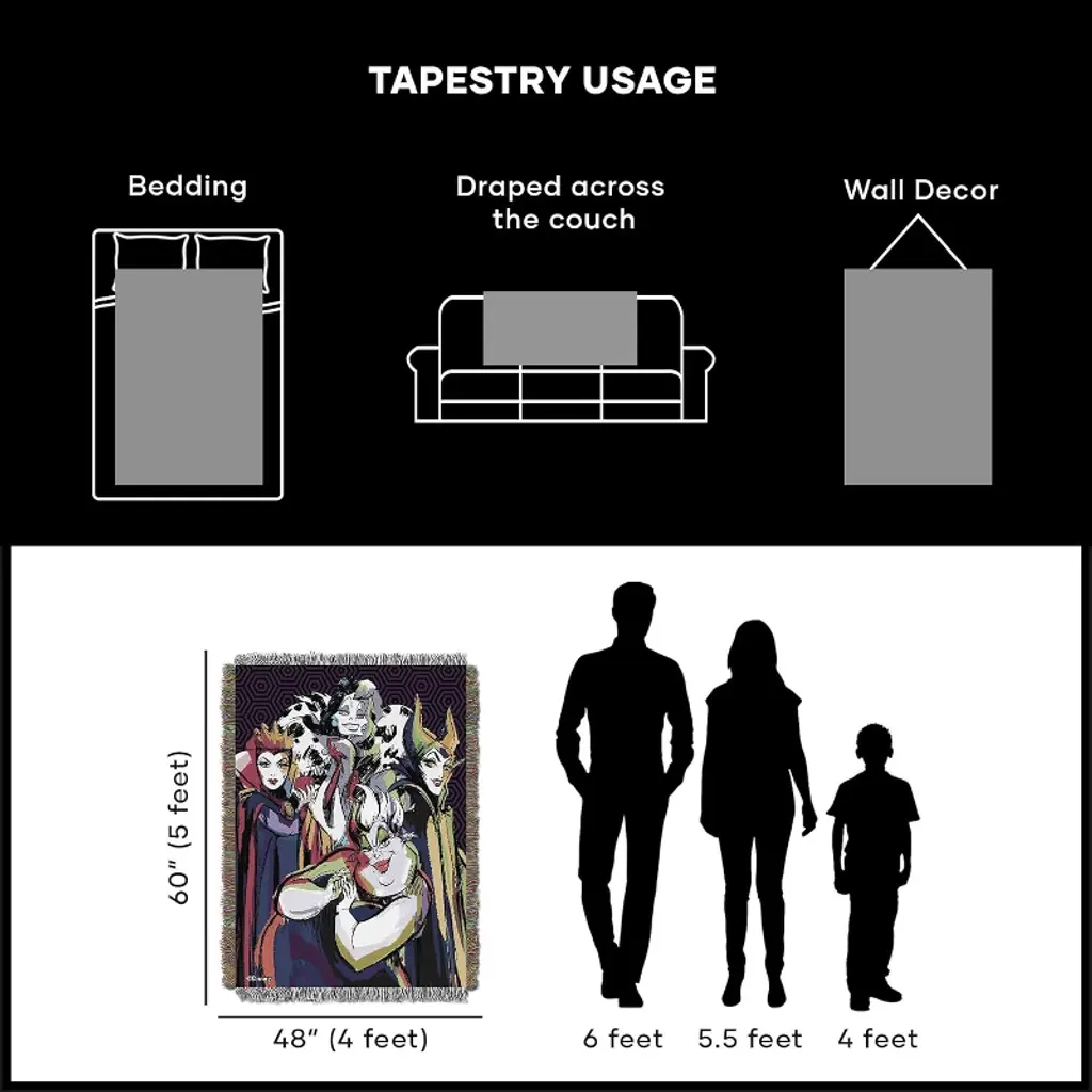 Bring a touch of mischief to your home decor with the Northwest Villains Woven Tapestry Throw Blanket. This blanket showcases a striking woven design featuring a group of mischievous Disney villains. Measuring 48" x 60", this tapestry throw is great for draping over a sofa, chair, or bed to add a dramatic flair to any room. It's a fun and stylish way for any Disney fan to show off their favorite antagonists. Made from a durable blend, this throw is easy to care for. Machine wash cold separately and tumble dry on low.