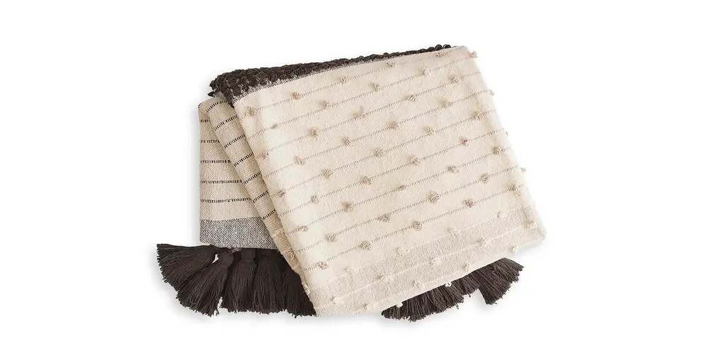 This cotton blanket boasts boho-chic style with ticking stripes and color-blocked patterning. Soft gray and ivory tones complement the large charcoal tassels that accent the edges of this contemporary throw.