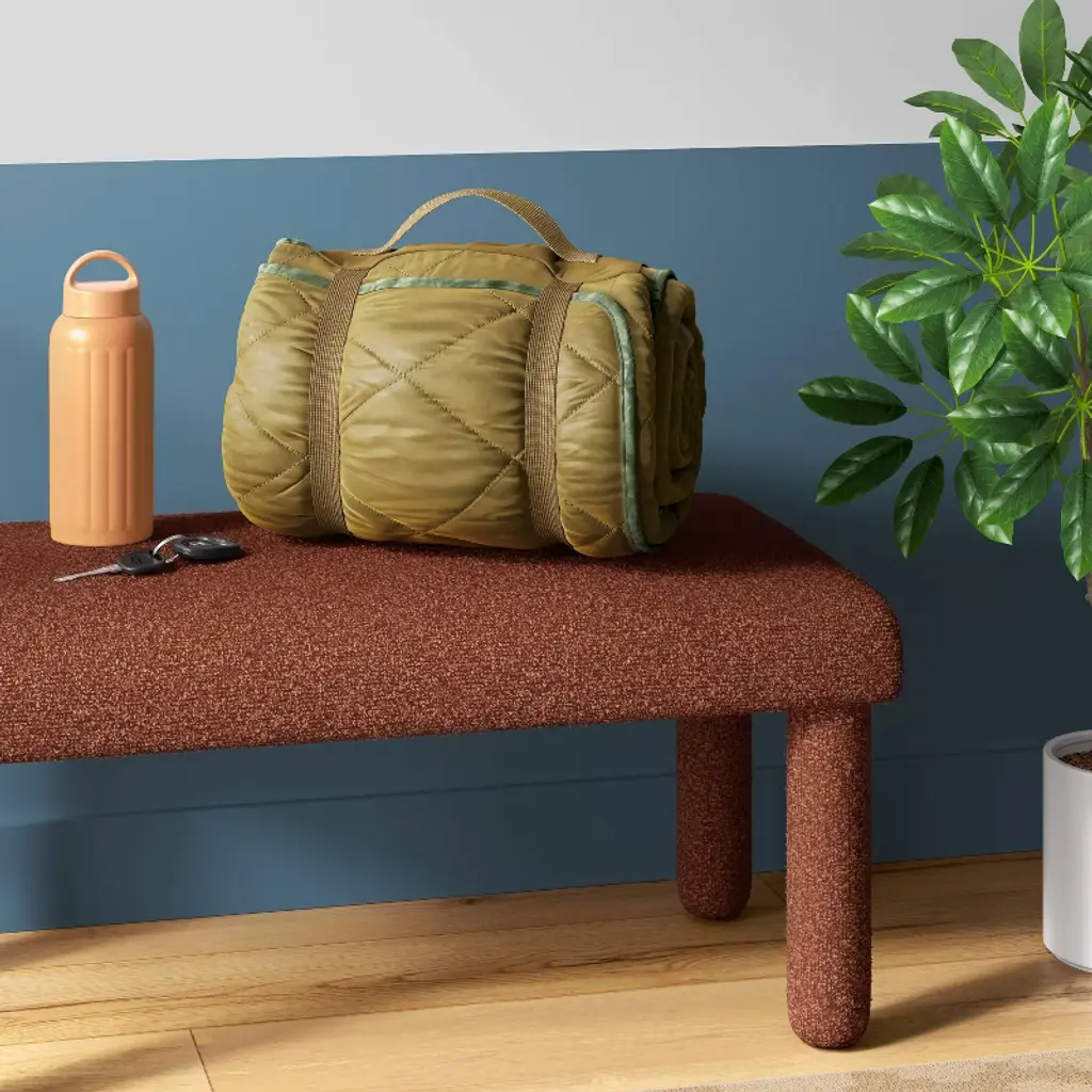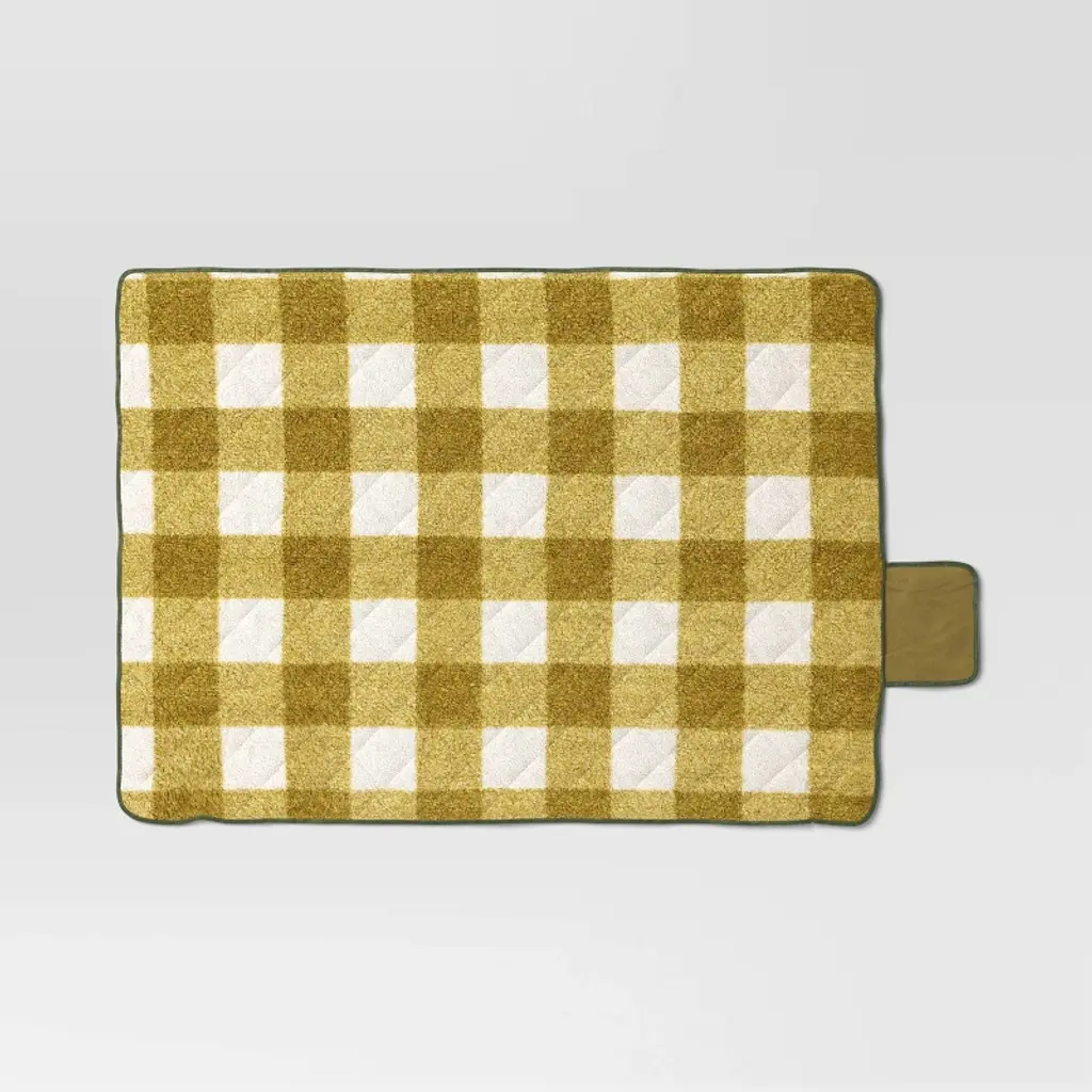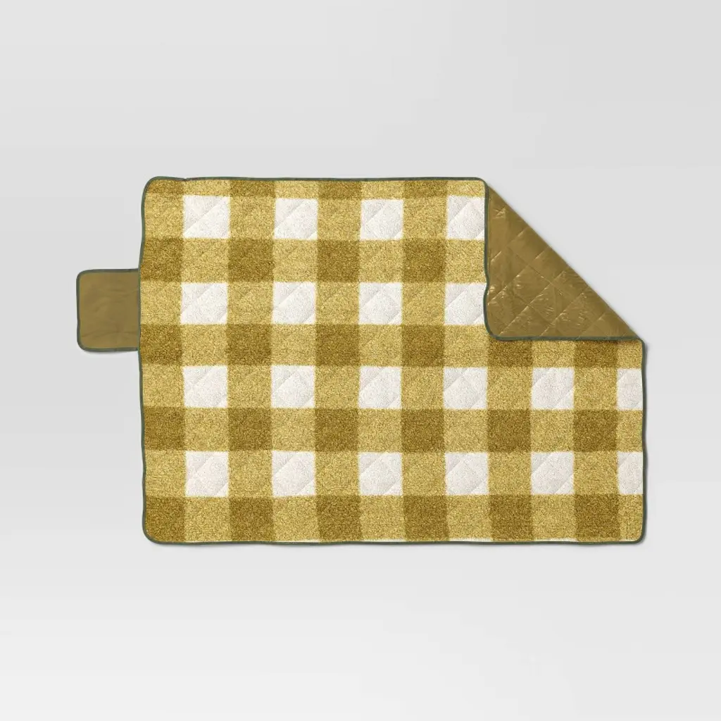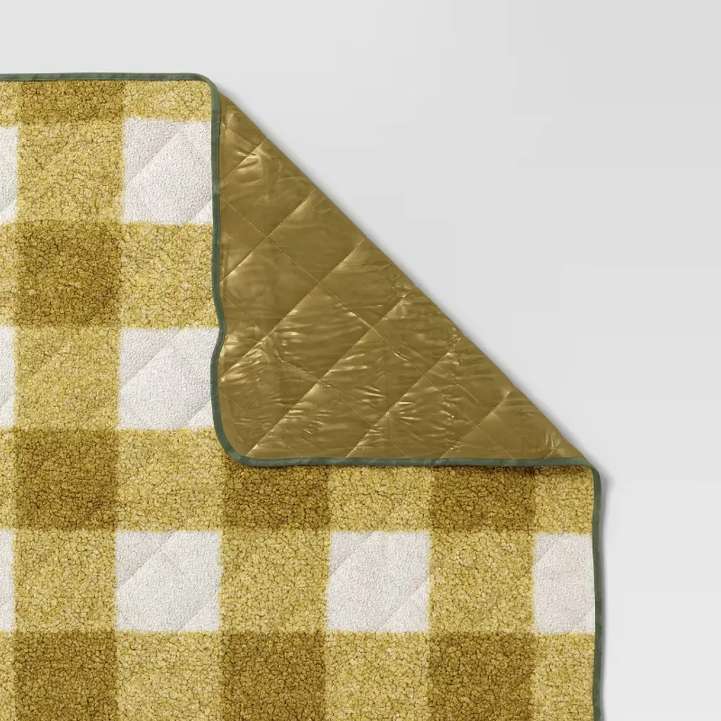 Stay warm anywhere with this On-the-Go Collection Quilted Check Throw Blanket from Room Essentials™. This rectangular quilted blanket is made from lightweight recycled polyester and features a classic checkered pattern with a coordinating solid-color reverse. Easy to carry, store and use on the go, this machine-washable blanket boasts a convenient roll-up design with a built-in handle, making it effortless to take warmth and style wherever you go.Room Essentials™: Everyday Value