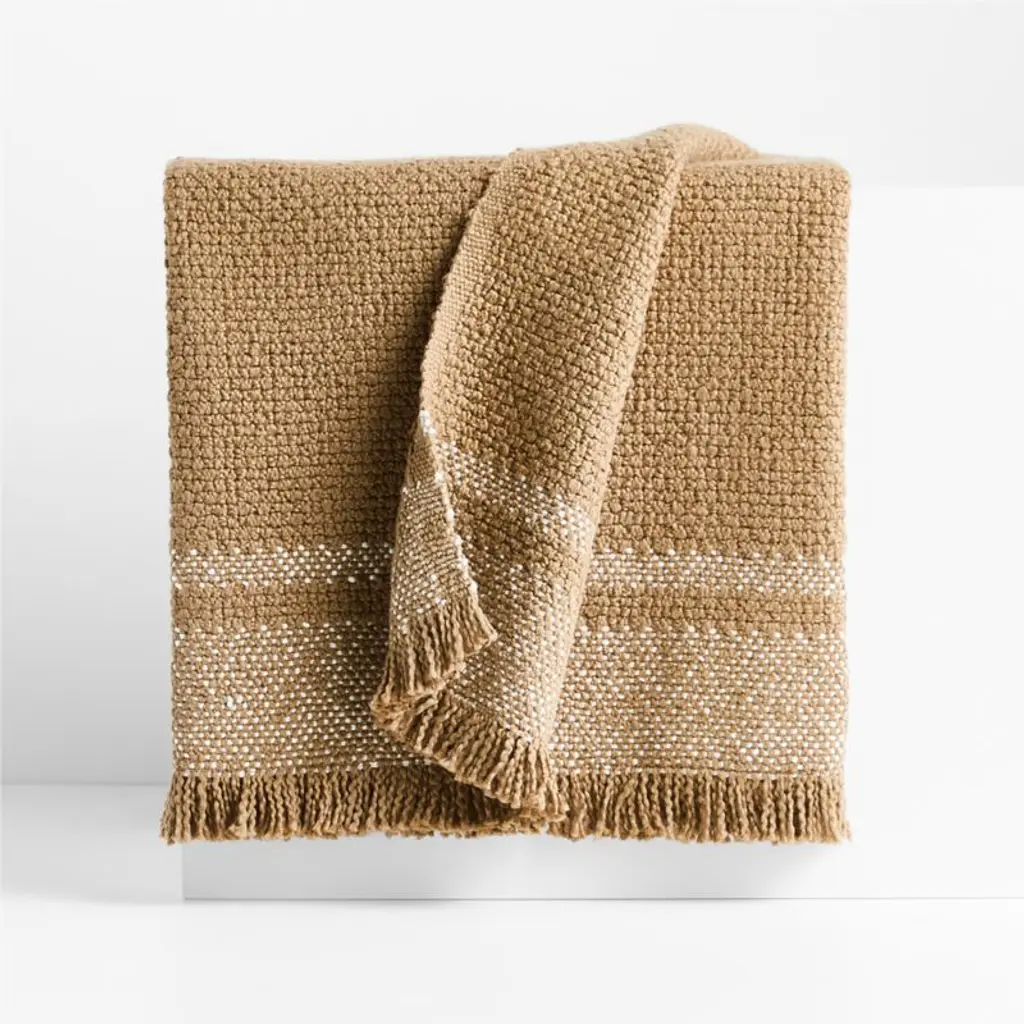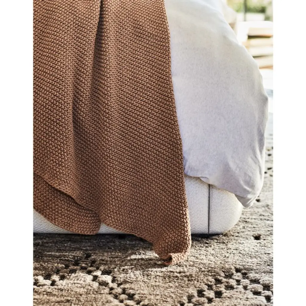 Our camel brown blanket elevates a timeless classic with artisan quality and sustainable fiber. Knit by hand, each organic cotton bed blanket takes a craftsperson five to six hours to make. The result is luxuriously soft and cozy with an irresistibly chunky-yet-elegant texture. Layer the brown blanket under your duvet or quilt to add warmth, or drape across your bed as a textural throw.