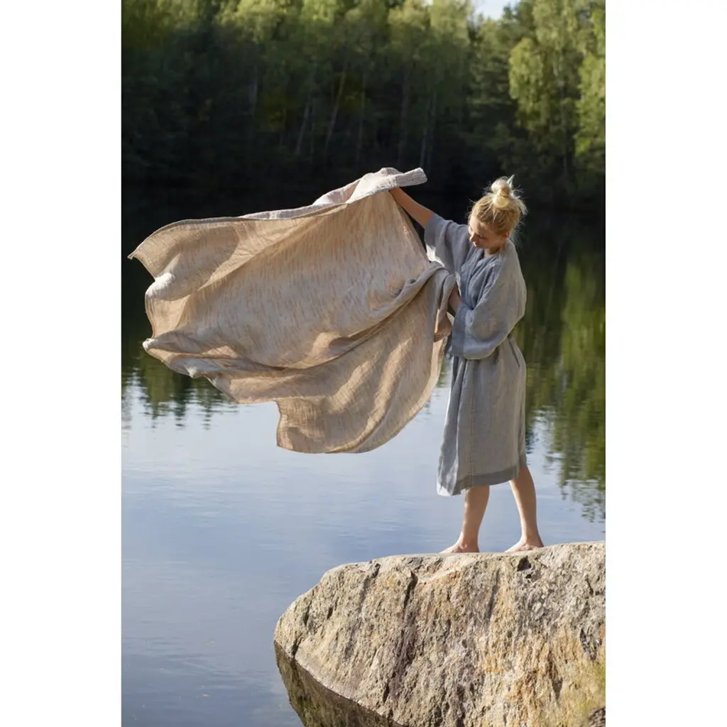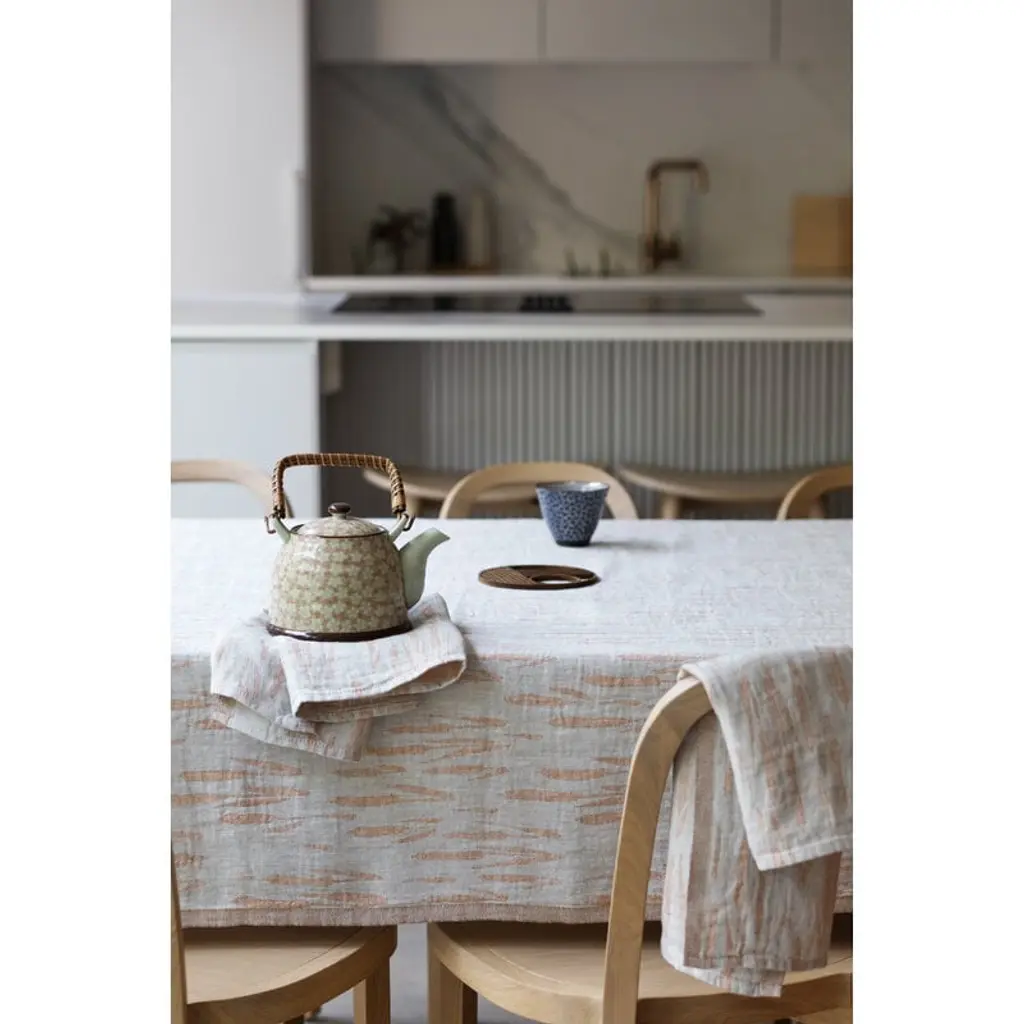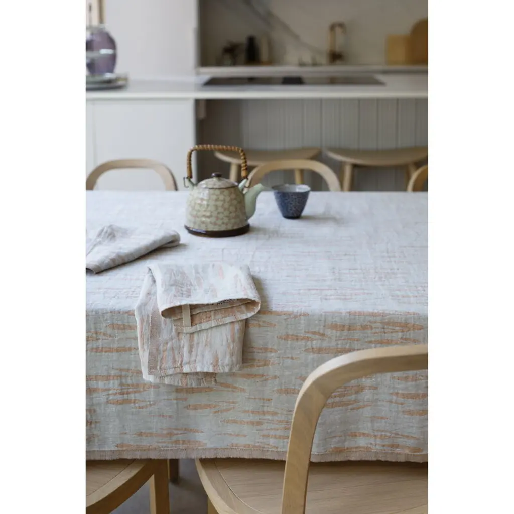 Osmankäämi tablecloth by Lapuan Kankurit is patterned with a lovely design by Elina Helenius, a tribute to the founder and first designer of Lapuan Kankurit, Liisa Hjelt. The original Osmankäämi textiles were designed back in the 1970s and woven from jacquard, but now the material is 100% linen. The versatile linen cloth completes the look of table settings as a beautiful tablecloth but also works as a thin blanket in the summer heat, a curtain at the window or a picnic mat in the park. The tablecloth has been woven in Finland at the own weaving mill of Lapuan Kankurit.