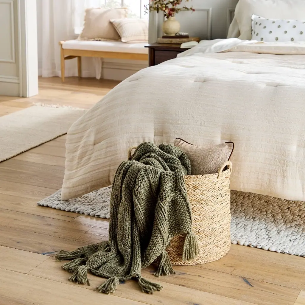 Add a touch of luxurious comfort to your bedscape or seating ensemble with this Oversized Cozy Knit Throw Blanket from Hearth & Hand™ with Magnolia. This oversized throw blanket is made from knitted recycled polyester-acrylic blend fabric for a soft and cozy feel, and it showcases a raised knitted pattern with decorative tassels for a classic look. Use it in the living room to snuggle up on a chilly night, or drape it over the back of an armchair to grab while you watch TV.Hearth & Hand™ with Magnolia: Gather • Create • Enjoy