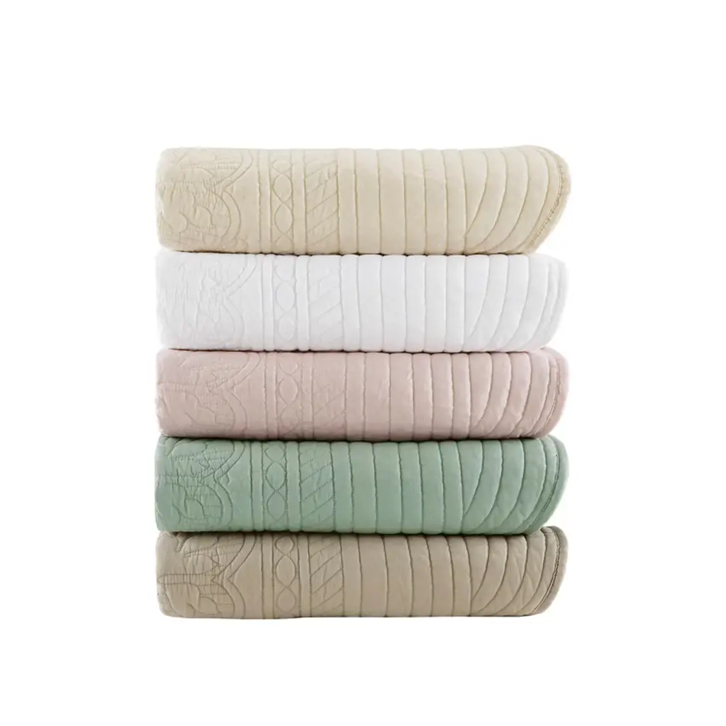 Description Tuscany is the perfect quilted throw for a new solid look. The decorative stitch pattern pairs easily with your existing decor and will sure to add a new decorative element with the beautiful scalloped edges. This quilted throw is filled with cotton filling and features a polyester microfiber fabrication on the face and the reverse. Its prewash finish gives a worn in appearance to this decorative throw. Product Details 60x72in 1 Throw:60inW x 72inL Material Face and Reverse: 100% polyester micro fiber quilted, prewash finish Filling: cotton 200gsm