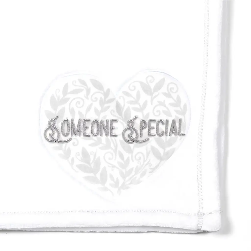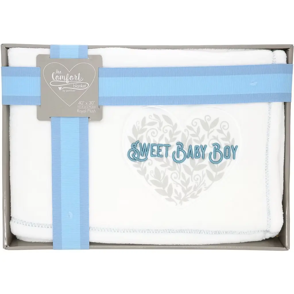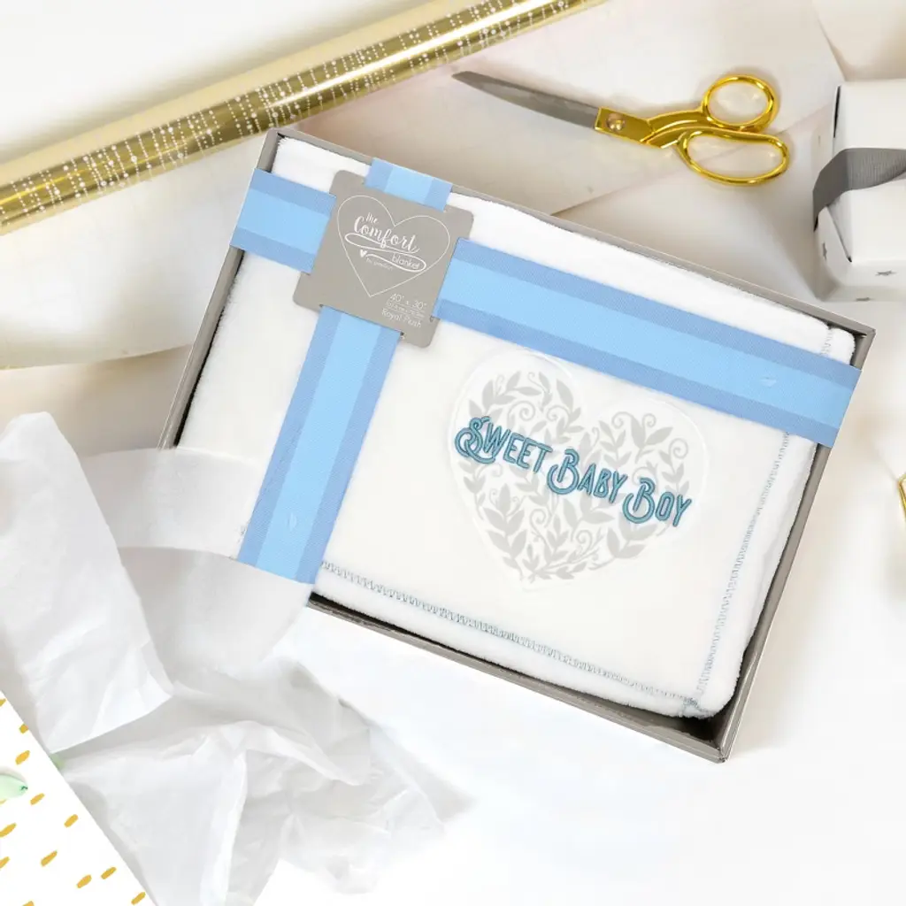 A 30" x 40" luxurious, neutral, cozy, soft bed or couch throw blanket is made from 100% polyester royal plush 320 GSM fabric with embroidered and printed detail. Beautiful gift packaging showcases the sewn-in patch with a beautiful blue striped ribbon outside on the sturdy tan box wrapped in a plastic polybag. A blue "Sweet Baby Boy" embroidered sentiment that is uplifting and comforting is featured on the bottom right corner of the front of the white home décor blanket with blue stitched edges on a white heart with a gray vine printed design embroidered edge patch. Machine wash cold on a gentle cycle with like colors. Do not bleach or iron. Tumble dry low. Babies are a blessing from above. Celebrate the baby & mom-to-be with this unique, soft & cozy baby's first blanket for baby boy showers. It is an adorable addition to any nursery for the little one to carry around wherever they go for years to come and even keep a keepsake as they grow older.