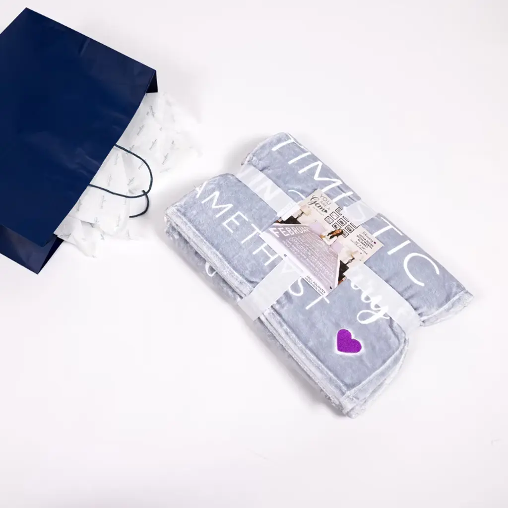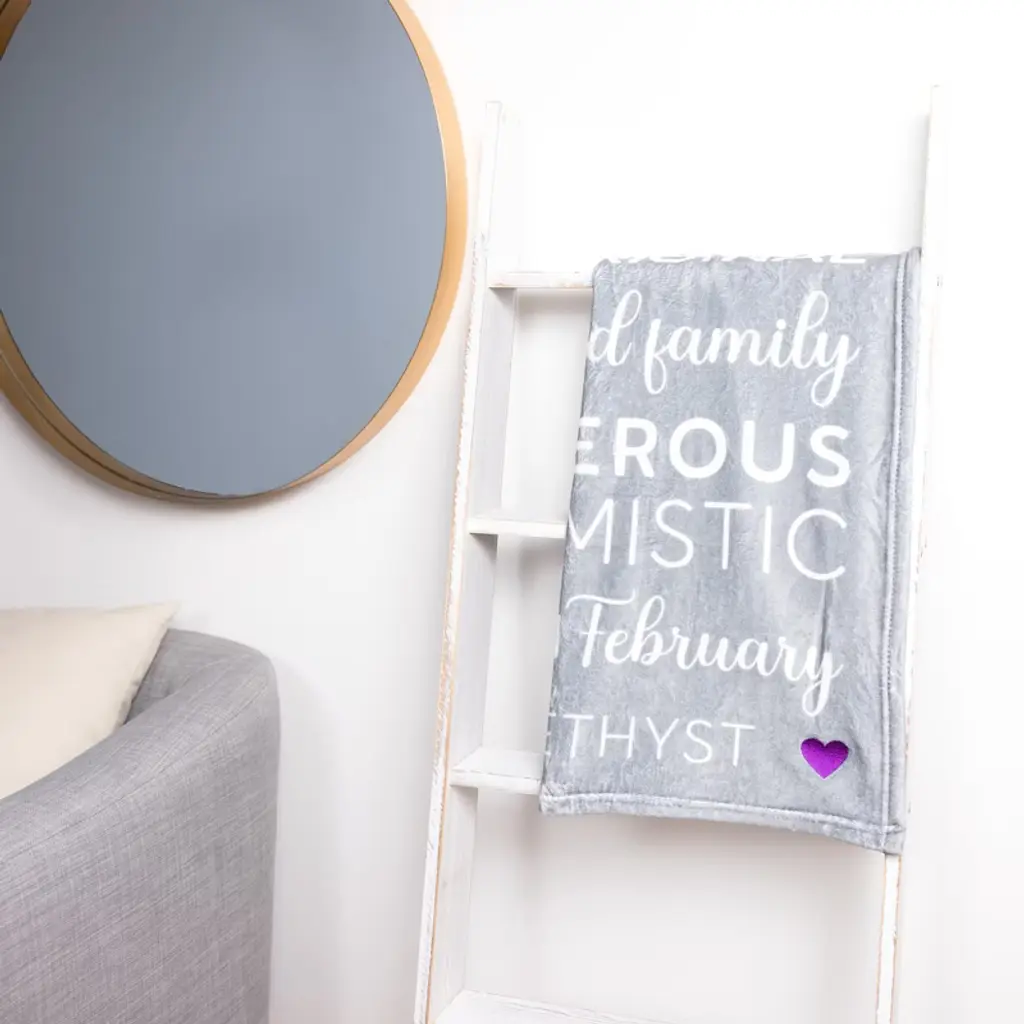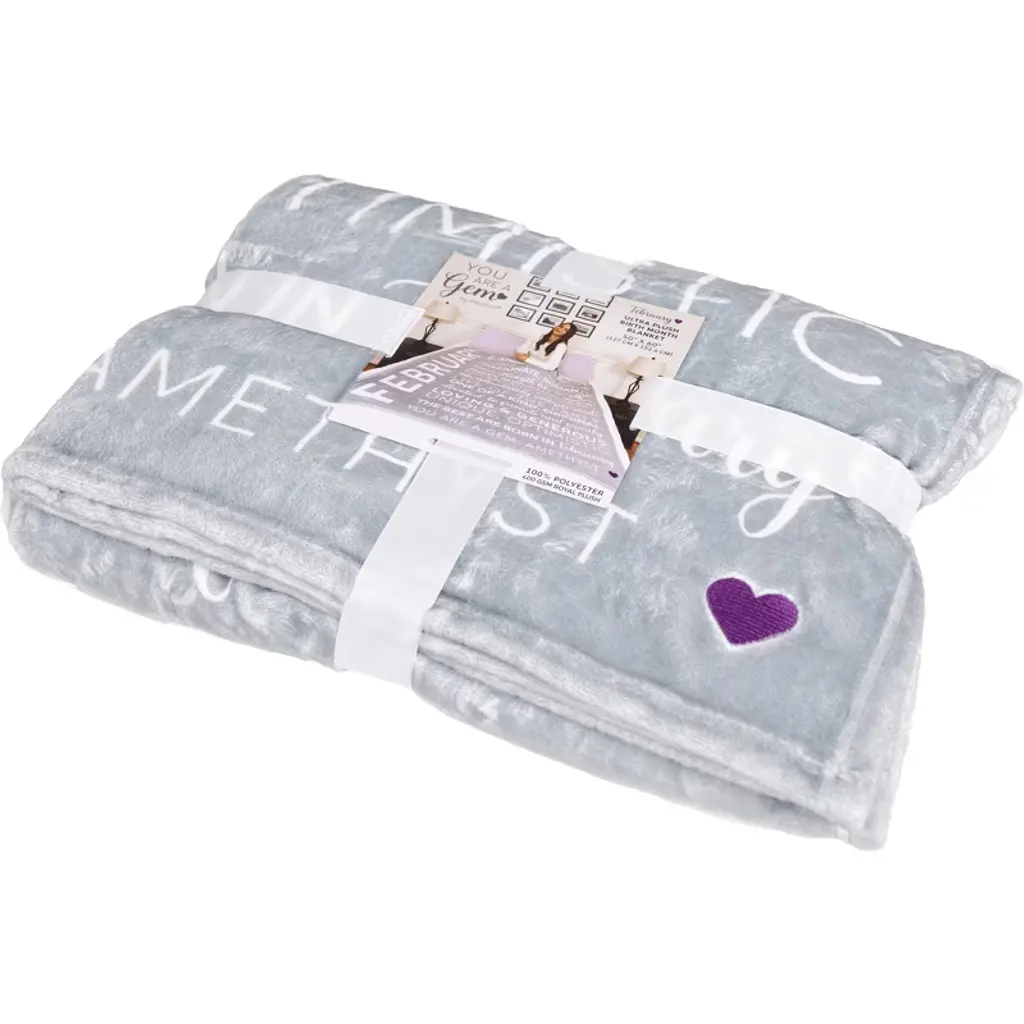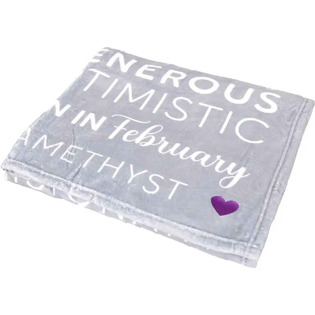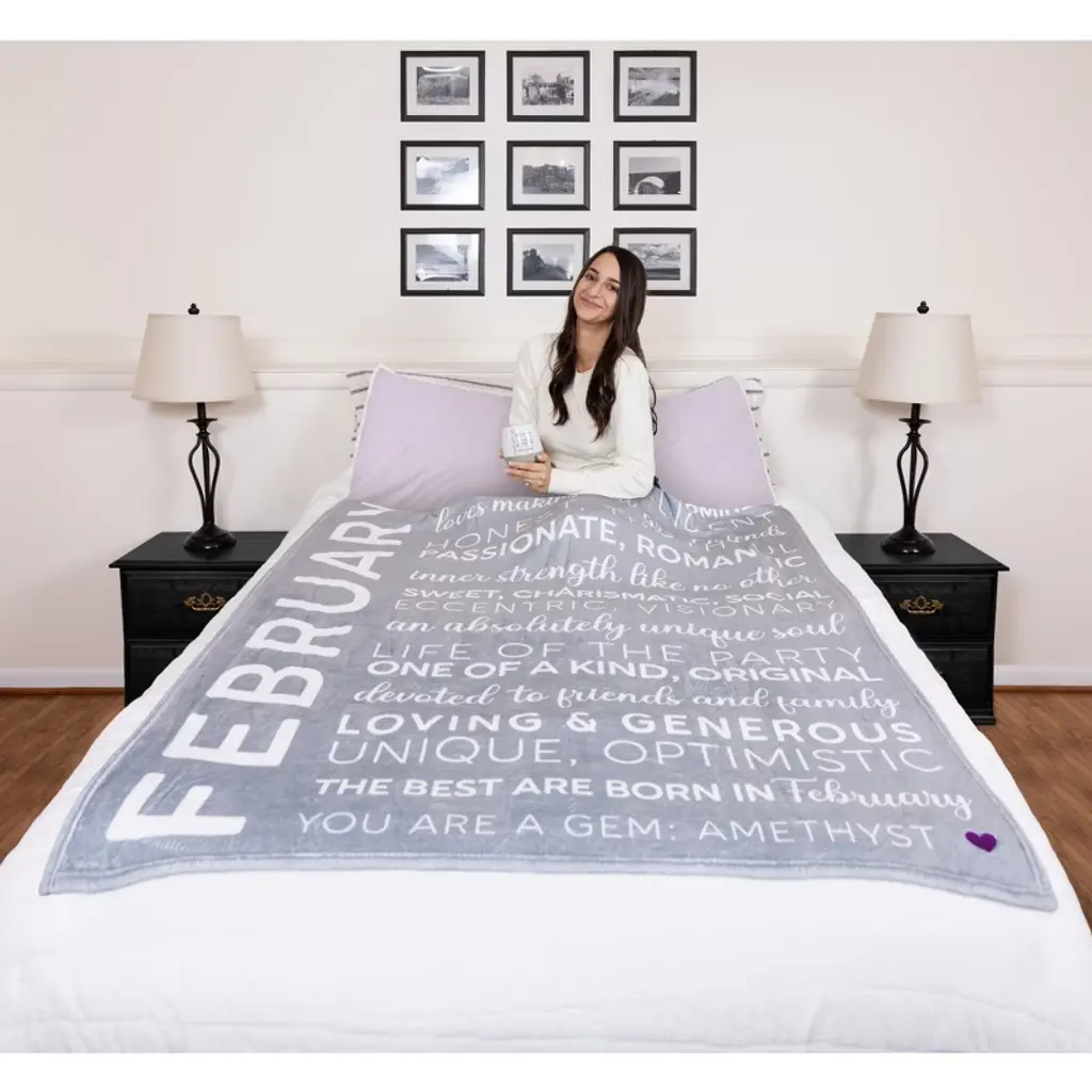 50" long x 60" tall and .5" wide premium throw is made from 400 GSM, 100% plush polyester. The excellent packaging consists of a white grosgrain bow-tied ribbon with a cardboard band containing material and sizing information. The printed sentiment read "February" down the left side of the blanket along with an "Ambitious, Loyal, Determined, Kind, Intelligent, Loves Making New Great Friends, Honest, Truthful, Passionate, Romantic, Inner Strength Like No Other, Sweet, Charismatic, Social, Eccentric, Visionary, An Absolutely Unique Soul, Life Of The Party, One Of A Kind, Original, Devoted To Friends And Family, Loving & Generous, Unique, Optimistic. The Best Are Born In February. You Are A Gem. Machine wash cold on a gentle cycle with like colors. For best results, hang or lay flat to dry. It can be tumble-dried on a low setting for 20 minutes. Never bleach or iron.