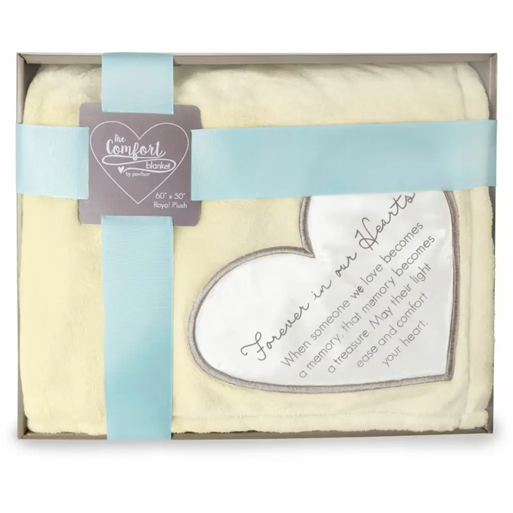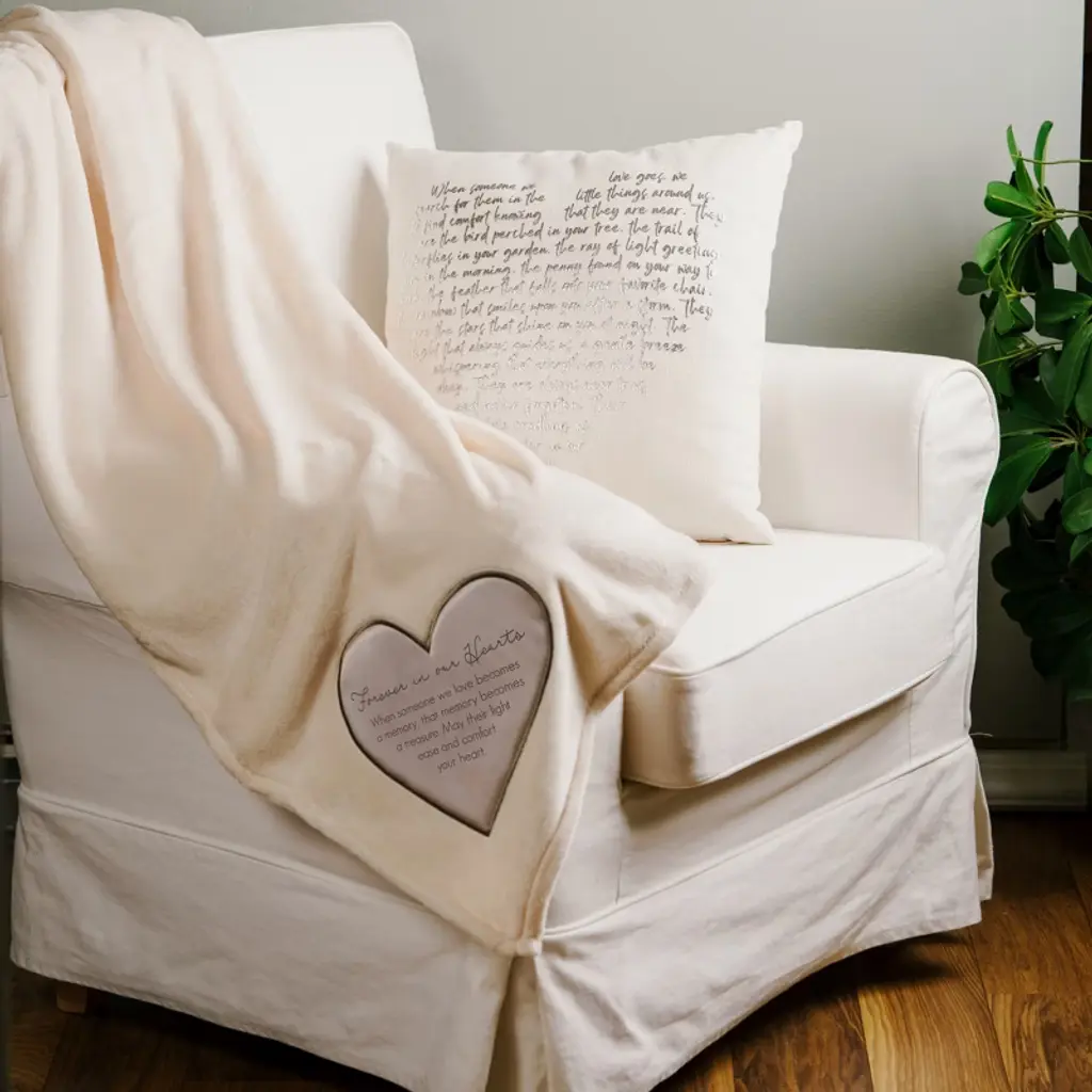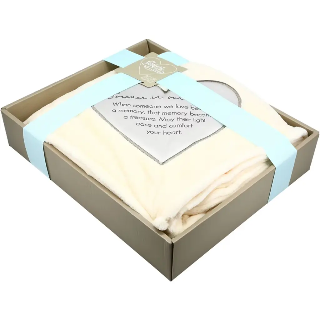 50" x 60" blanket, packaged in a ribbon-wrapped open-faced box, is made from high-quality 320 GSM plush royal polyester and features a silk detail. "Forever In Our Hearts; When Someone We Love Becomes A Memory, That Memory Becomes A Treasure. May Their Light Ease And Comfort Your Heart." text is printed onto embroidered heart. When machine washing, choose a cold wash separate from other items. Do not bleach. Do not iron. Tumble dry on a low heat setting. Great for remembering a loved one.