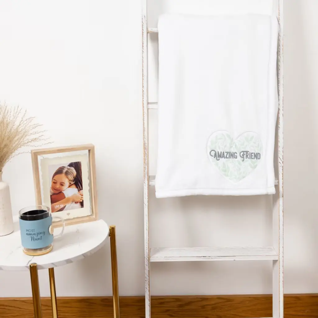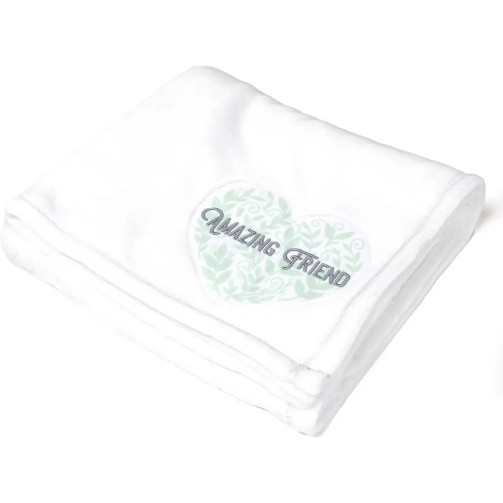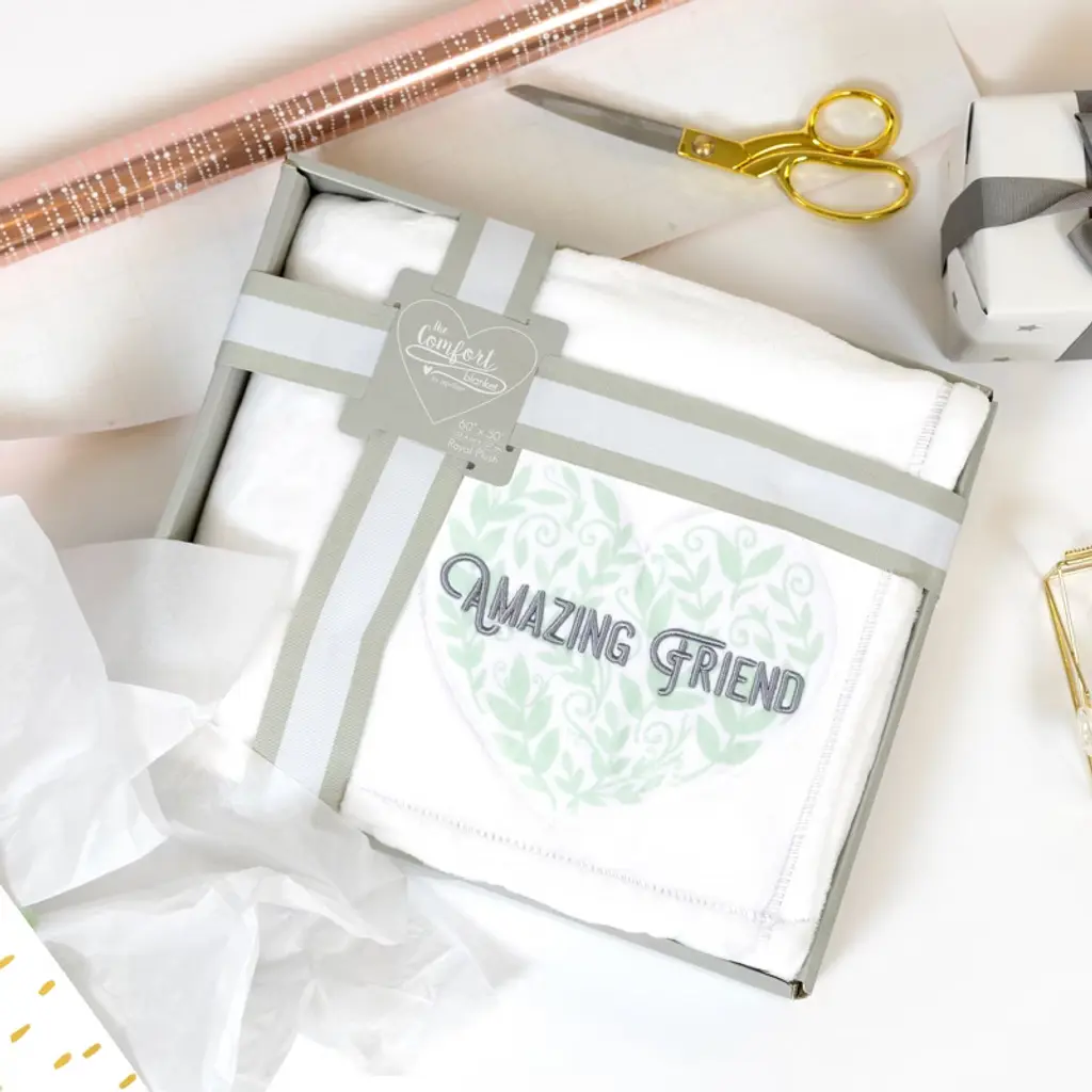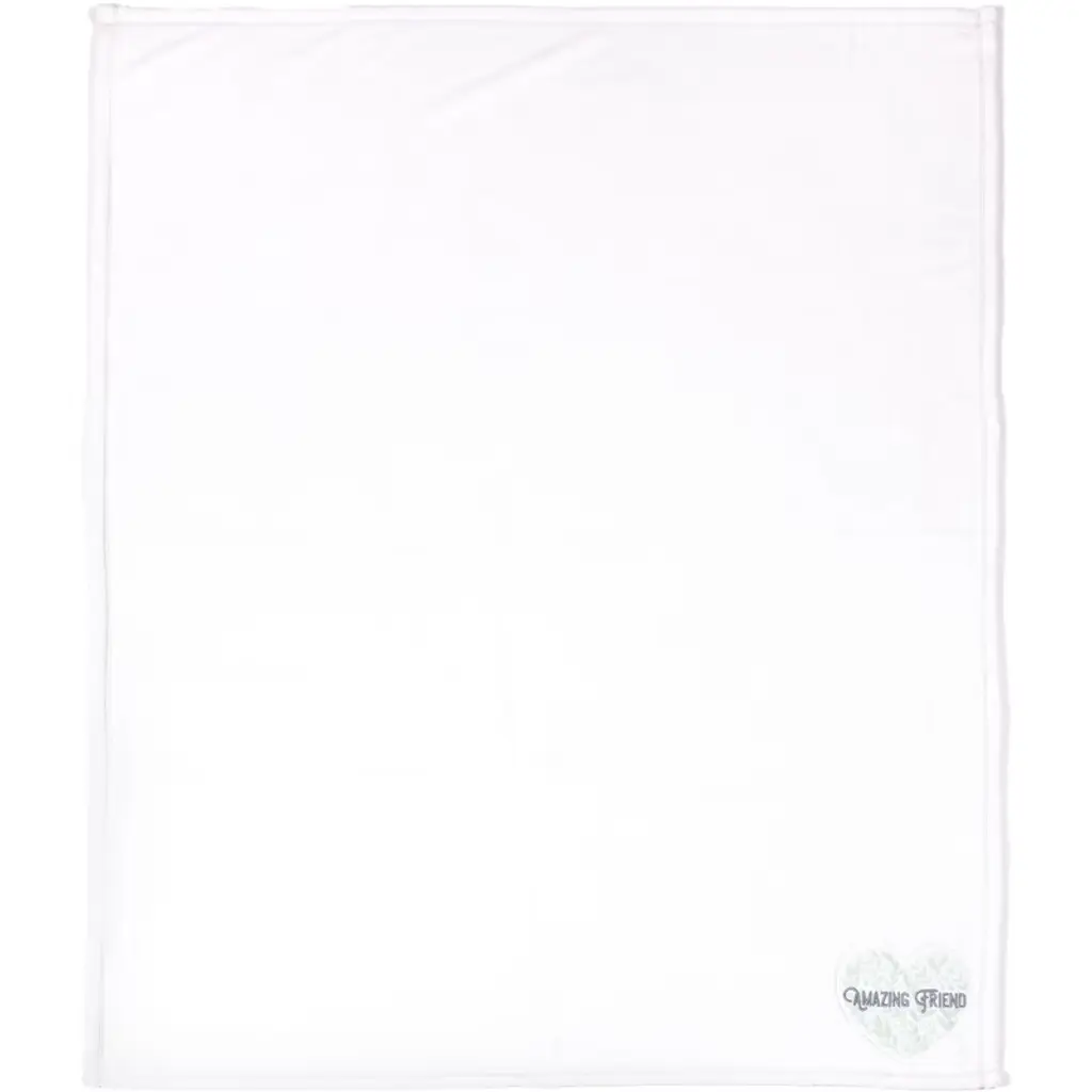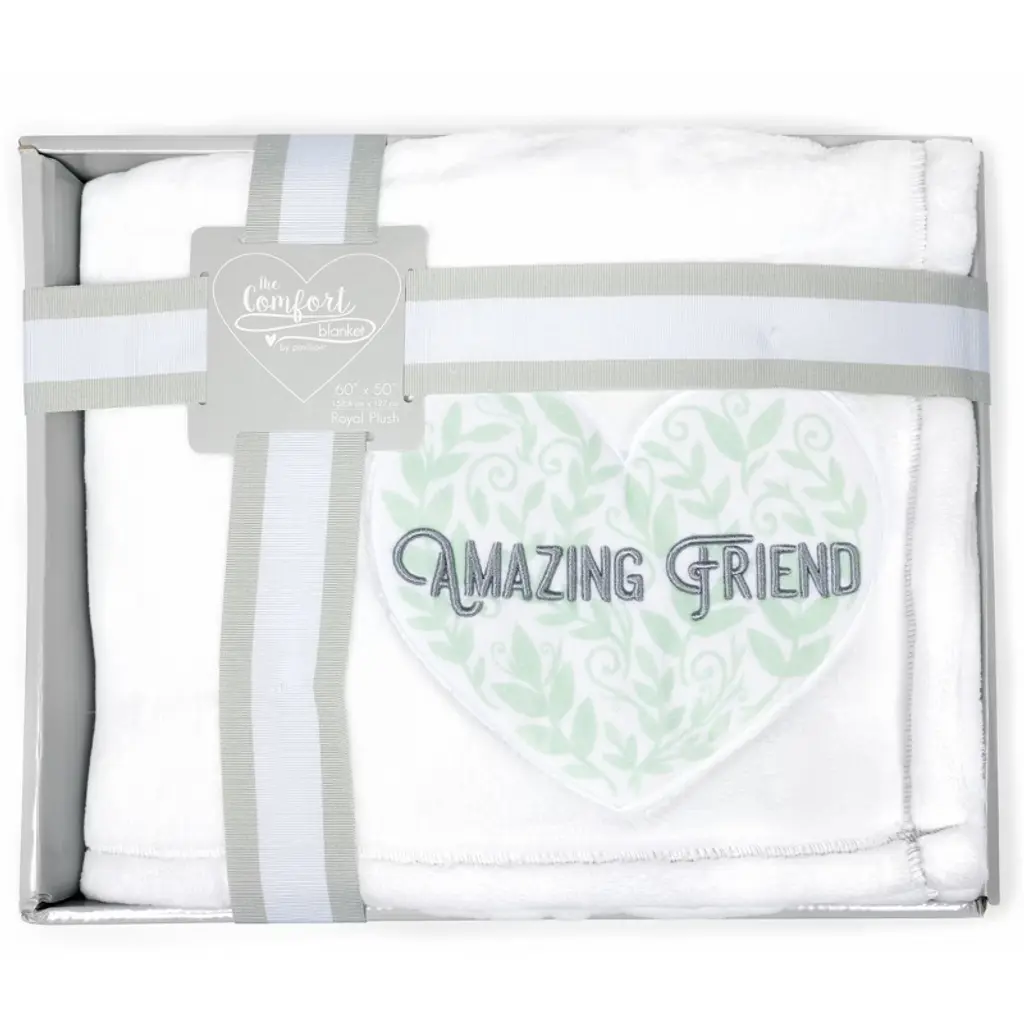 A 50" x 60" luxurious, neutral, cozy, soft bed or couch throw blanket is made from 100% polyester royal plush 320 GSM fabric with embroidered and printed detail. Beautiful gift packaging showcases the sewn-in patch with a beautiful gray striped ribbon outside on the sturdy tan box wrapped in a plastic polybag. The bottom right corner of the front of the white home décor blanket features an uplifting and comforting gray "Amazing Friend" embroidered sentiment with gray stitched edges on a white heart with a green vine-printed design embroidered edge patch. Machine wash cold on a gentle cycle with like colors. Do not bleach or iron. Tumble dry low. This is an excellent present for any best friend. Celebrate years of friendship and warmly embrace your Bestie or BFF even when you can't be by their side.