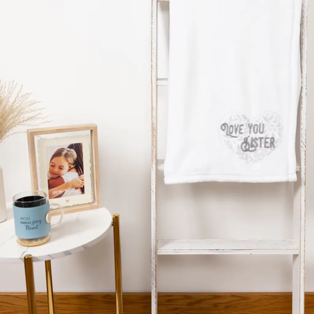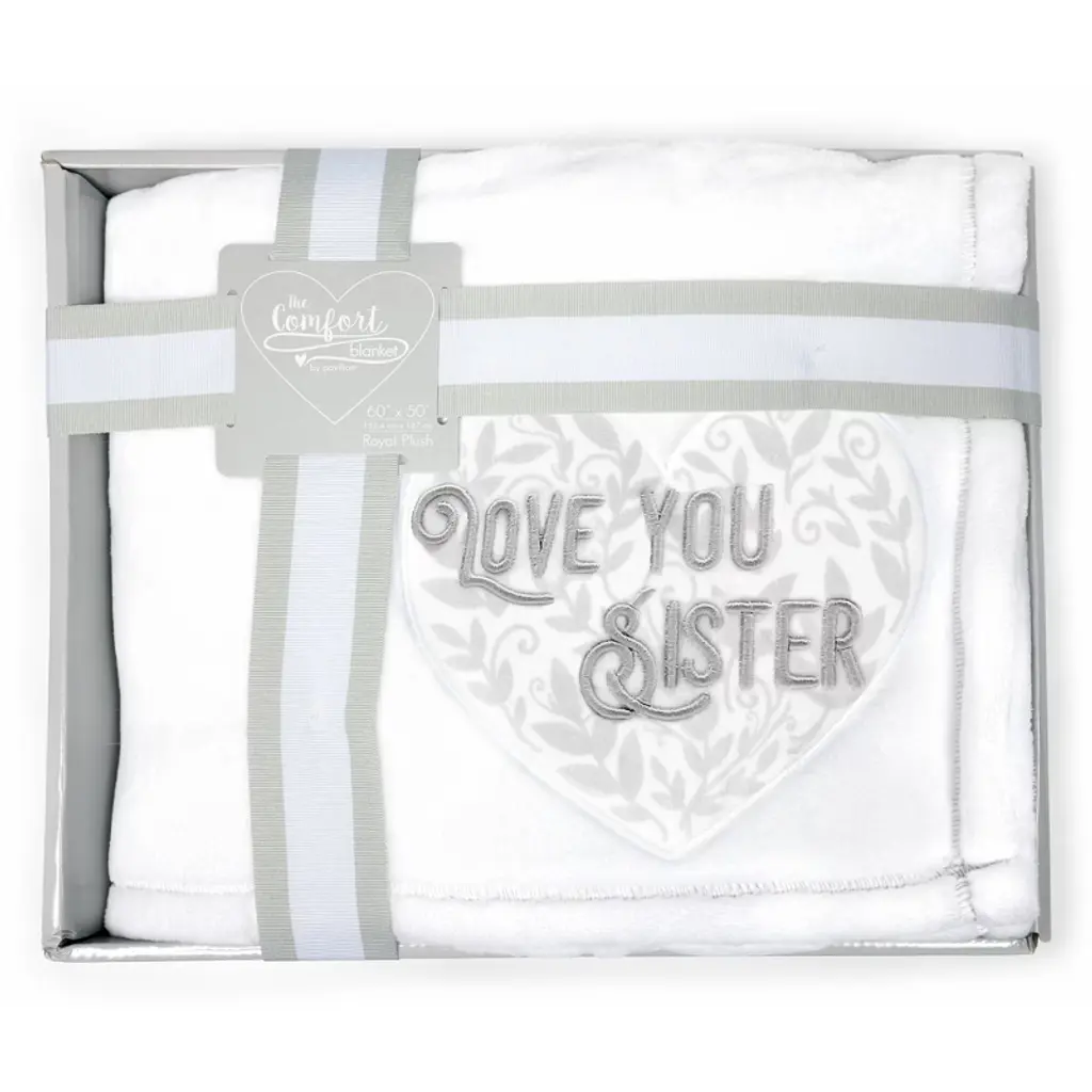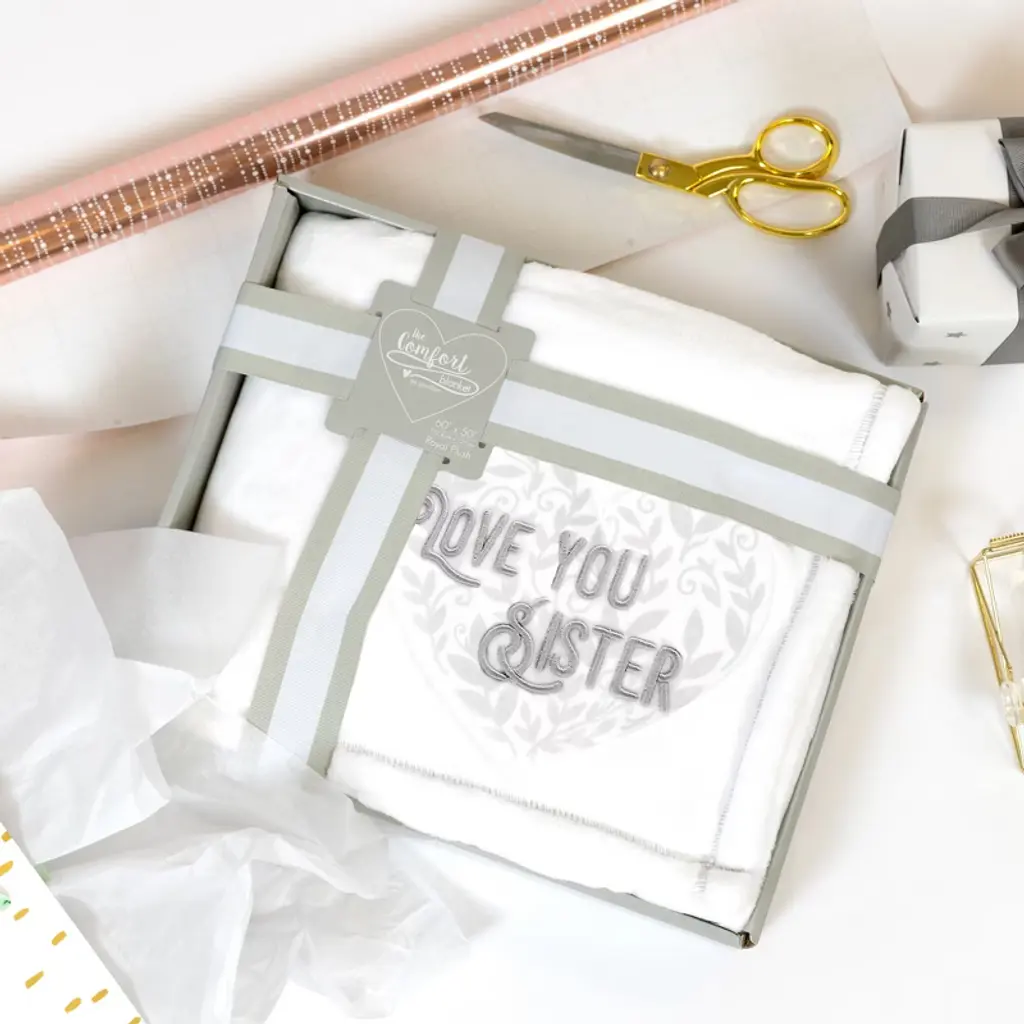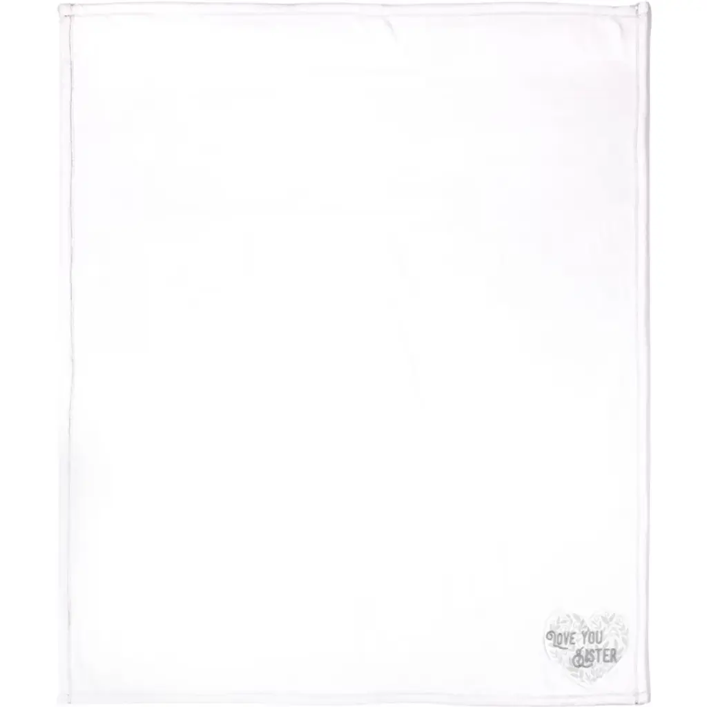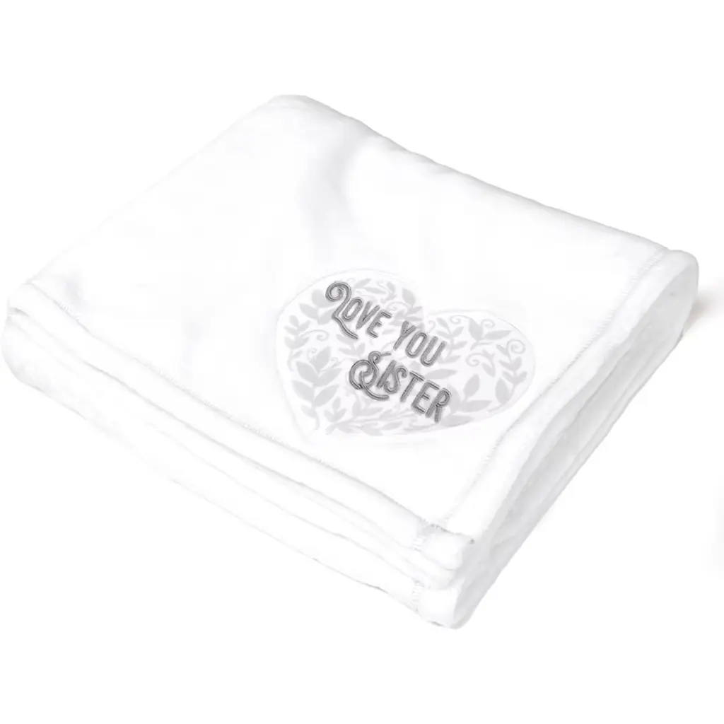 A 50" x 60" luxurious, neutral, cozy, soft bed or couch throw blanket is made from 100% polyester royal plush 320 GSM fabric with embroidered and printed detail. Beautiful gift packaging showcases the sewn-in patch with a beautiful gray striped ribbon outside on the sturdy tan box wrapped in a plastic polybag. The bottom right corner of the front of the white home décor blanket features an uplifting and comforting gray "Love You Sister" embroidered sentiment with gray stitched edges on a white heart with a gray vine-printed design embroidered edge patch. Machine wash cold on a gentle cycle with like colors. Do not bleach or iron. Tumble dry low. This is a beautiful present for your extraordinary sister, stepsister, sister-in-law, or adoptive sister who means the world to you. She'll feel your endless love and appreciation for all she does for you and your family—a unique gift from brother or sister to their sister. .