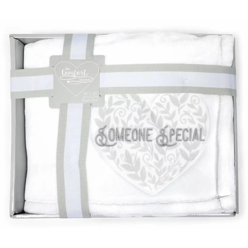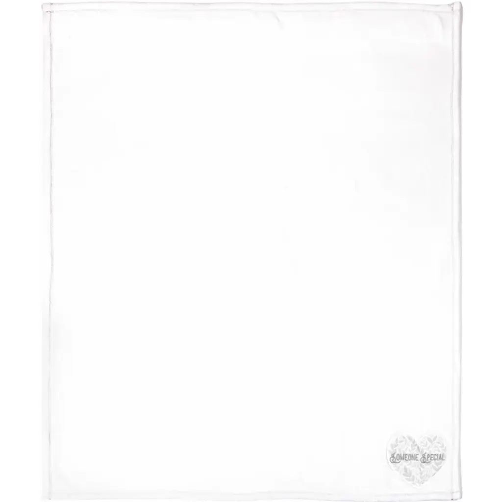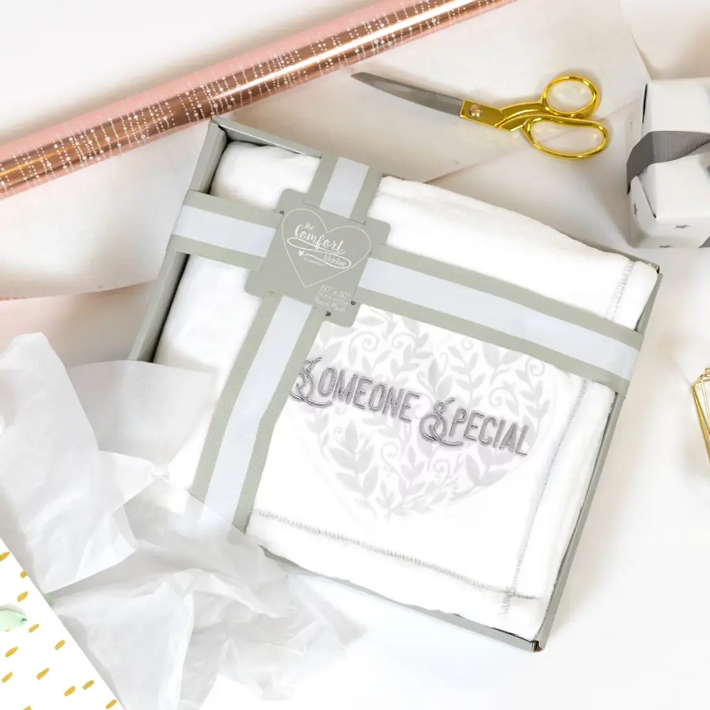 A 50" x 60" luxurious, neutral, cozy, soft bed or couch throw blanket is made from 100% polyester royal plush 320 GSM fabric with embroidered and printed detail. Beautiful gift packaging showcases the sewn-in patch with a beautiful gray striped ribbon outside on the sturdy tan box wrapped in a plastic polybag. The bottom right corner of the front of the white home décor blanket features an uplifting and comforting gray "Someone Special" embroidered sentiment with gray stitched edges on a white heart with a gray vine-printed design embroidered edge patch. Machine wash cold on a gentle cycle with like colors. Do not bleach or iron. Tumble dry low. This is an excellent gift for anyone who has blessed your life, including nurses, doctors, teachers, teaching assistants, survivors, therapists, or anyone special who brings light and encouragement to your life. They'll feel your endless love and appreciation for all they do for you.
