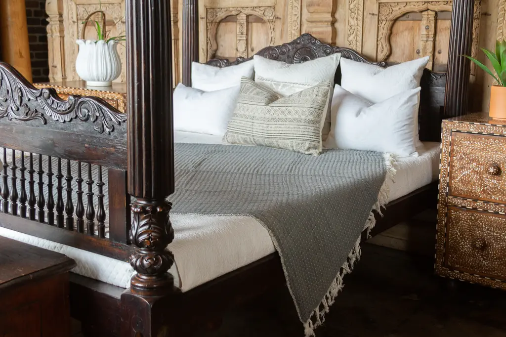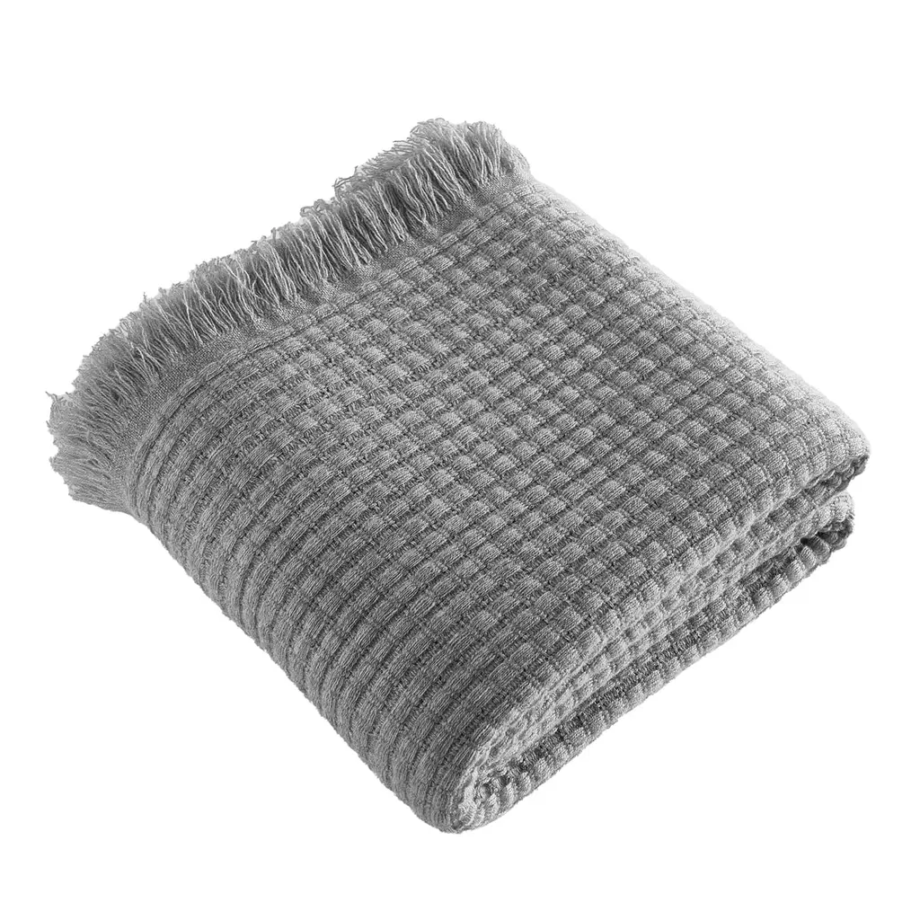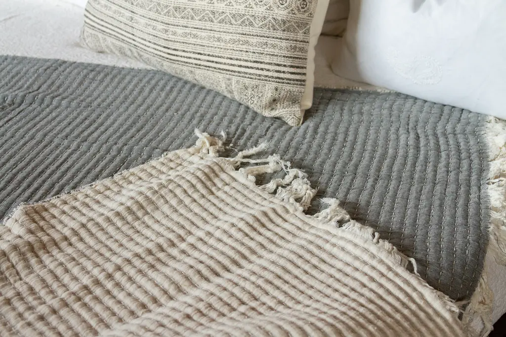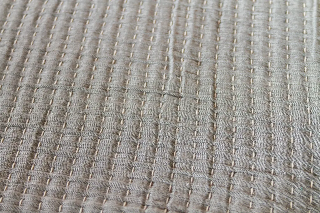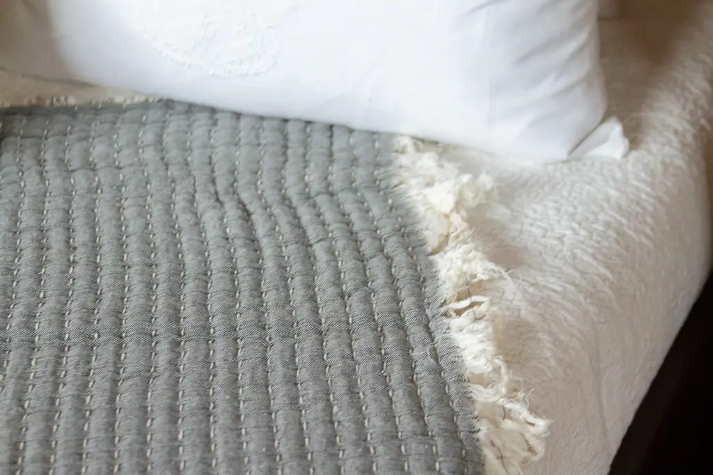 A handloomed cotton quilted throw. Soft in texture and accented with tassels on both ends. Beautiful reversible throw blanket hand woven with Kantha stitching by artisans in Northeast India.