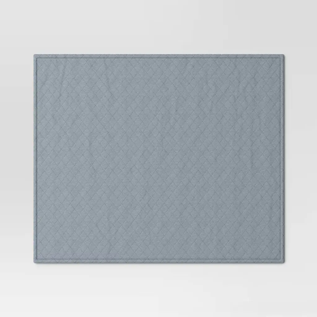 Snuggle up and unwind in the warmth of this Quilted Jersey Throw with Faux Shearling Reverse from Room Essentials™. Made from 100% recycled polyester jersey fabric on one side and plush faux shearling on the other, this quilted throw blanket feels soft and helps keep you nice and cozy. This decorative throw blanket pairs perfectly with various decor styles, featuring a dual-hue design with a quilted front in a heathered gray hue and white faux shearling on the reverse. Room Essentials™: Everyday Value