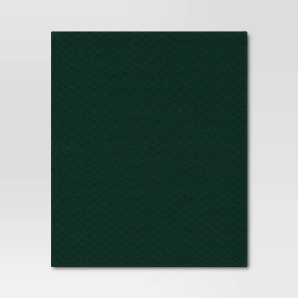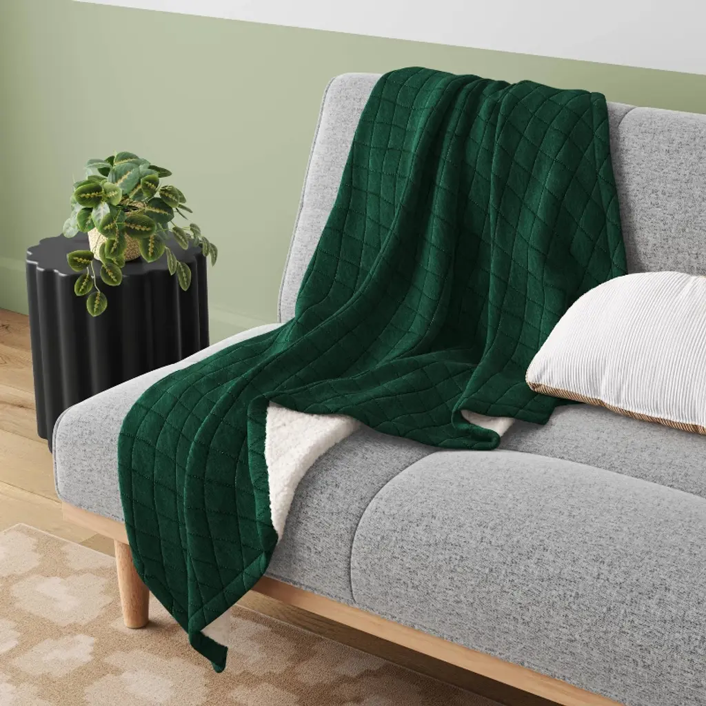 Add a touch of extra warmth to your favorite seat with this Quilted Jersey Throw with Faux Shearling Reverse from Room Essentials™. Made from 100% recycled polyester jersey fabric on one side and plush faux shearling on the other, this quilted throw blanket feels soft and helps keep you nice and cozy. Featuring a dual-hue design with a quilted front in a heathered green hue and white faux shearling on the reverse, this decorative throw blanket pairs perfectly with various decor styles. Room Essentials™: Everyday Value