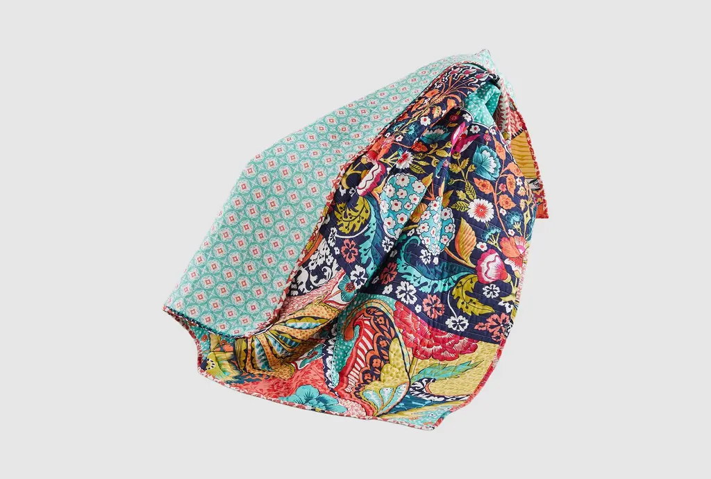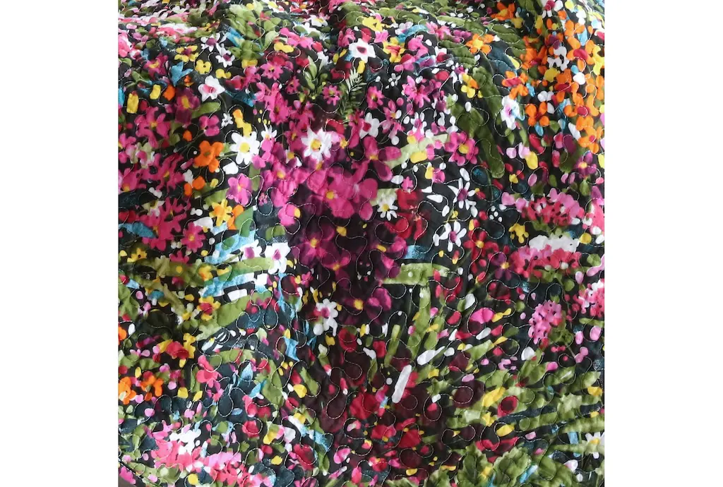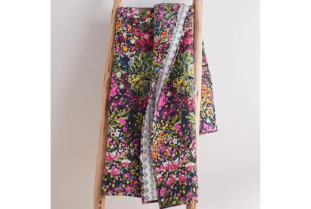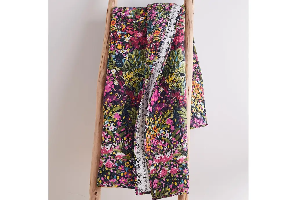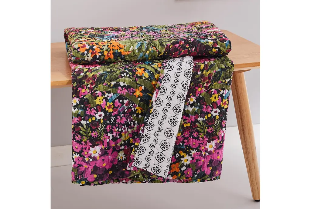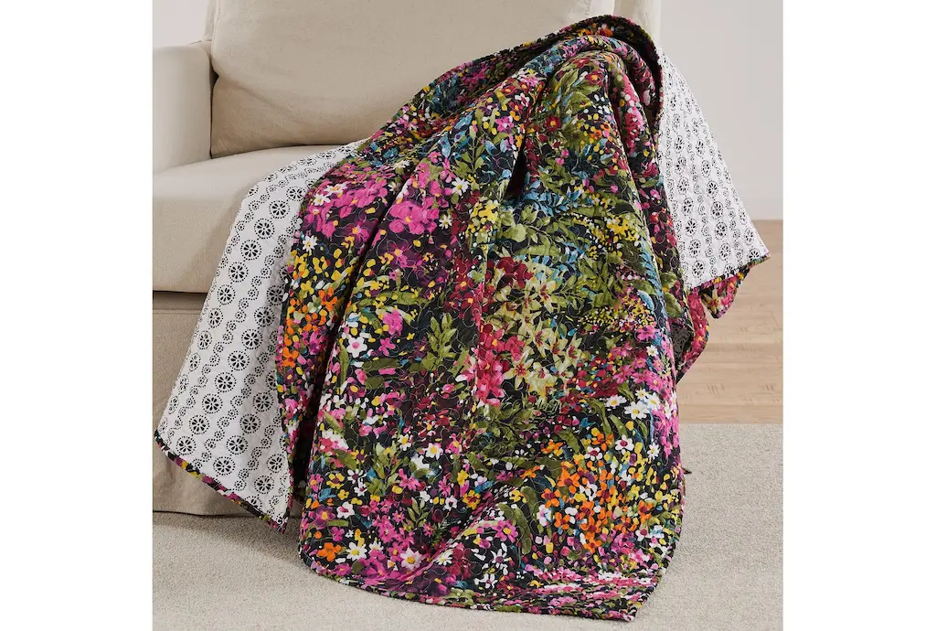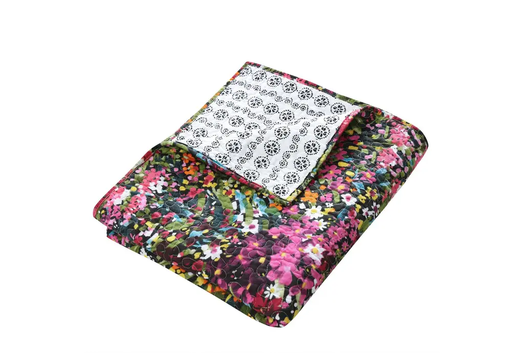 Quilted Reversible Cotton Throw Bright Floral Design To B&w Geometric