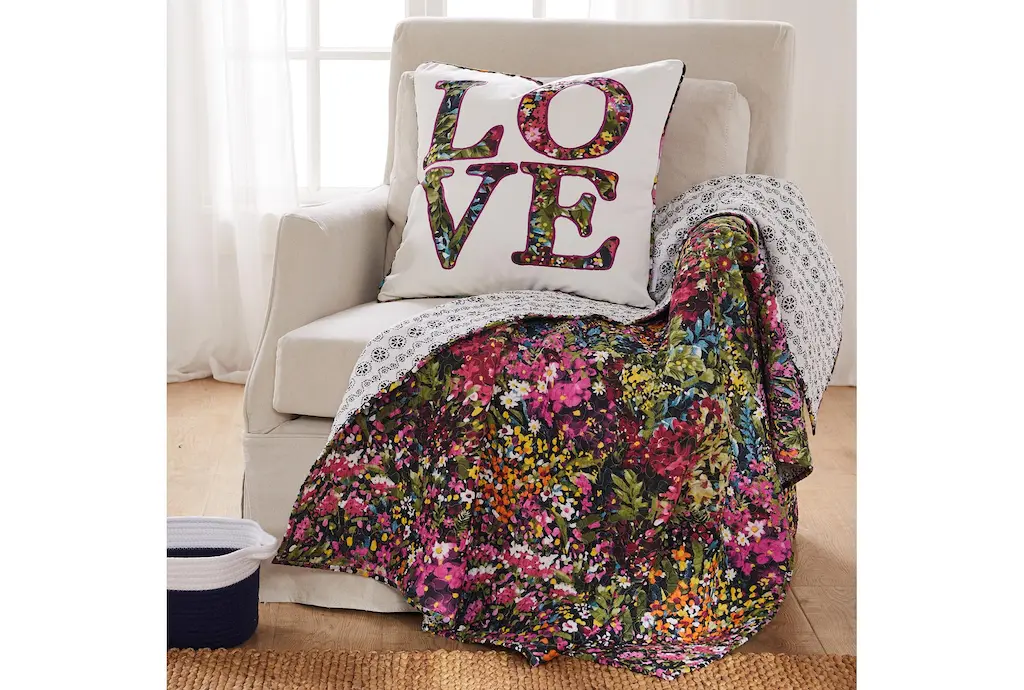 This Quilted Reversible Throw is a stunning addition to any farmhouse-style home, featuring a bright and bold floral design on one side and a chic black and white geometric pattern on the other. Made from soft and durable cotton, this throw is perfect for snuggling up on the couch or adding a pop of color to your bedding.