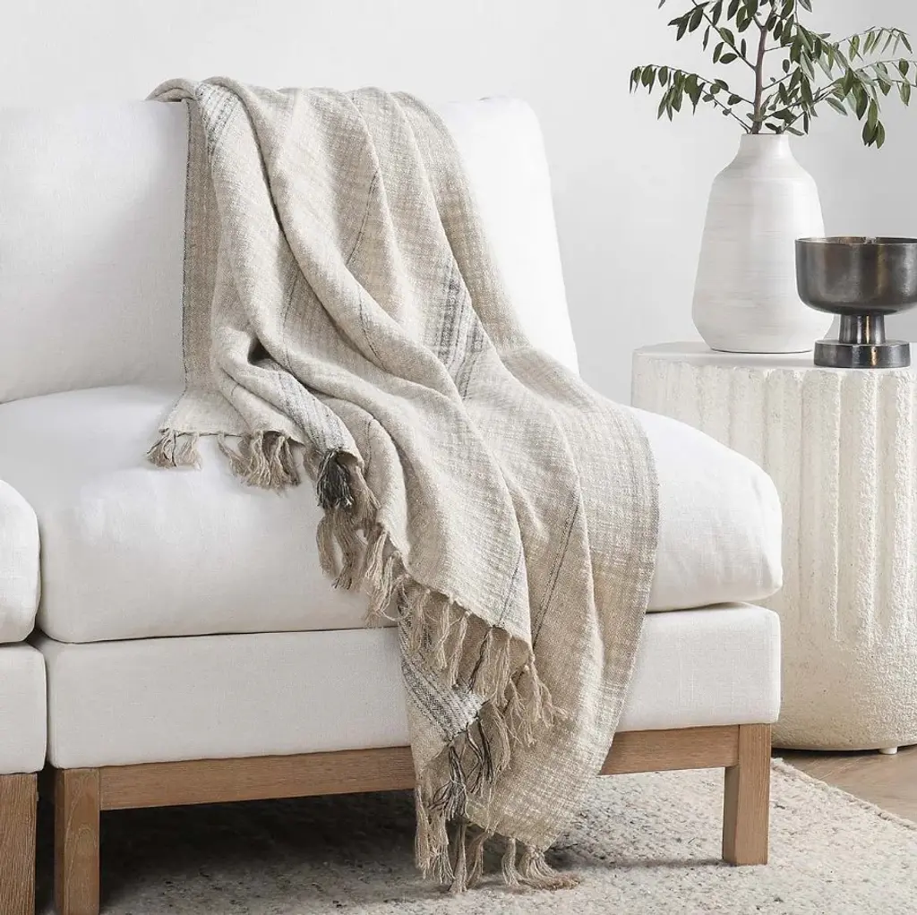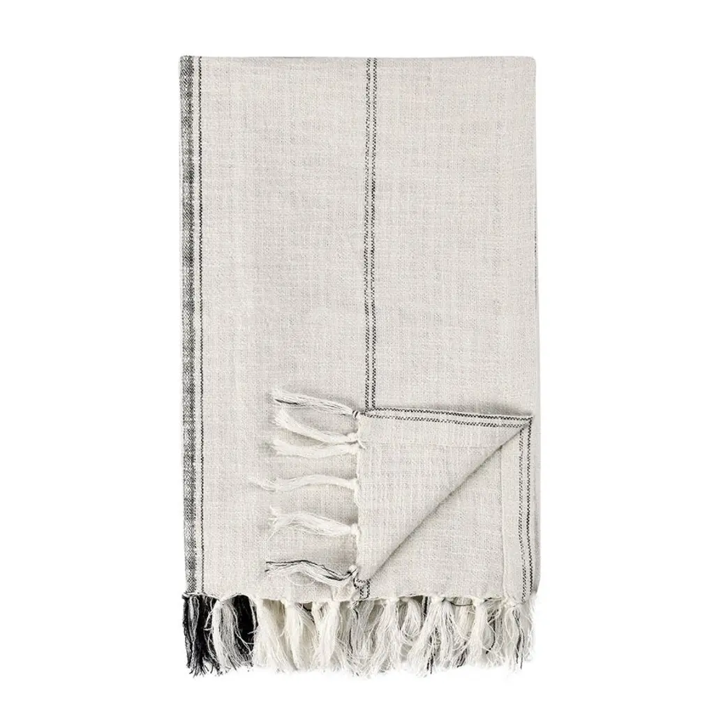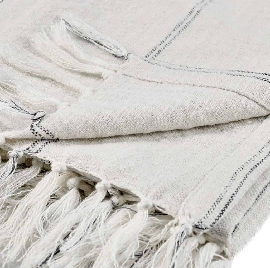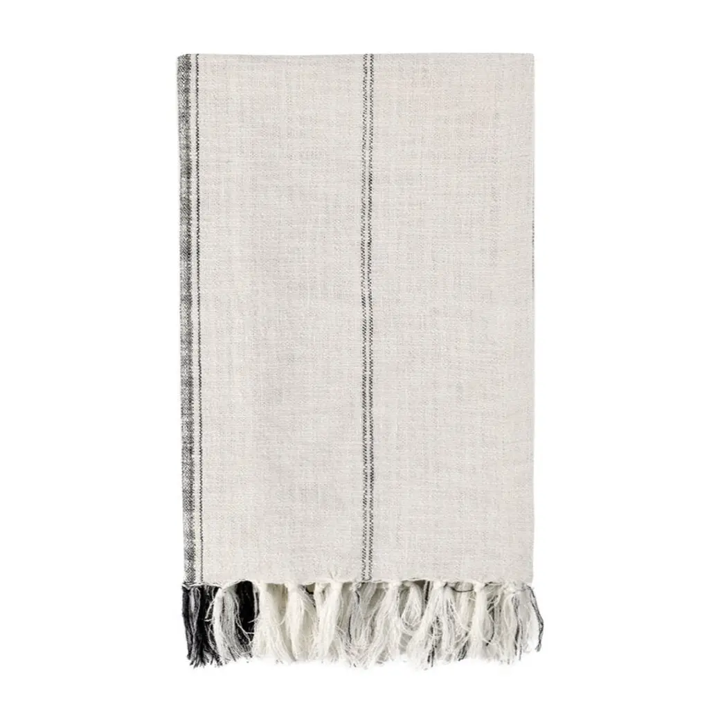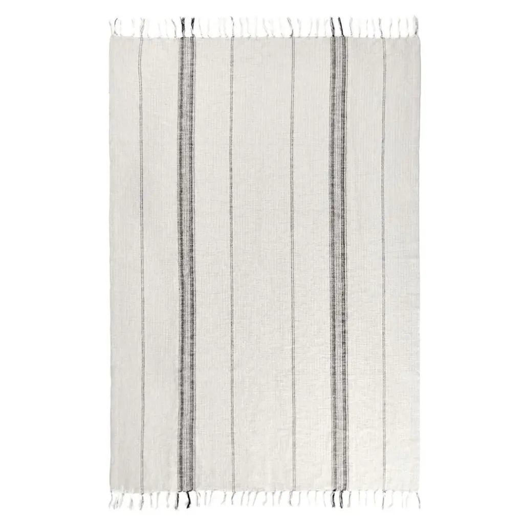 The Ria throw features a sophisticated woven stripe design and 2 self-knotted fringe ends, providing texture and a soft touch. Choose from two different color options: Natural/Black or Ivory/Gray.
