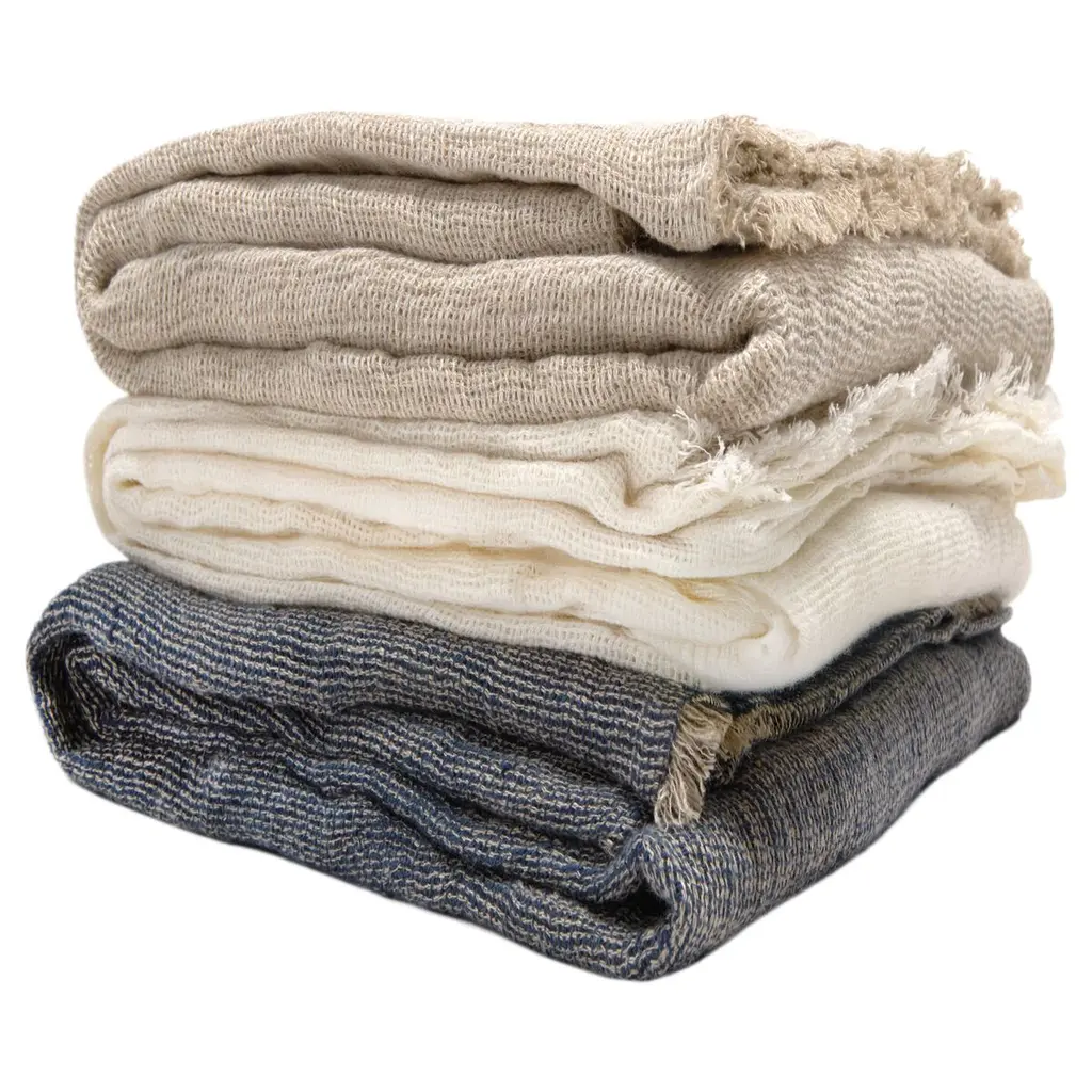 The River is a hand-loomed oversized linen throw. Featuring frayed edges, open weave texture, and 100% linen. 60" x 90"