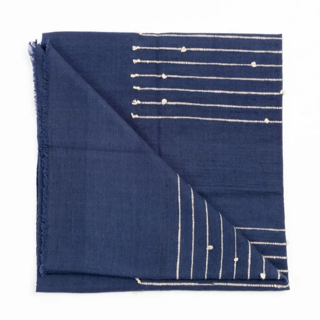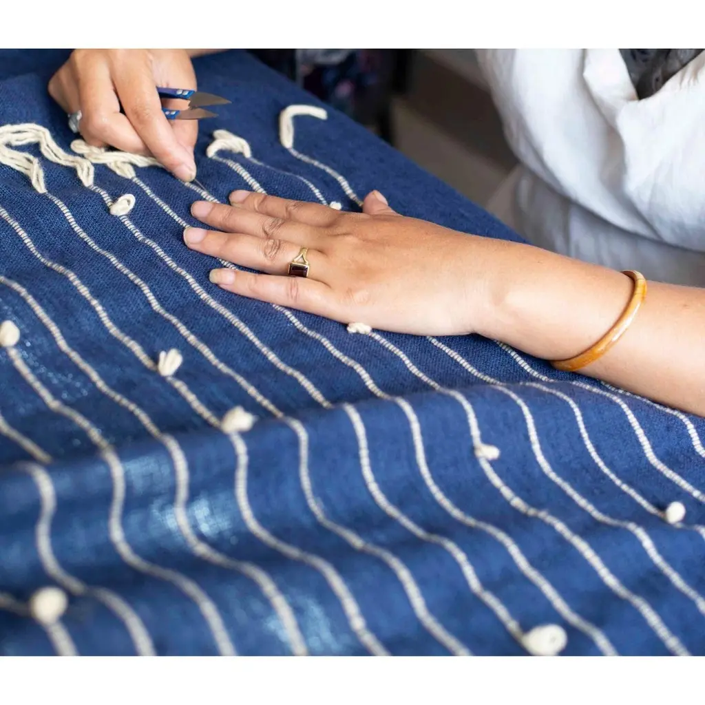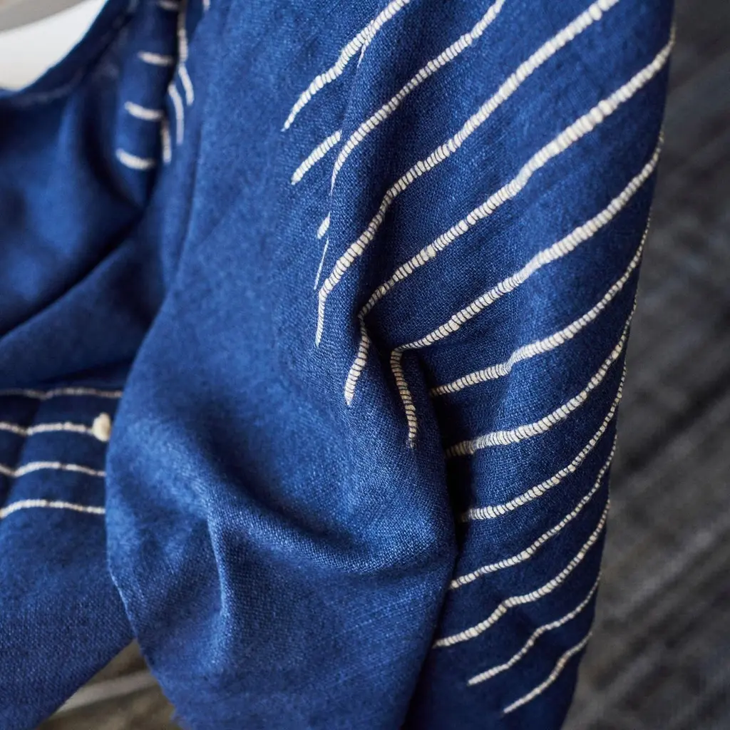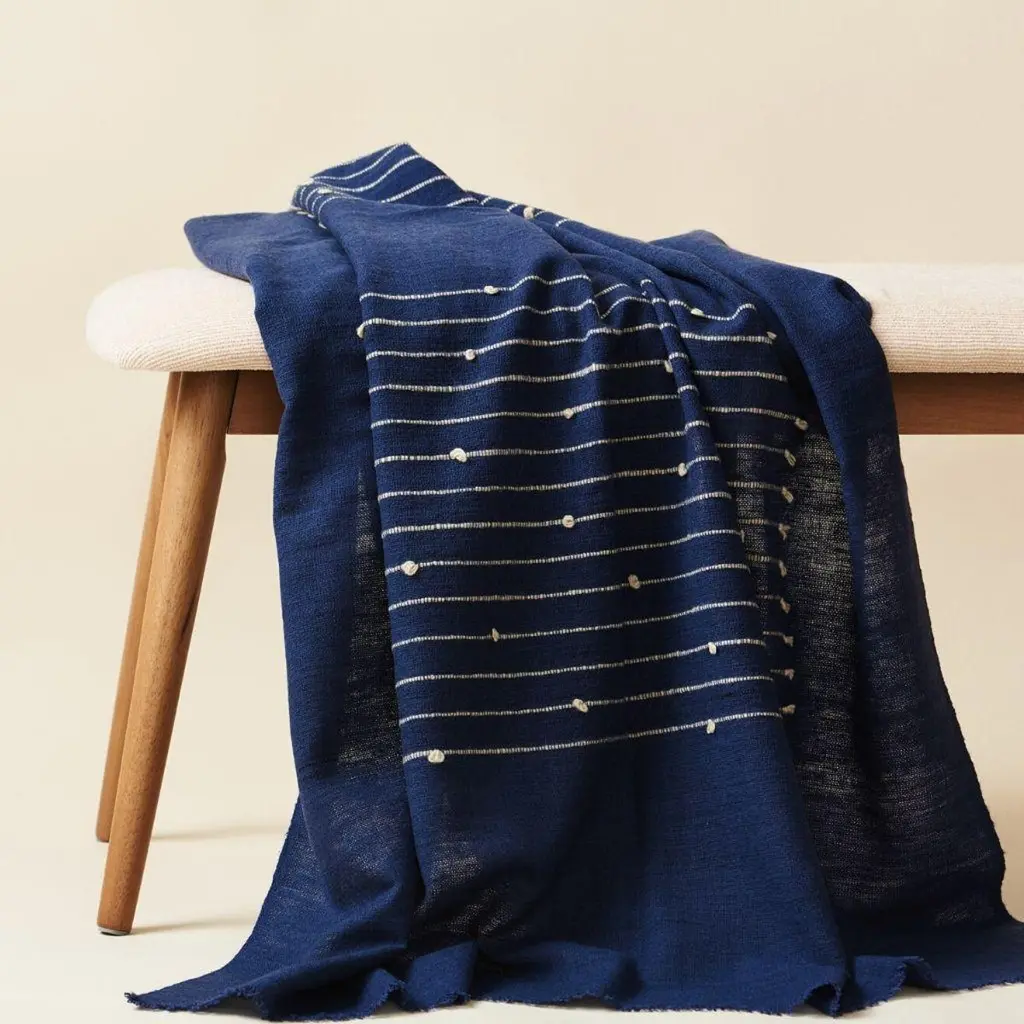 Custom design by Studio Variously, ROSEWOOD INDIGO merino throw / blanket is hand-woven by master weavers in Nepal and dyed entirely with eco-friendly dyes. A sustainable design brand based out of Michigan, Studio Variously exclusively collaborates with artisan communities to restore and revive ancient techniques by exploring custom modern designs in textile based products.This textile's design is made up of subtle textured stripes. Edges of each stripe pattern on the throw / blanket is reversible to arrange and use. Our textiles s are incredibly soft to touch and wear well over time. Requiring attention to detail and finishing, Rosewood Indigo luxuriously combines heritage value and high quality craftsmanship. For this piece, we are using only the highest quality of soft natural hand-spun merino yarn, which is later hand-dyed with certified eco-friendly Swiss dyes, free of toxic chemicals, as stated above. Our dyes are specifically engineered to promote the lifespan of each throw. As this luxurious textile is completely handmade from start to finish, each piece is unique. Classic in design, this timeless throw / blanket will complement interior spaces and also support artisan communities ethically.Size : 79" x 39" ( 200 cm x 100 cm ) Material : 100 % hand-spun merino.Colors : Indigo base with cream stripes. Origin : Ethically handwoven by master weavers in Nepal.Wash Care : Delicately dry clean only.