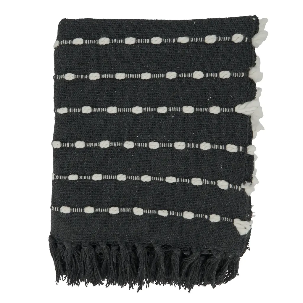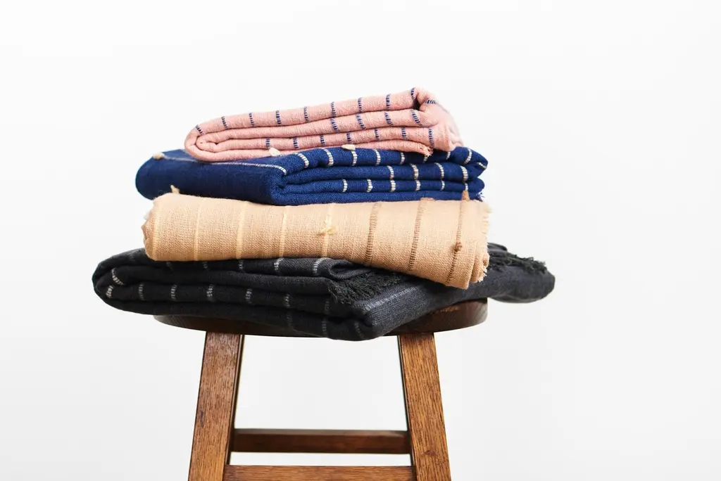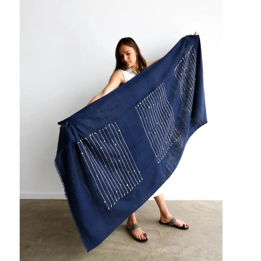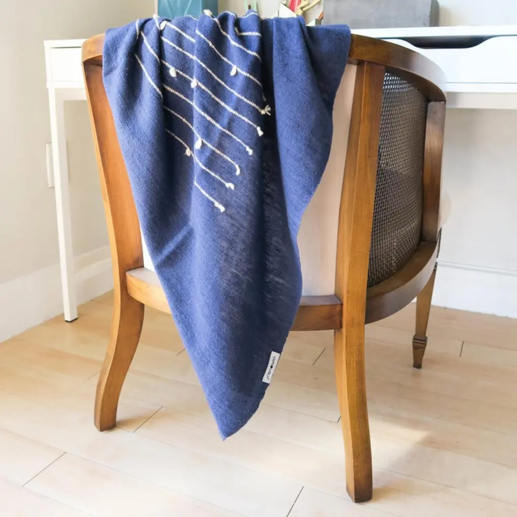 Custom design by Studio Variously, ROSEWOOD INDIGO merino throw / blanket is hand-woven by master weavers in Nepal and dyed entirely with eco-friendly dyes. A sustainable design brand based out of Michigan, Studio Variously exclusively collaborates with artisan communities to restore and revive ancient techniques by exploring custom modern designs in textile based products.This textile's design is made up of subtle textured stripes. Edges of each stripe pattern on the throw / blanket is reversible to arrange and use. Our textiles s are incredibly soft to touch and wear well over time. Requiring attention to detail and finishing, Rosewood Indigo luxuriously combines heritage value and high quality craftsmanship. For this piece, we are using only the highest quality of soft natural hand-spun merino yarn, which is later hand-dyed with certified eco-friendly Swiss dyes, free of toxic chemicals, as stated above. Our dyes are specifically engineered to promote the lifespan of each throw. As this luxurious textile is completely handmade from start to finish, each piece is unique. Classic in design, this timeless throw / blanket will complement interior spaces and also support artisan communities ethically.Size : 79" x 39" ( 200 cm x 100 cm ) Material : 100 % hand-spun merino.Colors : Indigo base with cream stripes. Origin : Ethically handwoven by master weavers in Nepal.Wash Care : Delicately dry clean only.