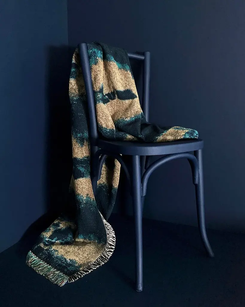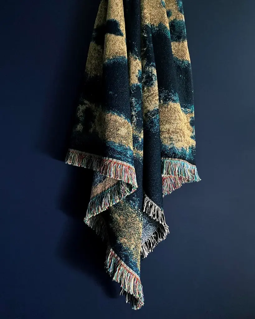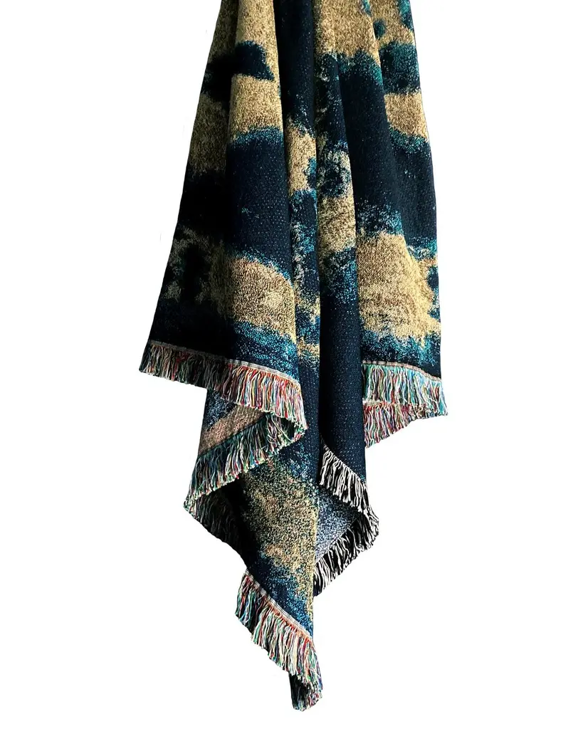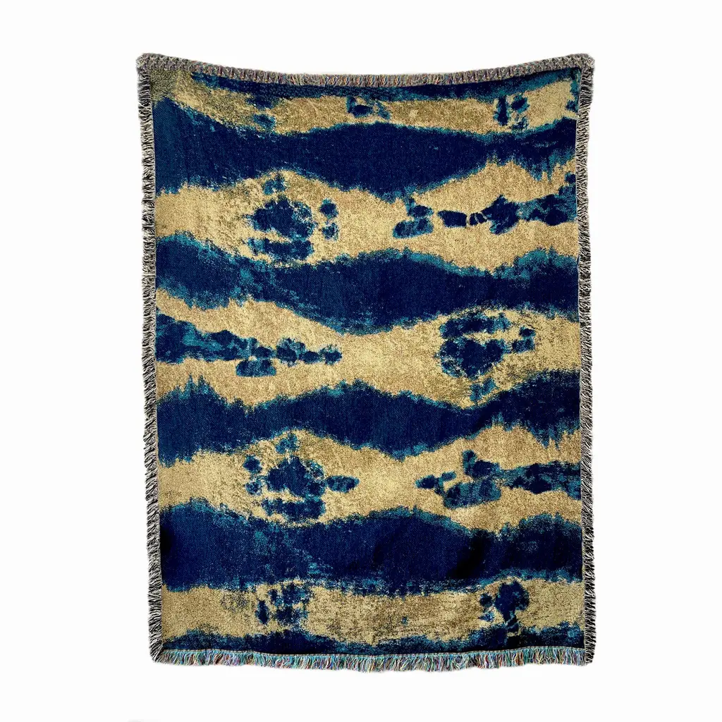 Gold yellow and indigo blue jacquard woven throw with fringed edges. Woven with recycled cotton on a jacquard loom, made in the US. Each throw measures 54 x 72 inches. This jacquard woven throw is inspired by our hand dyed velvet pillows. The shapes and designs of our hand dyed pieces were reworked on a larger scale to achieve a beautiful balance of color and pattern in woven form. Sustainably woven in the US with OEKO-TEX STANDARD 100, with a blend of cotton and recycled cotton. Hand wash or machine wash cold on a delicate cycle. Line dry or machine dry on a cool cycle only.