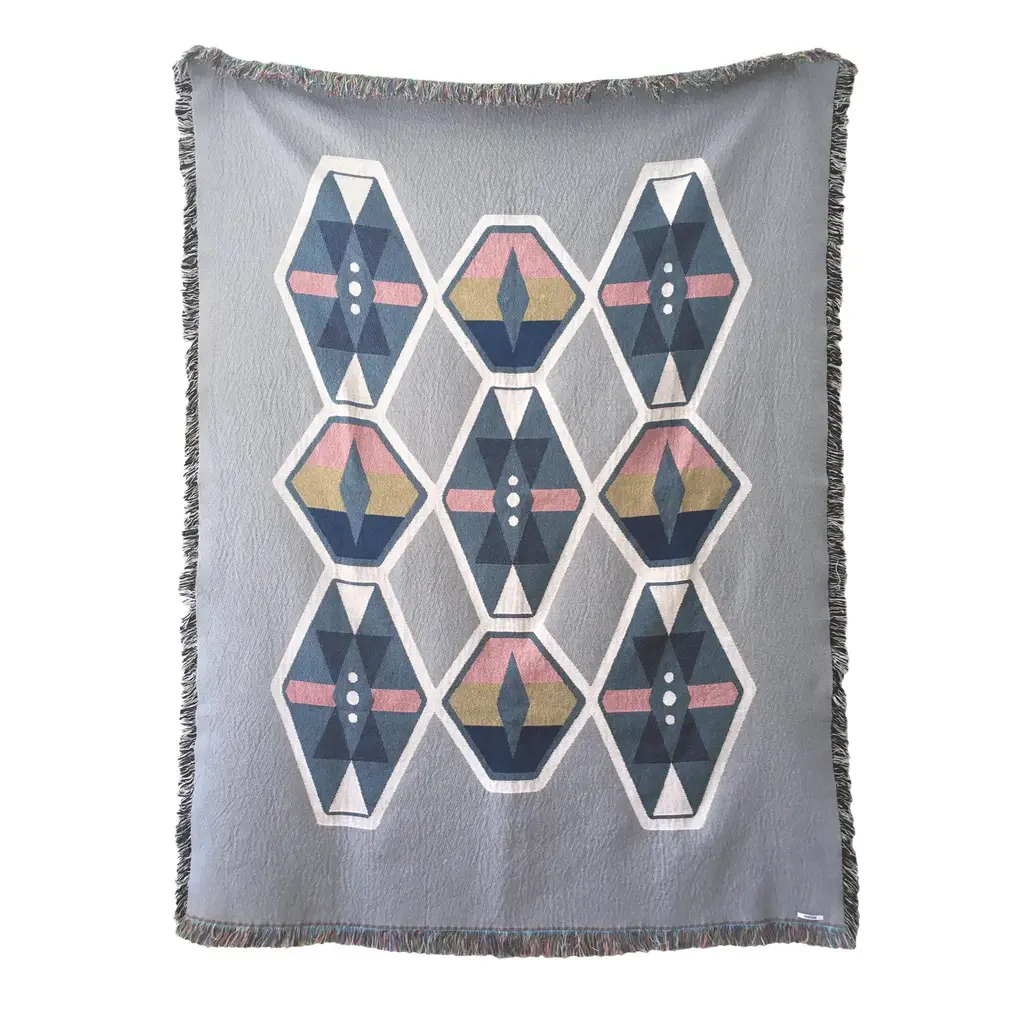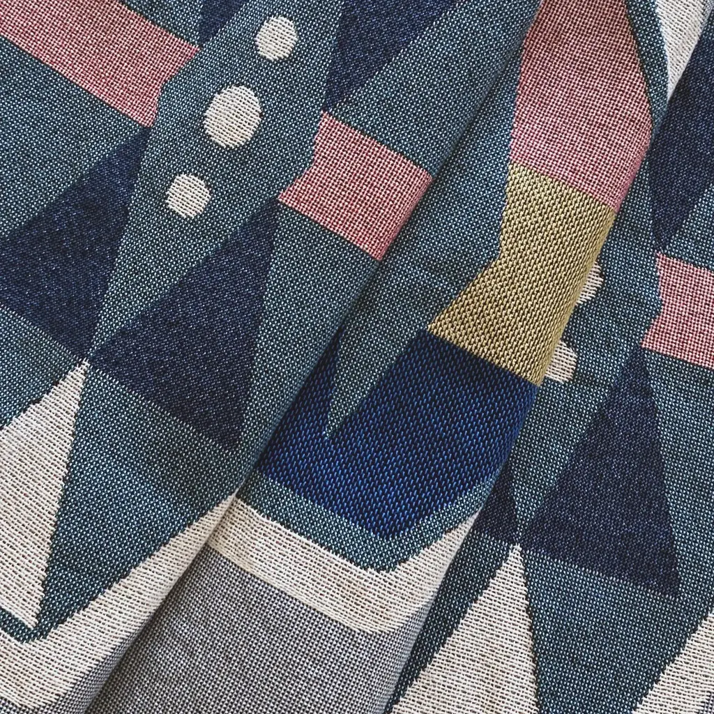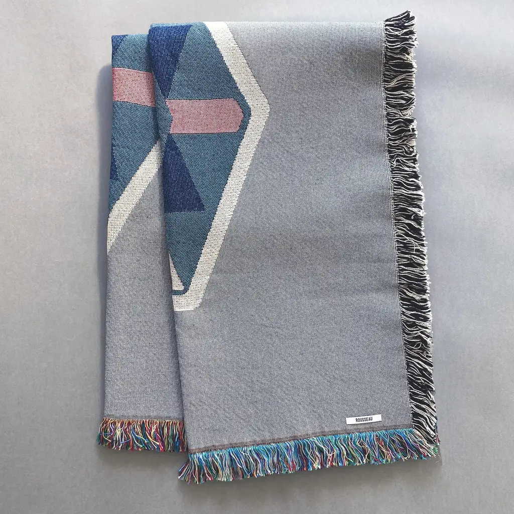 ROUSSEAU is a bespoke interiors brand based in New York City. Each piece is custom produced in small batches. Fog gray geo woven throw with fringe edge. Woven with recycled cotton on a jacquard loom, made in the US. Each throw measures 54 x 72 inches. The geometric patterned throw is inspired by a hand embroidered panel created by the designer. This throw blanket pairs beautifully with the indigo velvet pillows. Hand wash or machine wash cold on a delicate cycle. Line dry or machine dry on a cool cycle only.