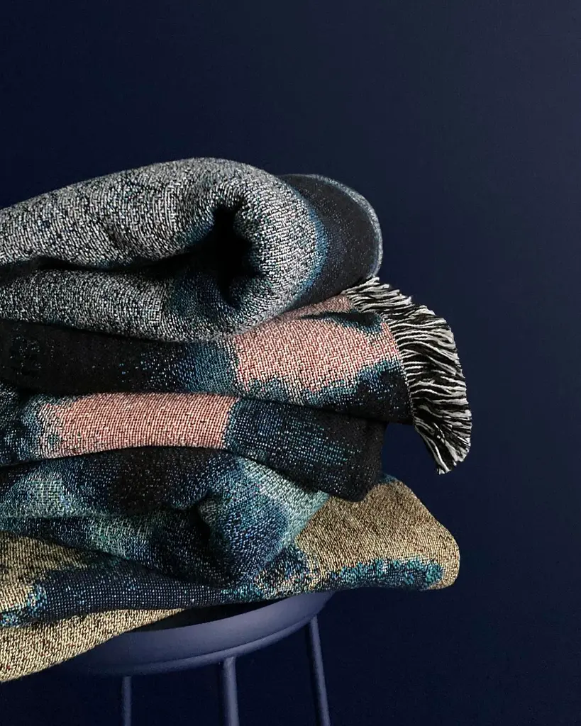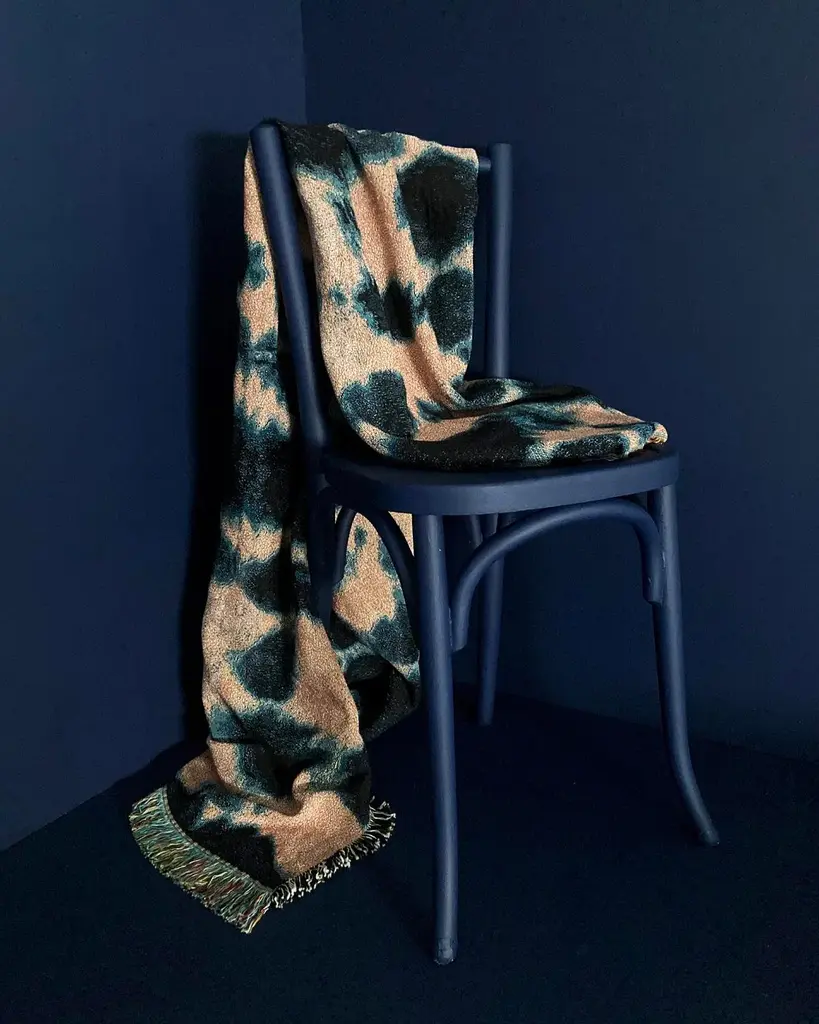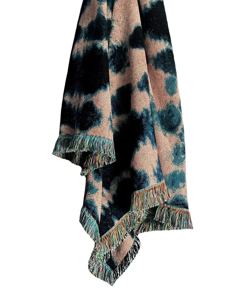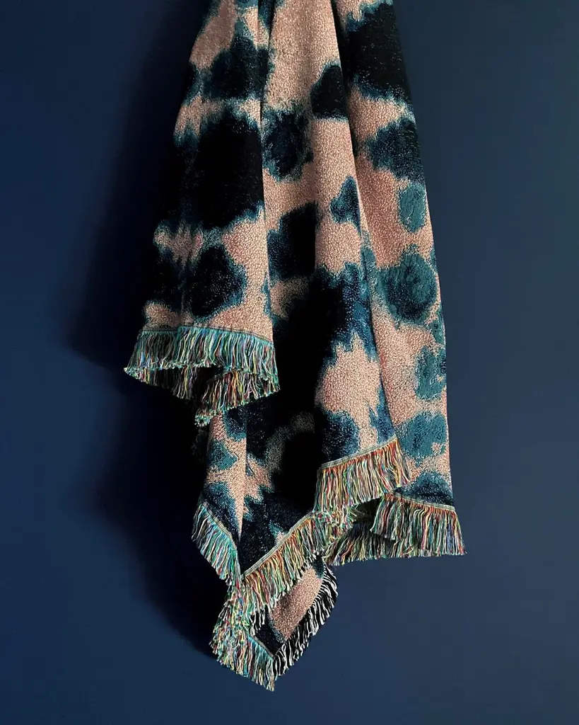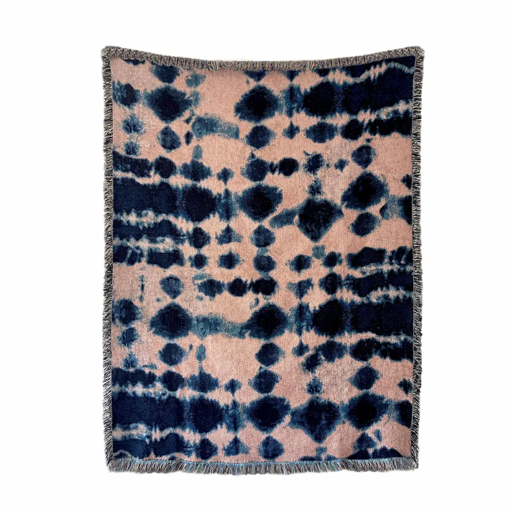 Rose pink and indigo blue jacquard woven throw with fringed edges. Woven with recycled cotton on a jacquard loom, made in the US. Each throw measures 54 x 72 inches. This jacquard woven throw is inspired by our hand dyed velvet pillows. The shapes and designs of our hand dyed pieces were reworked on a larger scale to achieve a beautiful balance of color and pattern in woven form. Sustainably woven in the US with OEKO-TEX STANDARD 100, with a blend of cotton and recycled cotton. Hand wash or machine wash cold on a delicate cycle. Line dry or machine dry on a cool cycle only.