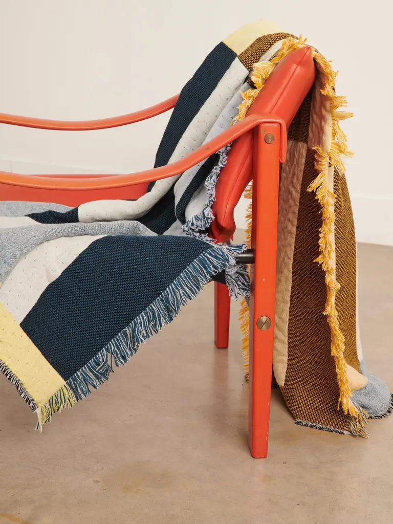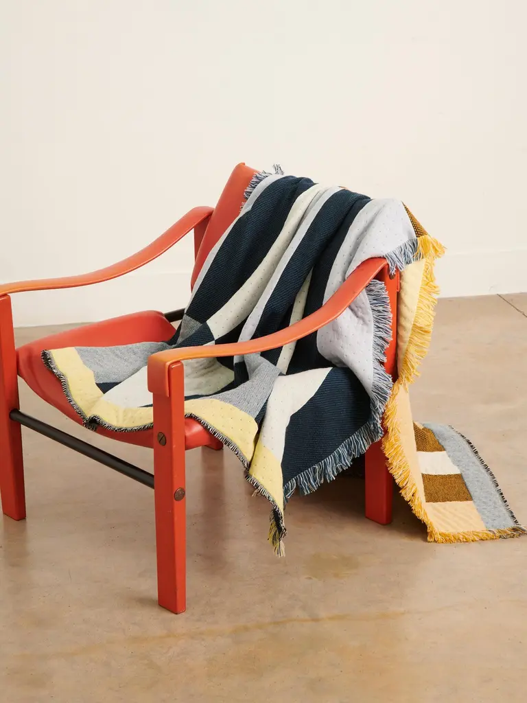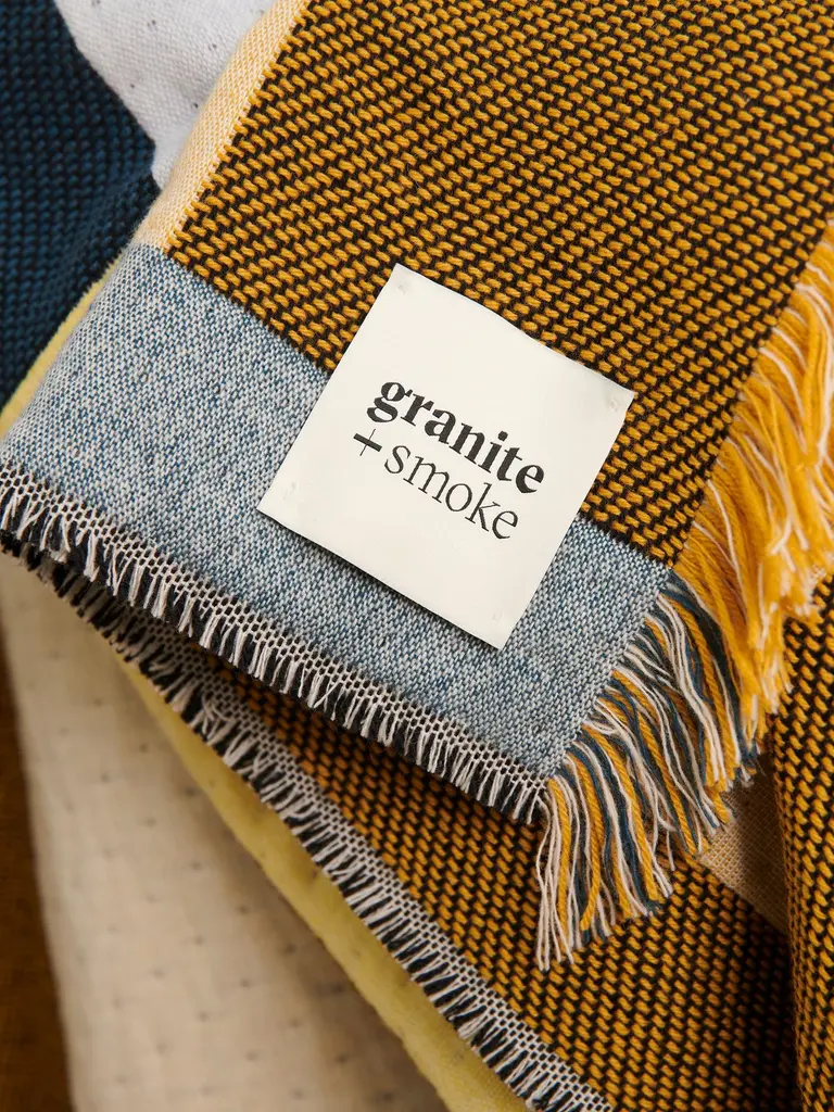 'Dash' double sided blanket woven from cashmere + lambswool in teal, yellow + white by Granite + Smoke.Our cashmere & lambswool blankets are made by expert craftsmen in a historical weaving mill dating back to 1866 in Scotland. Woven on Jacquard looms they are double sided, a mid weight throw made from ethically and sustainably sourced cashmere + lambswool. The bold, graphic patterns are inspired by London's brutalist architecture and modernist colours.Woven in Scotland using the finest sustainably sourced cashmere & lambswool. We work with specialist weavers who combine traditional weaving & finishing with cutting edge production and are experts in historical weaving and hand finishing. Our merino wool and cashmere is sustainably sourced, traceable and certified by Sustainawool. It is mulesing free, 100% natural, renewable and biodegradable.Material 10% Cashmere + 90% LambswoolMade in Scotland in limited runs.