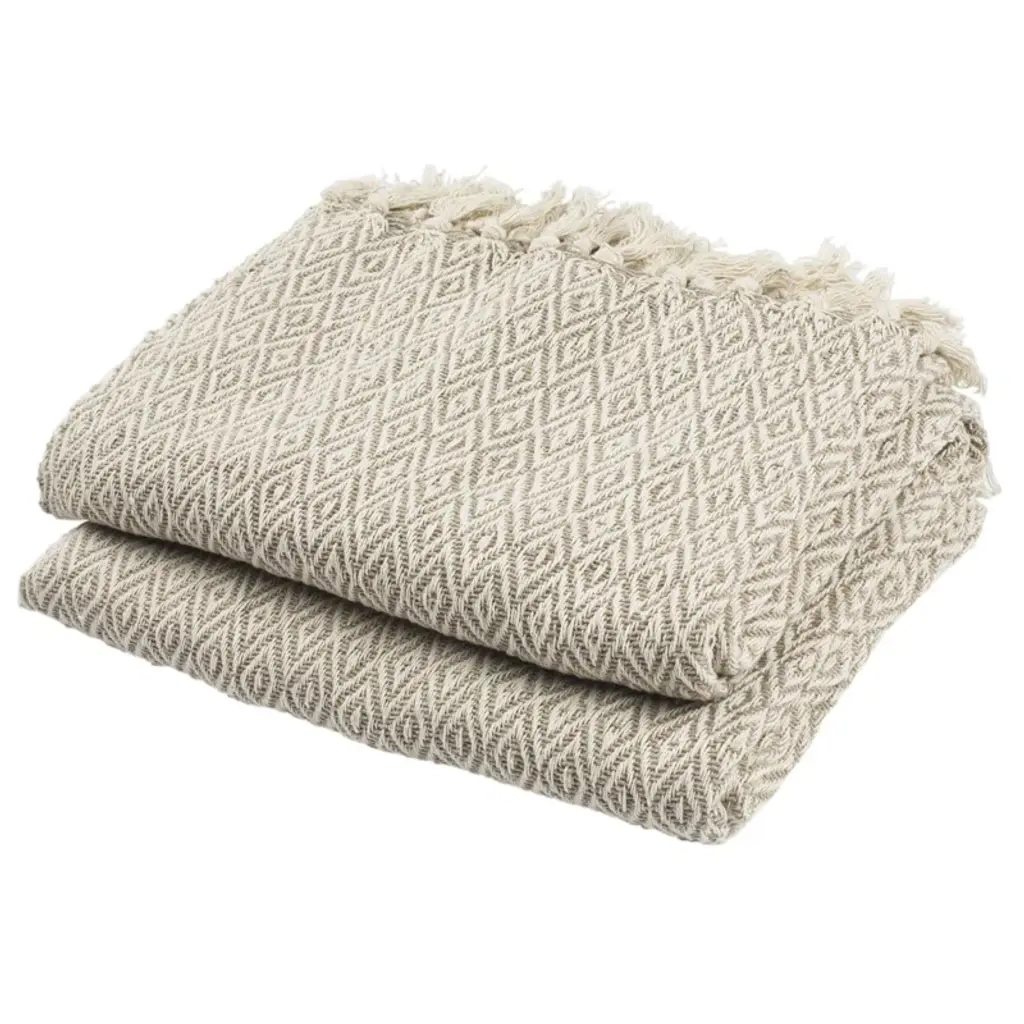 This throw blanket has an ikat-inspired diamond design throughout its elegant, neutral-toned face. It's woven in India from 100% cotton and features a white and gray color palette that's easy to pair with just about anything. Knotted tassel fringe on the edge adds a playful, textural touch we love. To help preserve the delicate weave, we recommend dry cleaning this blanket if it ever needs a refresh.