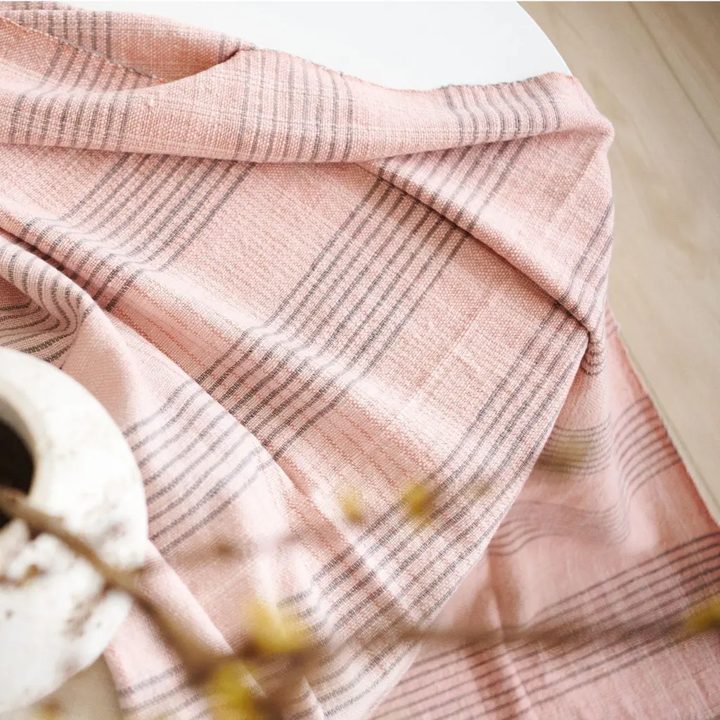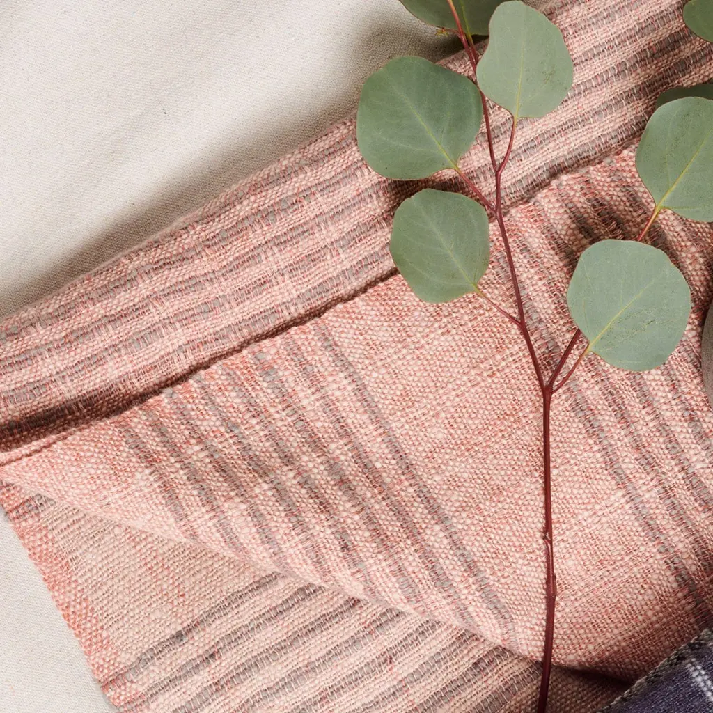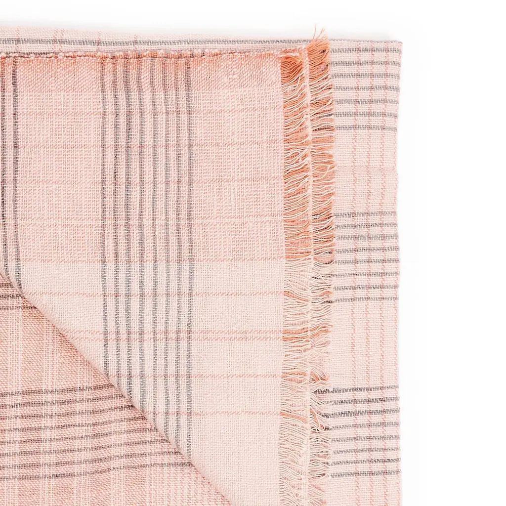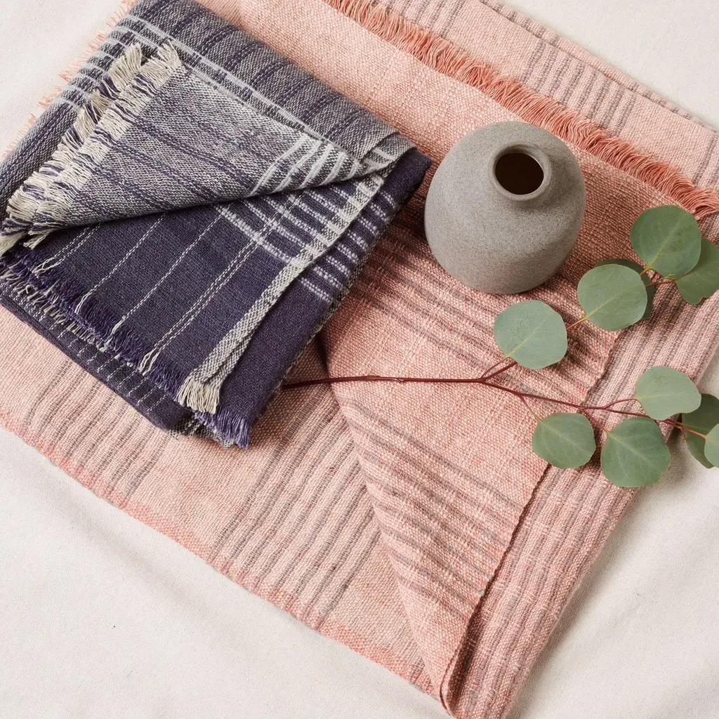 Silica Rose Throw is a contemporary take on combining stripes & checks pattern in a serene color palette of dusty rose salmon and grays. Fine detail of hand weaving is done meticulously on a handwoven textile. Each piece is 100% handmade making it a unique sustainable throw which is both classic and minimal modern in its appeal.Silica Rose throw is soft to touch and wears well over time. Requiring attention to detail and finishing, this throw luxuriously combines heritage value. high quality craftsmanship & it is reversible to arrange and use. Fringes are kept short for a modern look.For this textile, we are using only the highest quality of 100% pure merino from Nepal and linen from Belgium. Eco friendly dyes Swiss dyes are specifically engineered to promote the lifespan of each throw. As this luxurious piece is completely handmade from start to finish, each piece is unique.Classic in design, Silica Rose is a timeless throw / blanket will complement your personal or living spaces, is a thoughtful gift and also supports artisan communities ethically.Throw Size: 110 cm X 210 cm Material: 100% soft merino from Nepal , 100% pure linen from Belgium.Colors: Dusty rose, gray , salmon hues.Artisan base: Ethically & responsibly handwoven by artisans in Nepal.Wash care: Gently hand wash using gentle detergents. Hang dry in cool shaded place or delicately dry clean only.What Makes Your Purchase Sustainable ?Eco friendly dyes free of toxic chemicals used.Support employment of women artisans.100% handmade ethical manufacturing process by artisans.Uses only 100% natural responsibly sourced materials.Small batch production ensures higher quality & less wastage.