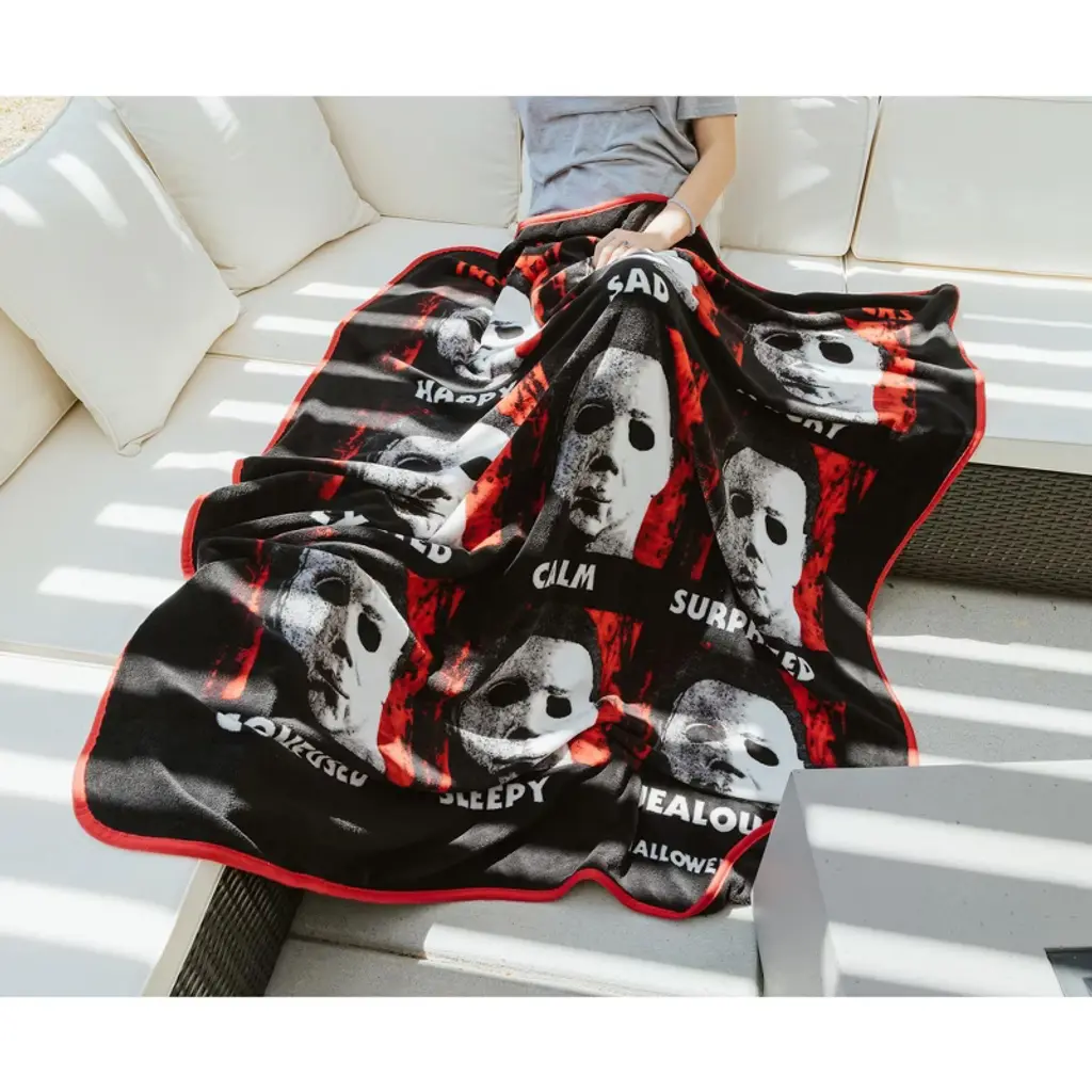 Wrap yourself in spine-tingling comfort with this Halloween II: The Many Faces of Michael Myers Raschel Throw Blanket, a delightfully dark and ironic tribute to one of horror’s most iconic killers. Measuring approximately 45 x 60 inches, this plush throw features a chillingly hilarious collage of Michael Myers’ many “expressions,” including Happy, Sad, Angry, Excited, Calm, Surprised, Confused, Sleepy, and Jealous. The twist? Every face is exactly the same: the blank, emotionless, and utterly terrifying mask that’s haunted dreams since 1978. Crafted from ultra-soft 100% polyester fiber, this raschel throw delivers cozy comfort perfect for horror fans, movie marathons, Halloween parties, or simply surviving another cold October night in Haddonfield. Whether you’re binging the Halloween film franchise or need something to hide behind during the scary parts, this blanket offers warmth with a wicked sense of humor.