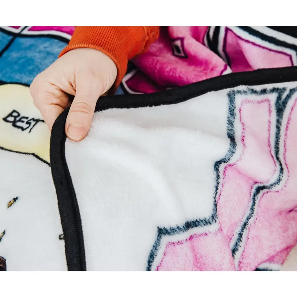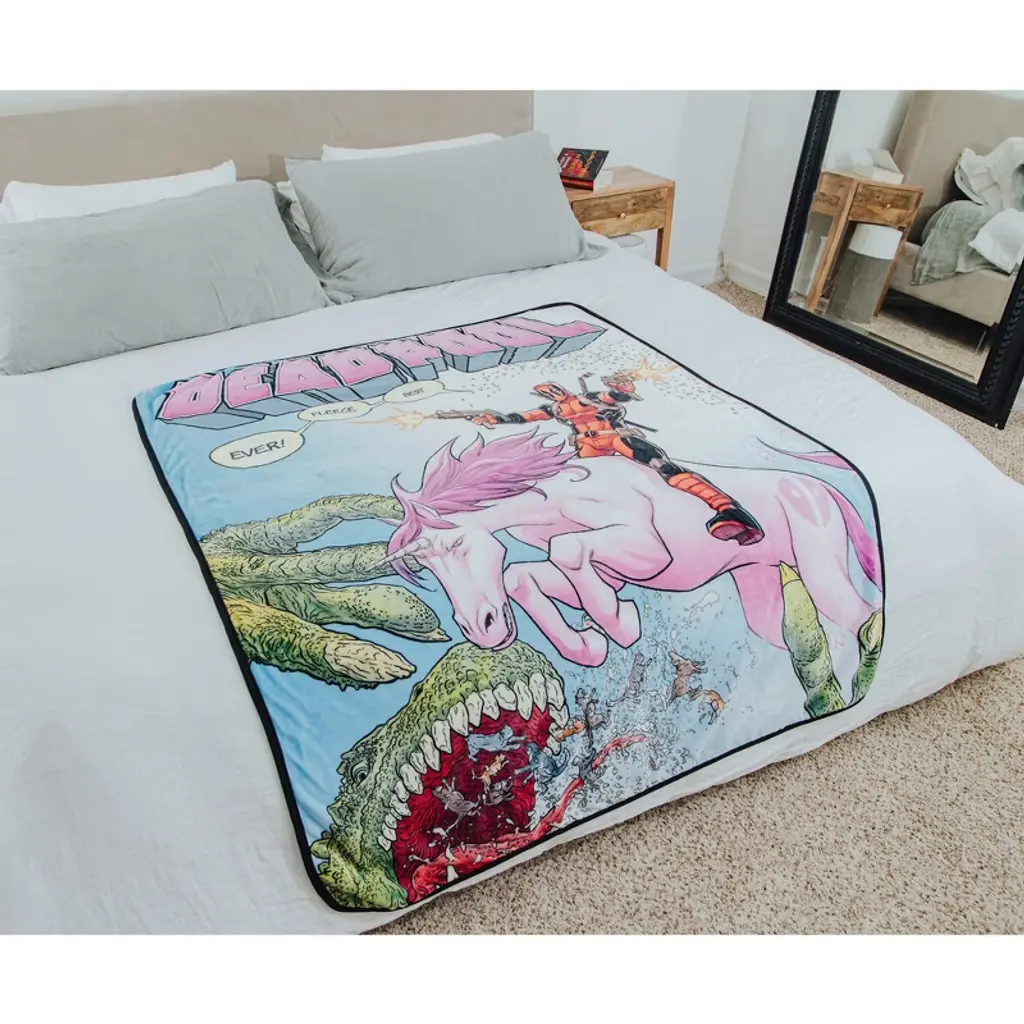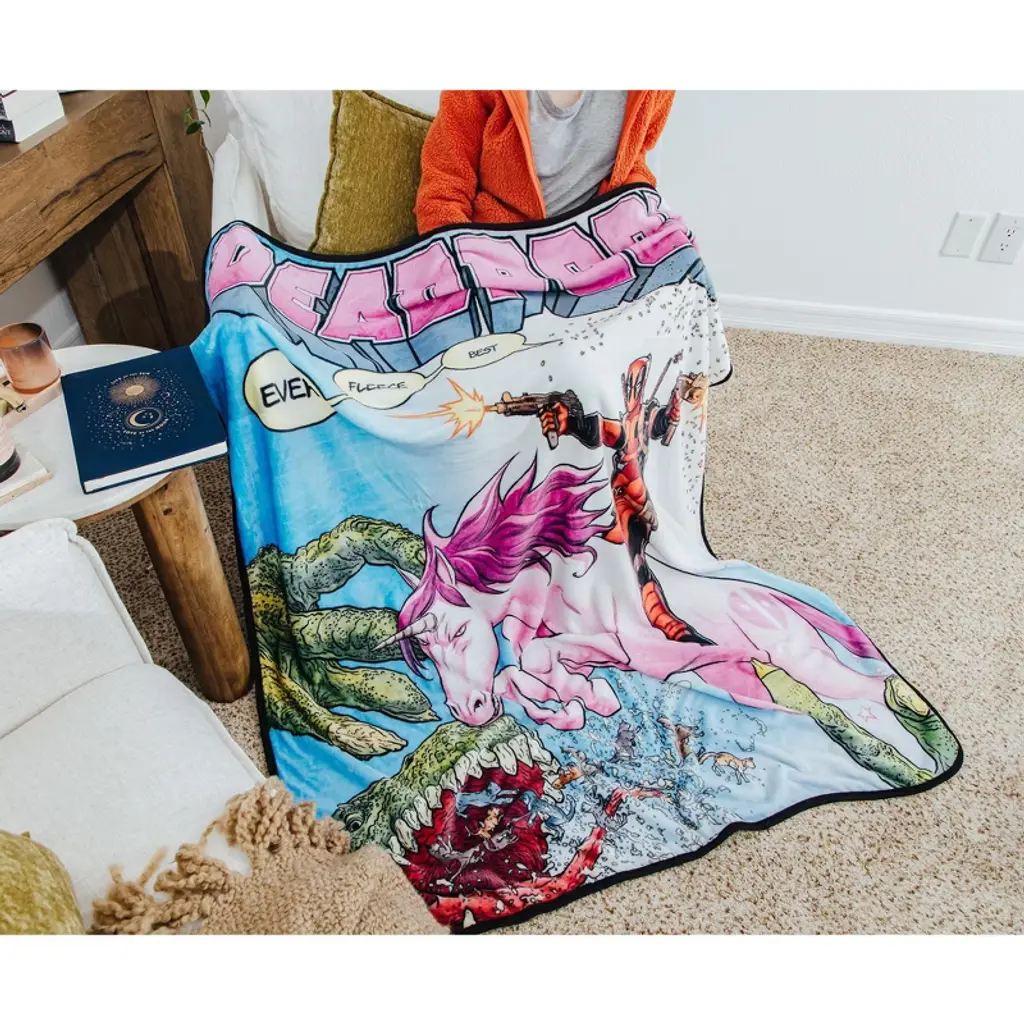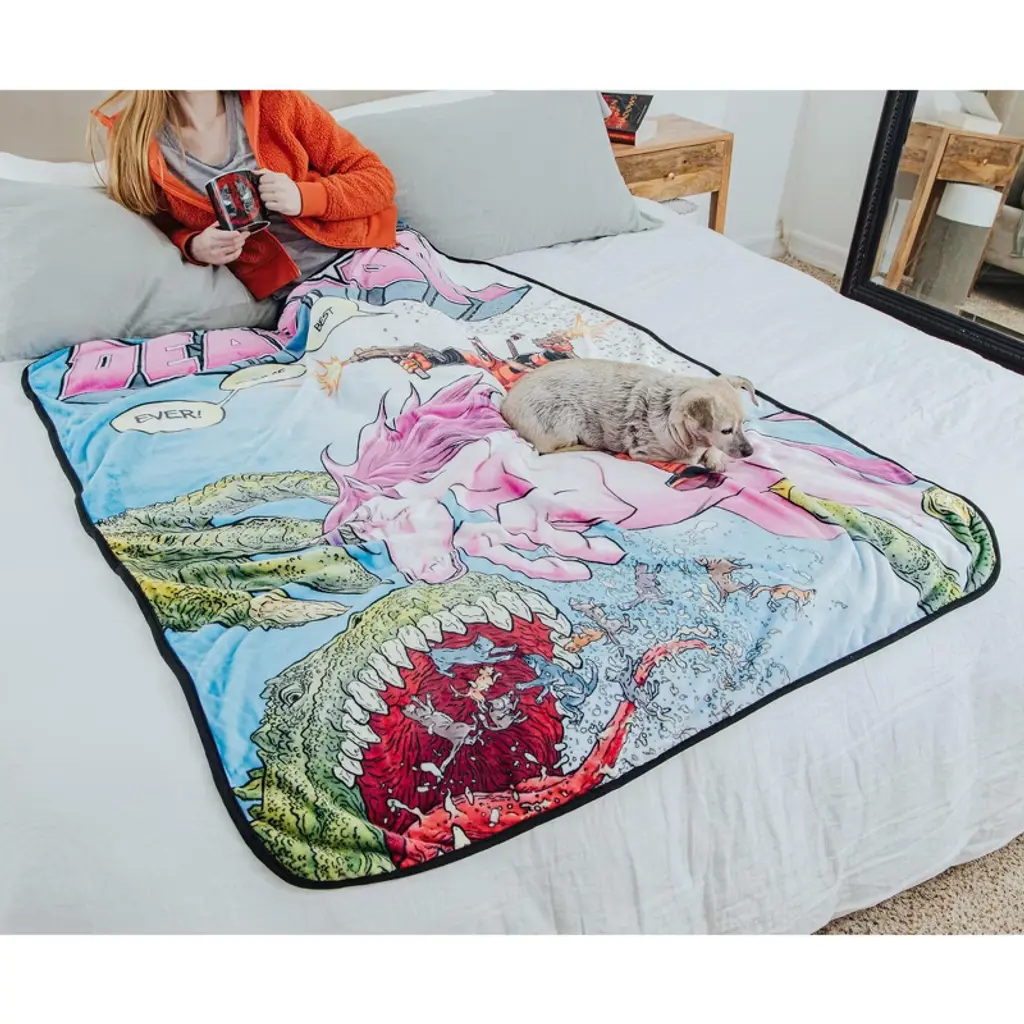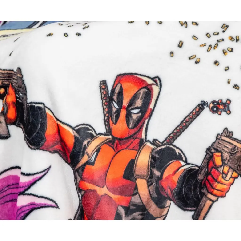 This officially licensed Marvel Comics throw blanket is Deadpool approved! Warm and cozy, the must-have throw blanket is soft to the touch, made up of 100% polyester material, and measuring a roomy 50 by 60 inches. Lastly, it's also easy to clean, machine wash with cold water is highly recommended.