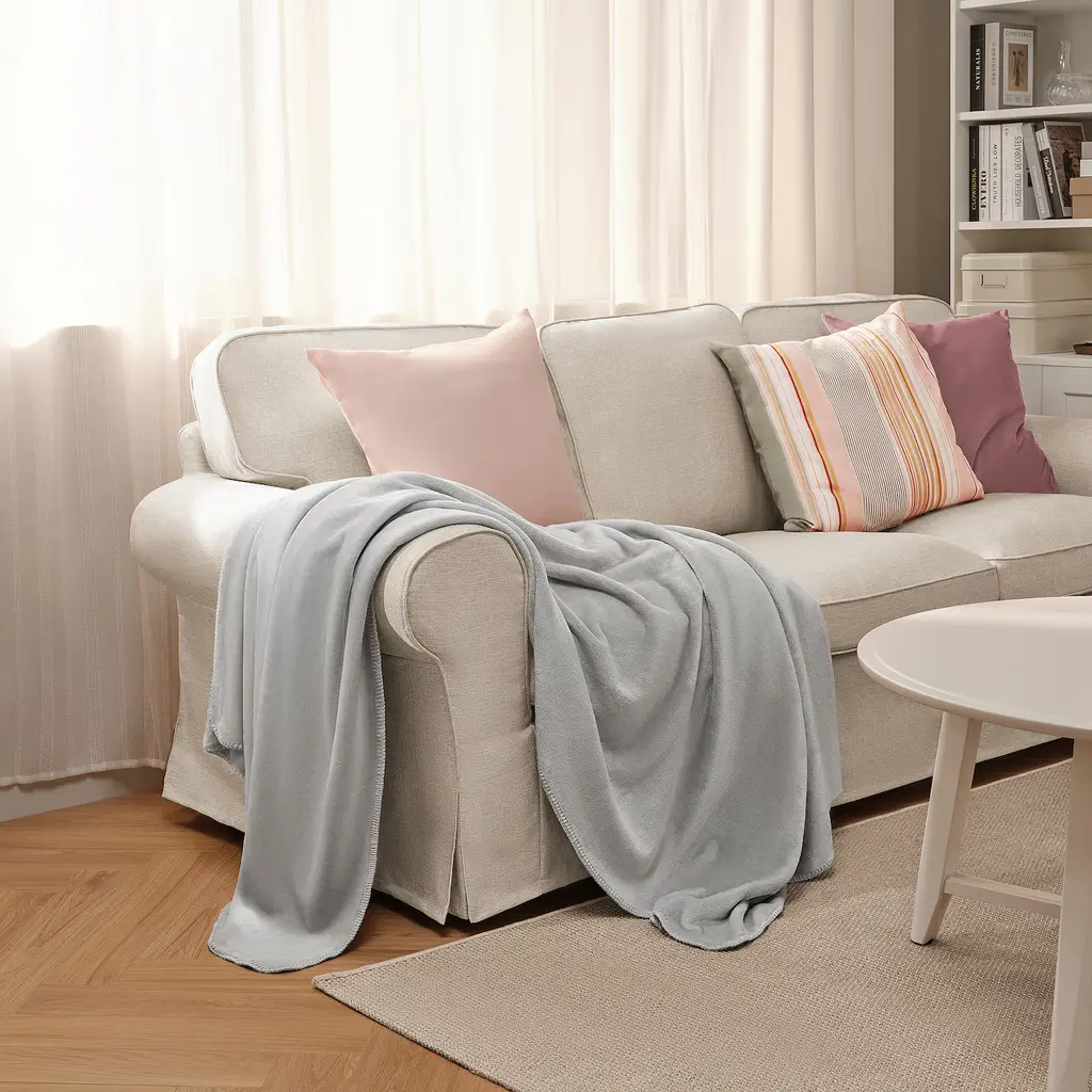 SLÅNGRÅMAL Throw - light gray 59x79 ". The fabric in 100% recycled polyester is easy-care and retains its softness and colors ‒ wash after wash. The fleece throw feels soft against your skin and can be machine washed.
