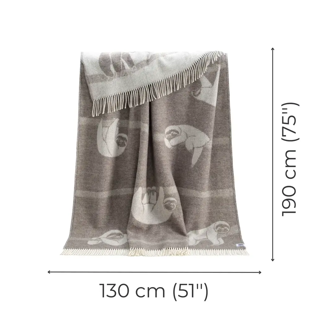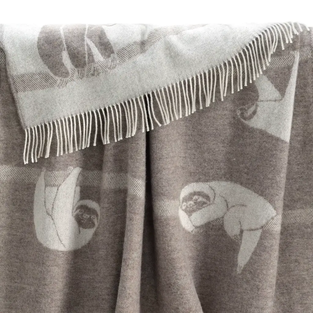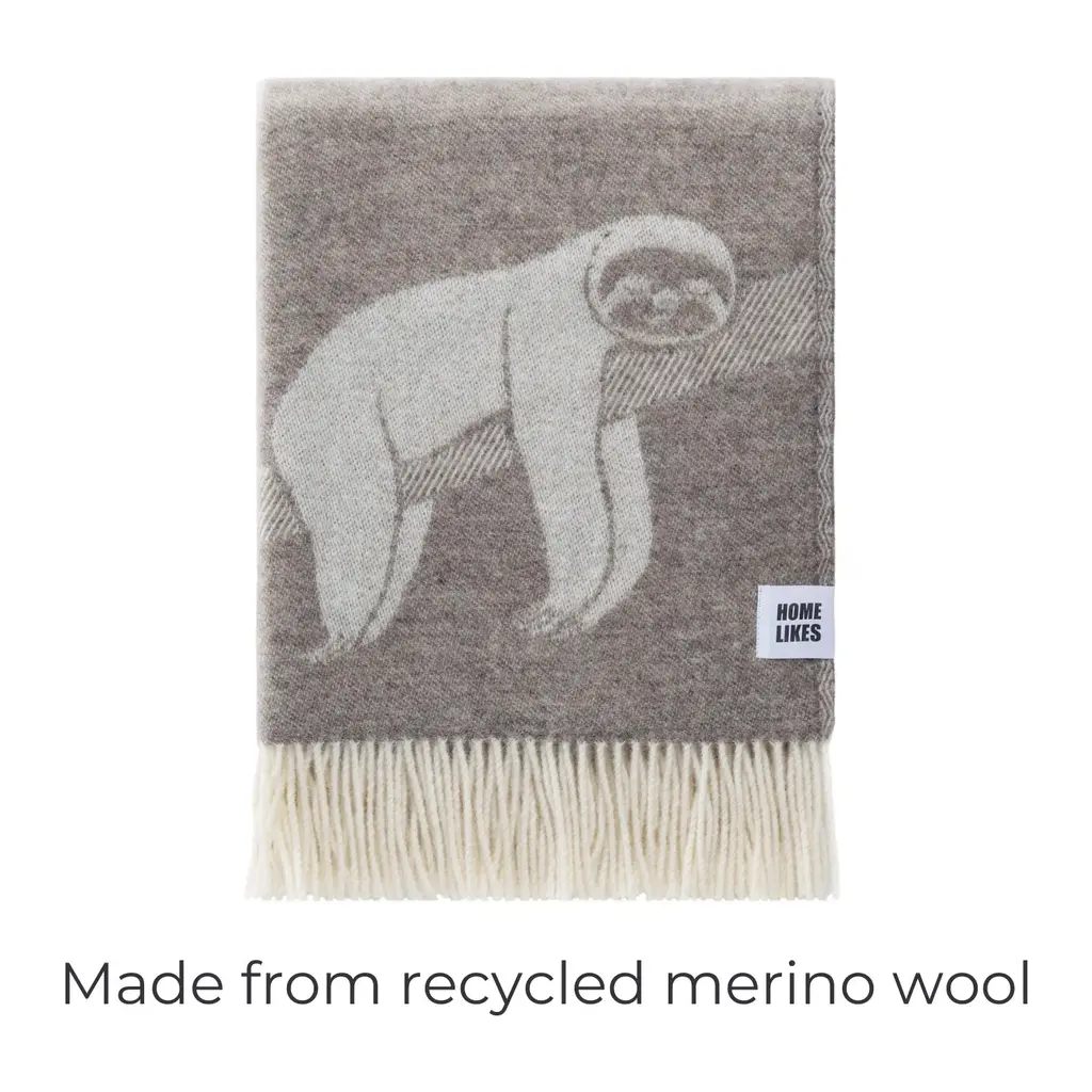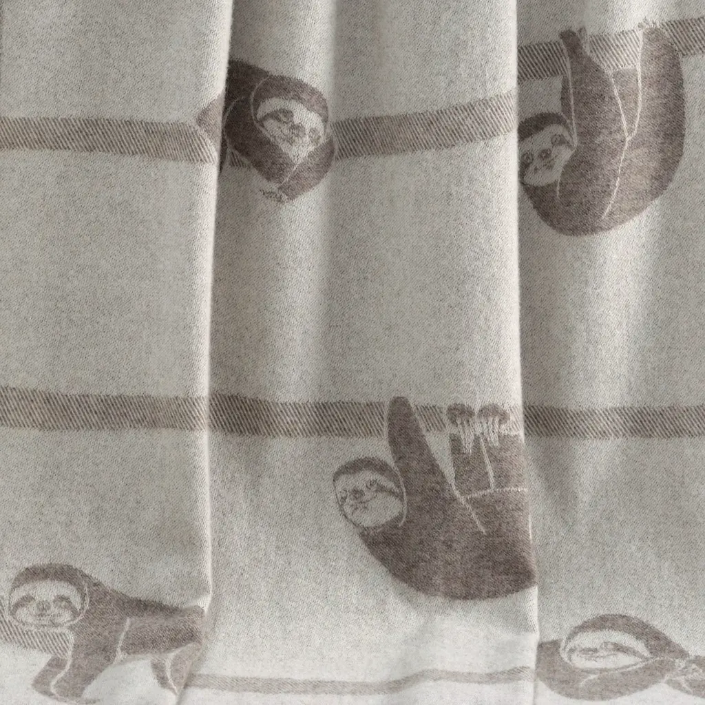 Bring a sense of calm and relaxation to your home with our Sloth Throw, featuring a charming design of sloths peacefully hanging from branches. The soft brown and off-white colour scheme adds warmth and a whimsical touch to any room.Crafted from a blend of new wool and recycled merino wool, this throw offers both cosy comfort and sustainability. Measuring 130 x 190 cm, it’s perfect for adding a snug layer to your sofa, draping over your bed or wrapping up in for a lazy afternoon. Finished with a fringed edge, this throw is a delightful and eco-friendly addition to your living space, inspired by the serene nature of sloths.