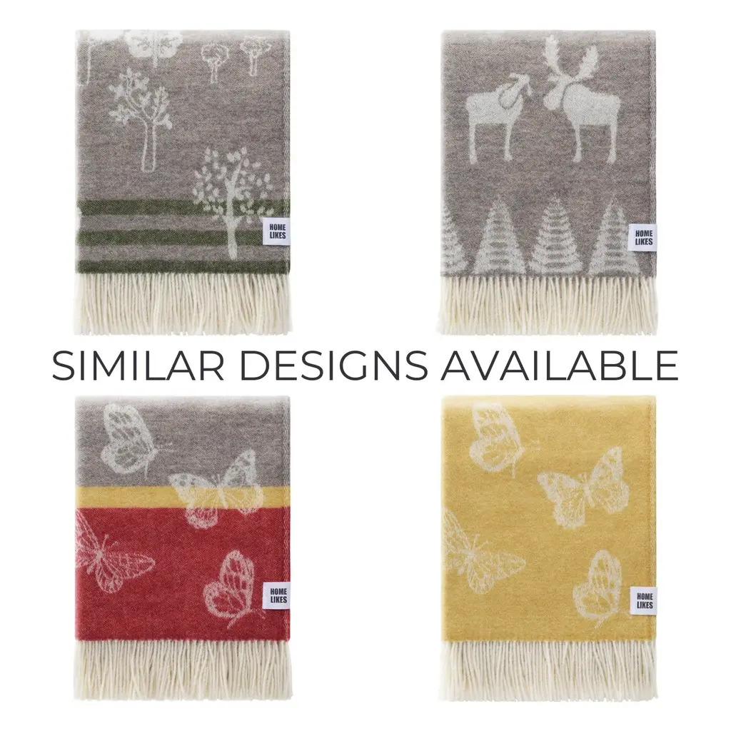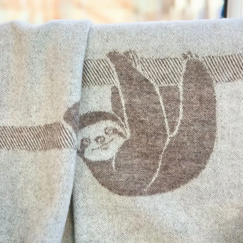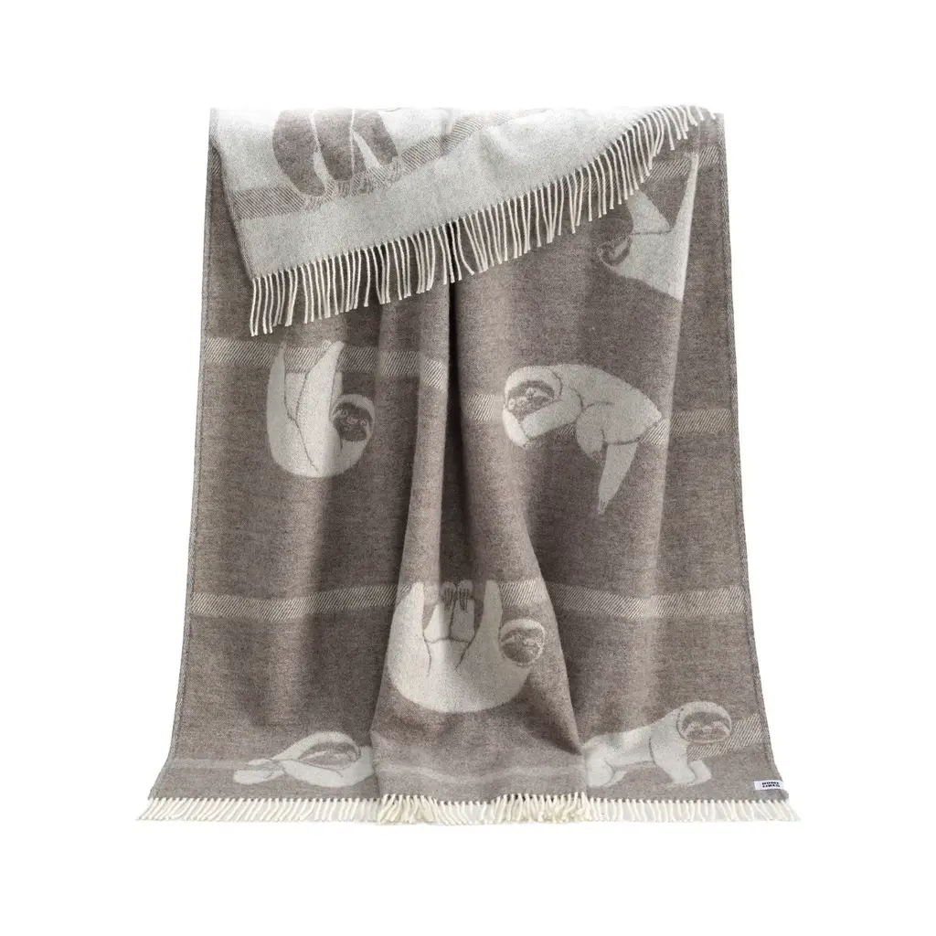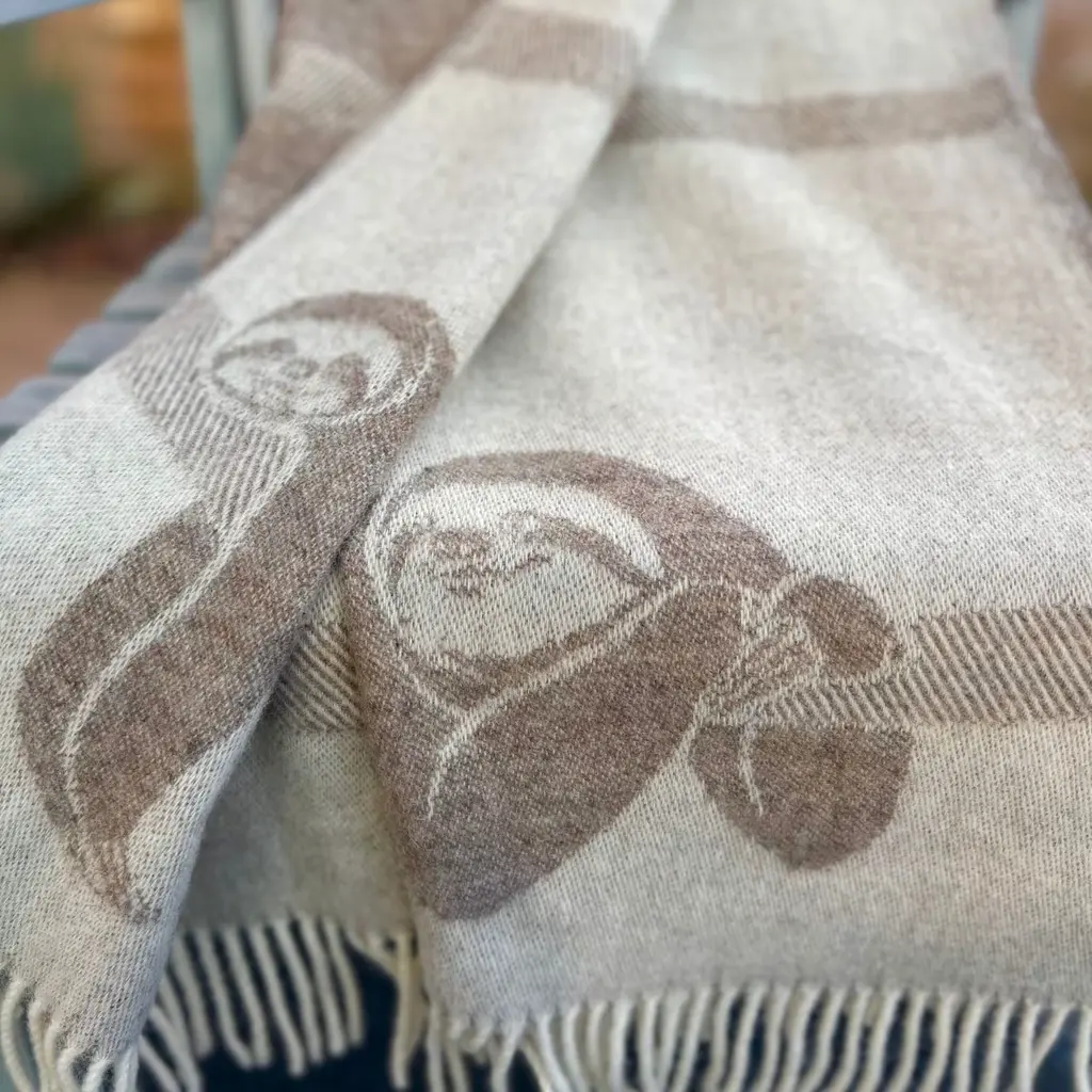 Bring a sense of calm and relaxation to your home with our Sloth Throw, featuring a charming design of sloths peacefully hanging from branches. The soft brown and off-white colour scheme adds warmth and a whimsical touch to any room.Crafted from a blend of new wool and recycled merino wool, this throw offers both cosy comfort and sustainability. Measuring 130 x 190 cm, it’s perfect for adding a snug layer to your sofa, draping over your bed or wrapping up in for a lazy afternoon. Finished with a fringed edge, this throw is a delightful and eco-friendly addition to your living space, inspired by the serene nature of sloths.