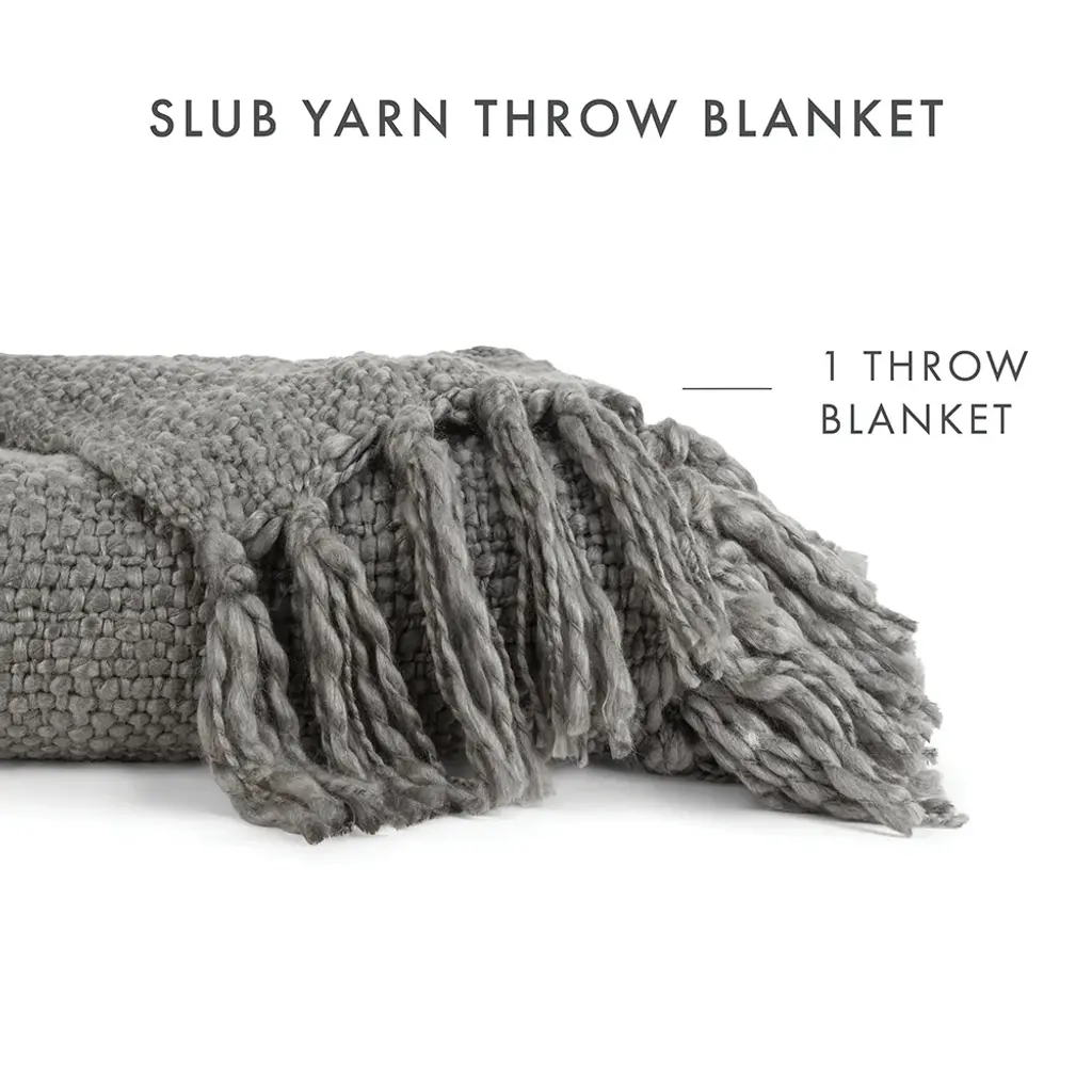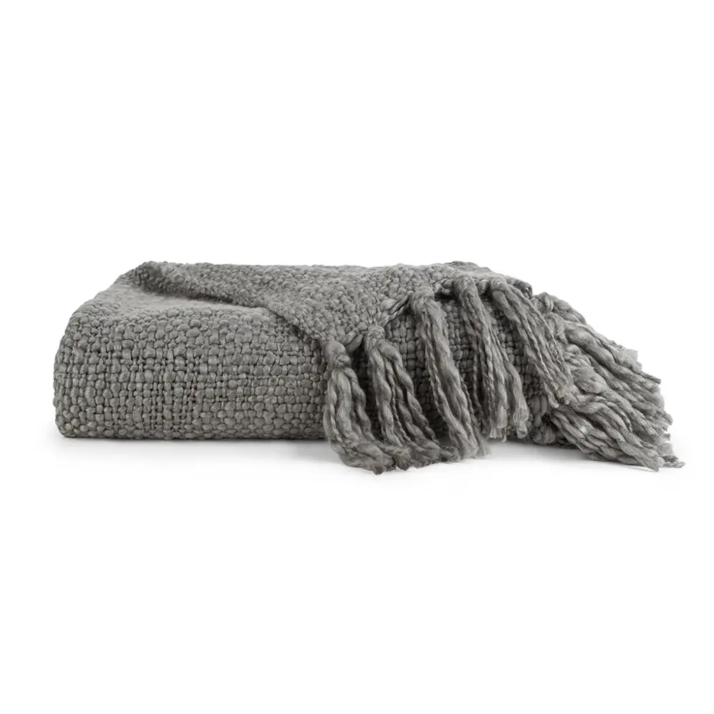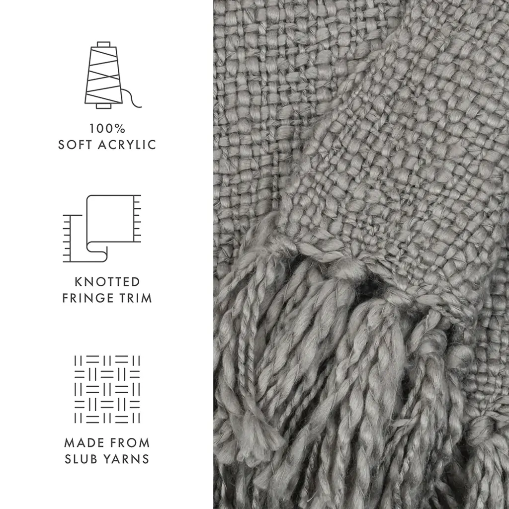 Our solid basketweave throw's large scale texture and intriguing fringe are achieved by using ultra-soft yarns of varying thickness and slubs. The result is a medium weight knit throw that is extra cozy and oh-so-inviting. Perfect for a quick refresh of any space, or lounging around!
