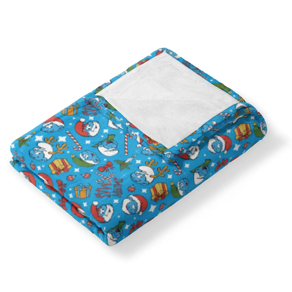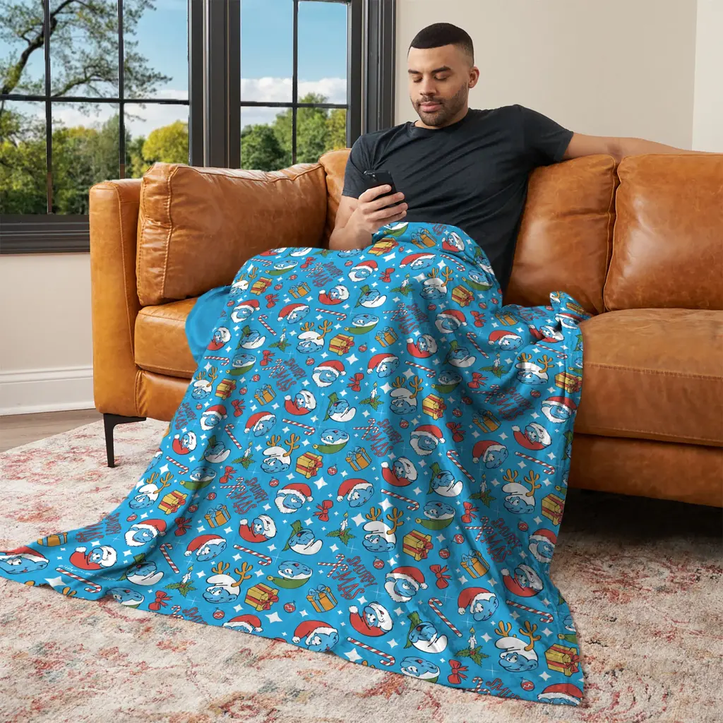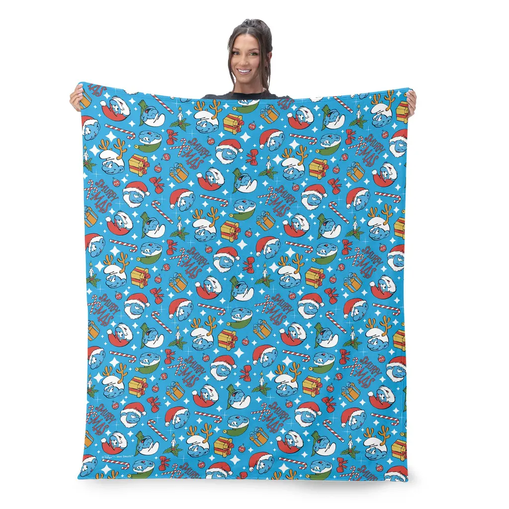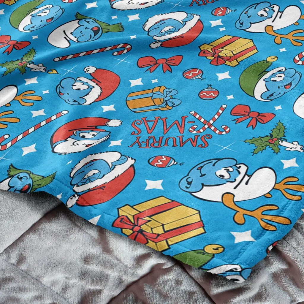 Snuggle up with the Smurfs Christmas Silk Touch Throw Blanket, where festive cheer meets charming design. Made from incredibly soft Silk Touch fabric, this throw offers warmth and comfort all season long. Whether draped over your couch, chair, or bed, the blanket's delightful design and soft texture make it the perfect companion for winter relaxation. Papa Smurf and his companions bring the holiday spirit to life, making it a perfect piece for any Smurfs fan or festive décor enthusiast. This throw is ideal for those who want to embrace both the joy of the season and the fun of Smurfs. With its cheerful colors and cozy feel, it's sure to become a favorite addition to your home, whether you're curling up with a good book or enjoying time with family. Features:
