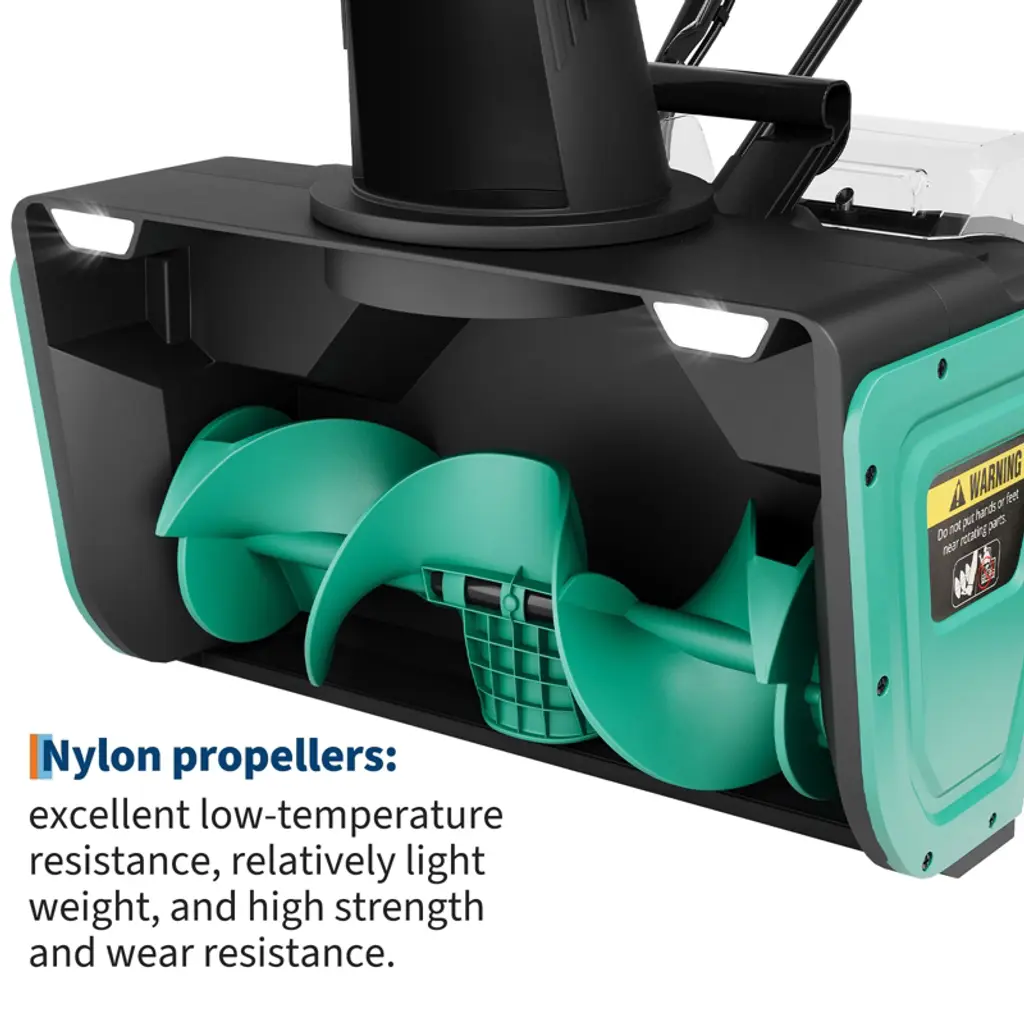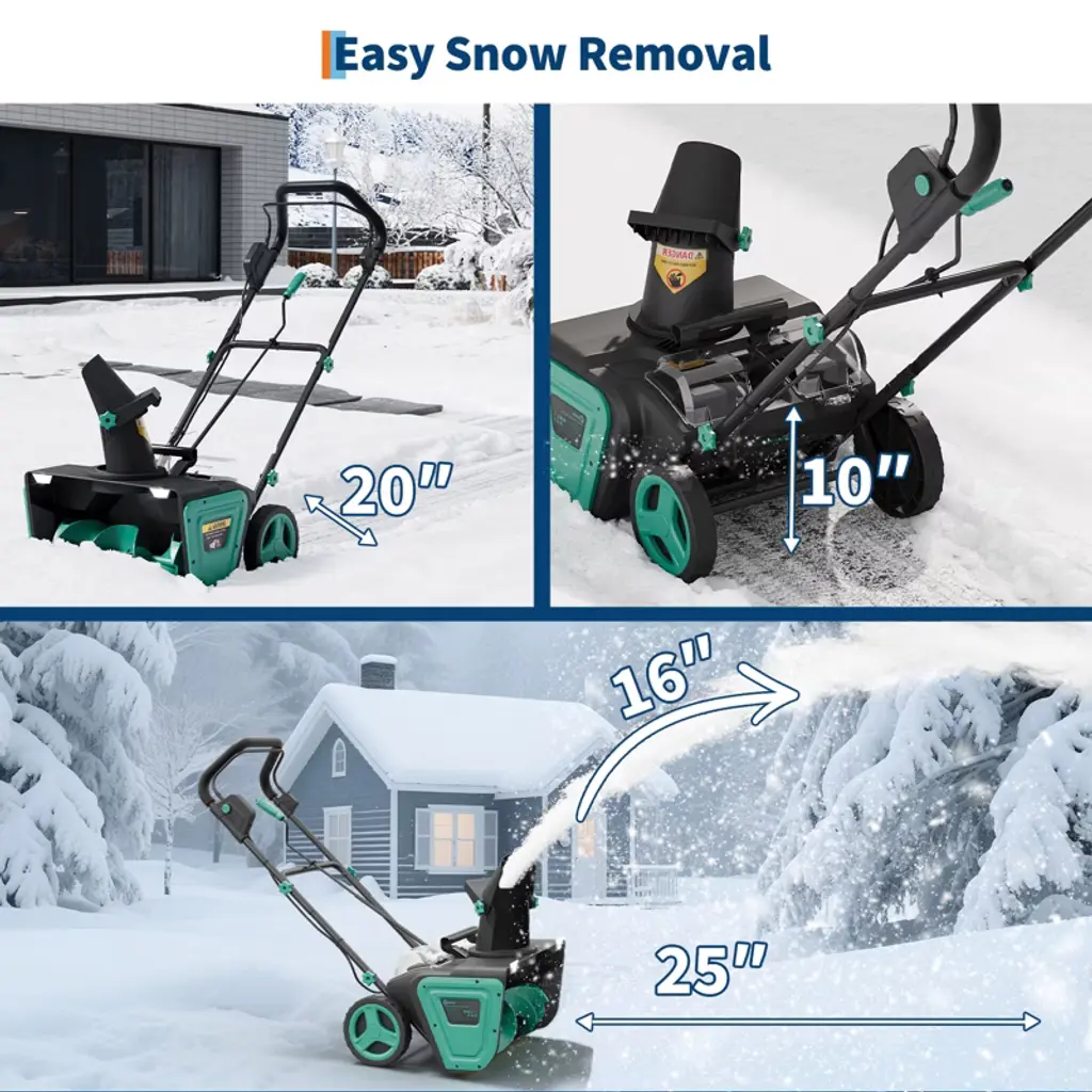 Equipped with a powerful 40V 4.0Ah battery, this electric snow thrower delivers reliable performance without the noise and fumes of gas-powered models. Its 20-inch clearing path allows you to quickly and efficiently clear driveways, sidewalks, patios, and more, handling snow depths up to 10 inches with ease.Designed for convenience and power, this snow blower features a robust motor that throws snow up to 25 feet away, keeping your pathways clear and safe. The design offers maximum mobility and freedom, eliminating the need for extension cords or fuel. Lightweight and easy to maneuver, it reduces the physical strain of snow removal, making winter chores effortless.Key Features:- 20-inch clearing width for fast and efficient snow removal- Capable of clearing snow up to 10 inches deep- Powerful 40V 4.0Ah battery provides long-lasting performance- Throws snow up to 25 feet away, keeping your area clear- design for easy maneuverability and convenience