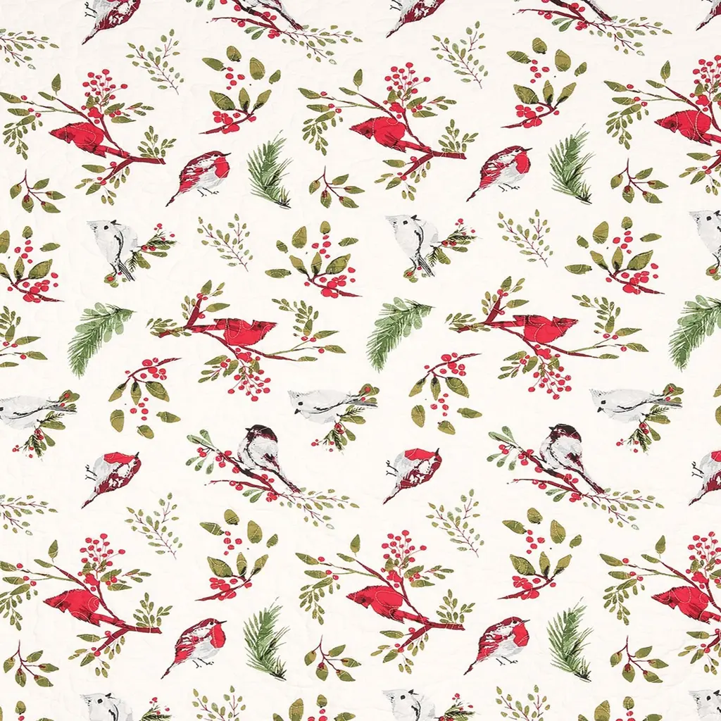 Capture the fleeting charm of spritely winter birds with the Sprig Birds quilted throw from Tag Living by C&F Home. Vibrant cardinals and lively chickadees enjoy the evergreen leaves of fruitful holly sprigs, while providing a welcome splash of life and color against a snow-white background. Reverse to a simple red plaid pattern for additional styling options. Crafted of cotton and machine washable for easy care. Love this pattern? Sprig Birds is also available in our bedding and tabletop collections.Vibrant cardinals and lively chickadees enjoy the evergreen leaves of fruitful holly sprigs on a snow white groundAn intricate floral swirl stitching pattern adds texture and depthReversible to a simple aqua grid pattern