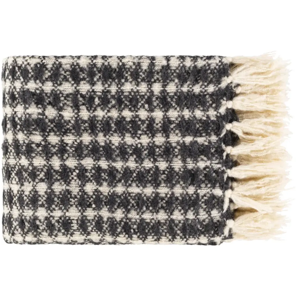 This throw blanket showcases a classic houndstooth pattern in understated charcoal + cream hues – ideal for warming up seating areas from minimalist to modern farmhouse. It’s handcrafted from plush acrylic yarns and nylon + finished with a lush knotted fringe. We suggest spot-cleaning with a mild detergent to keep this blanket looking its best.