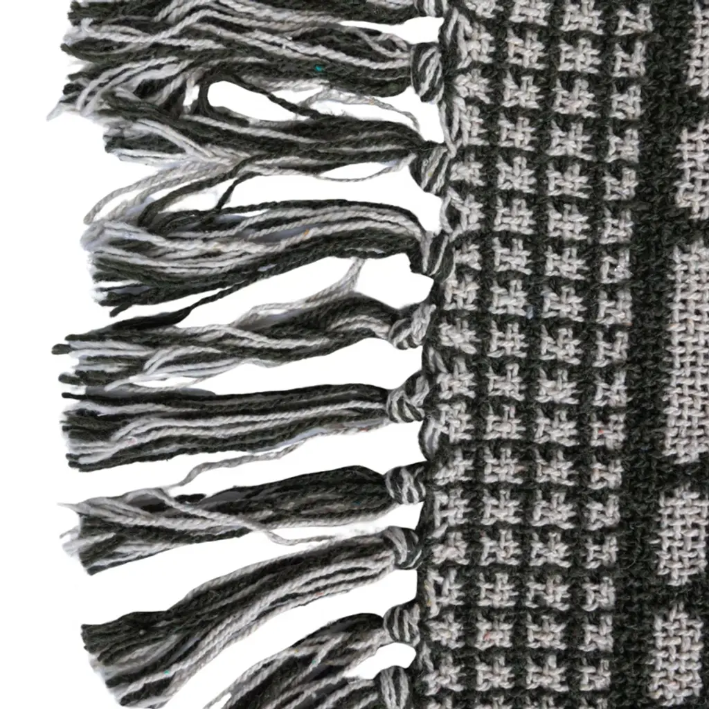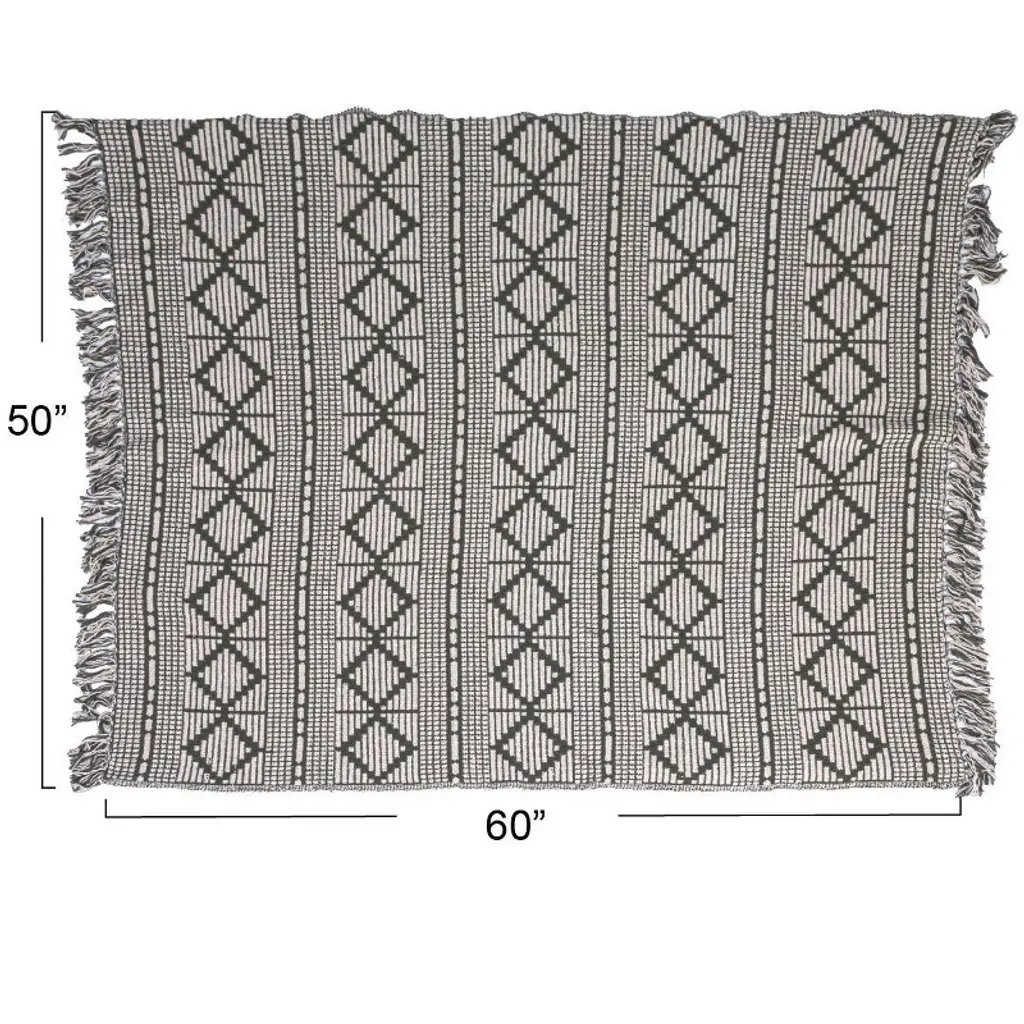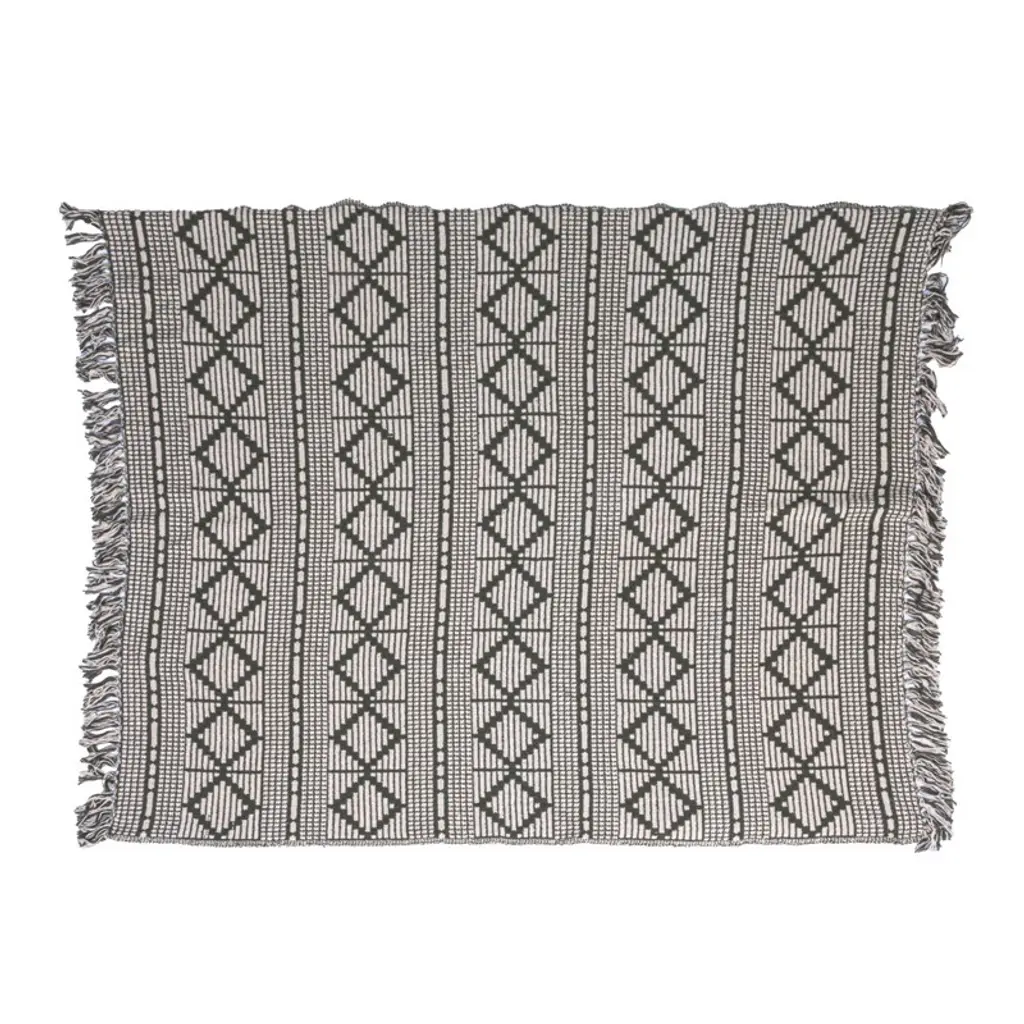 Enhance the home with this recycled cotton blend throw with a diamond pattern and fringe in forest green and beige. The dark green and beige color is neutral and elegant, complementing many color schemes and styles. This throw blanket is ideal for adding a natural feel to any room, whether lodge, cabin, or boho in style. When not in use decorate the sofa, bed, chair, or bench. Substantial in weight, the throw blanket measures 60 inches long by 50 inches wide, a versatile size for draping. Machine wash cold and tumble dry low to keep it clean and fresh.