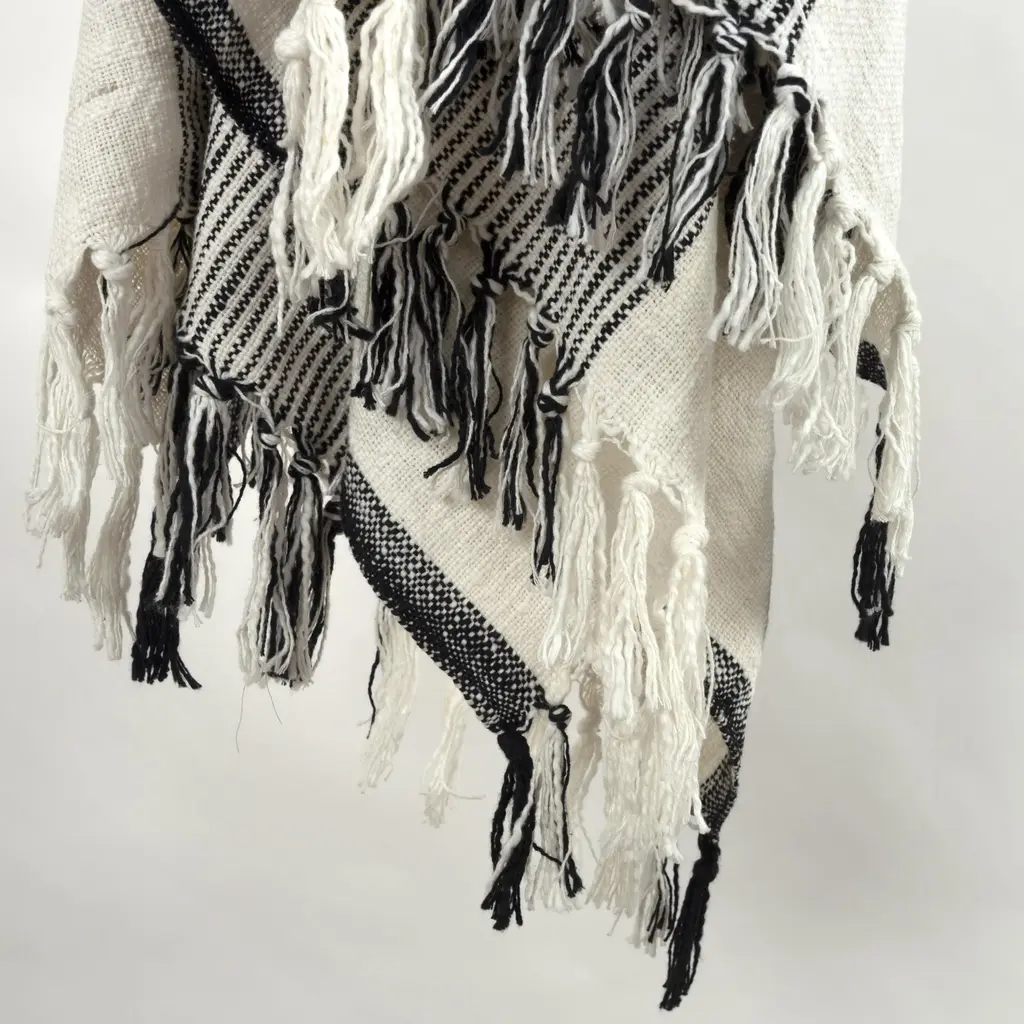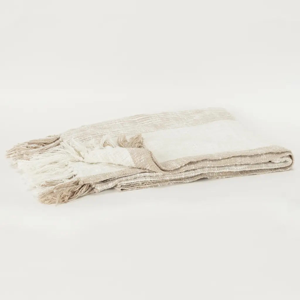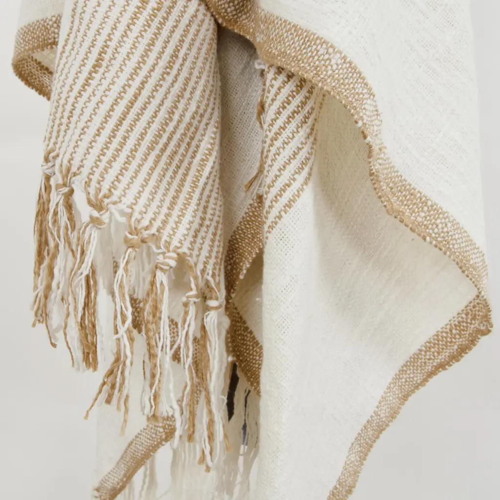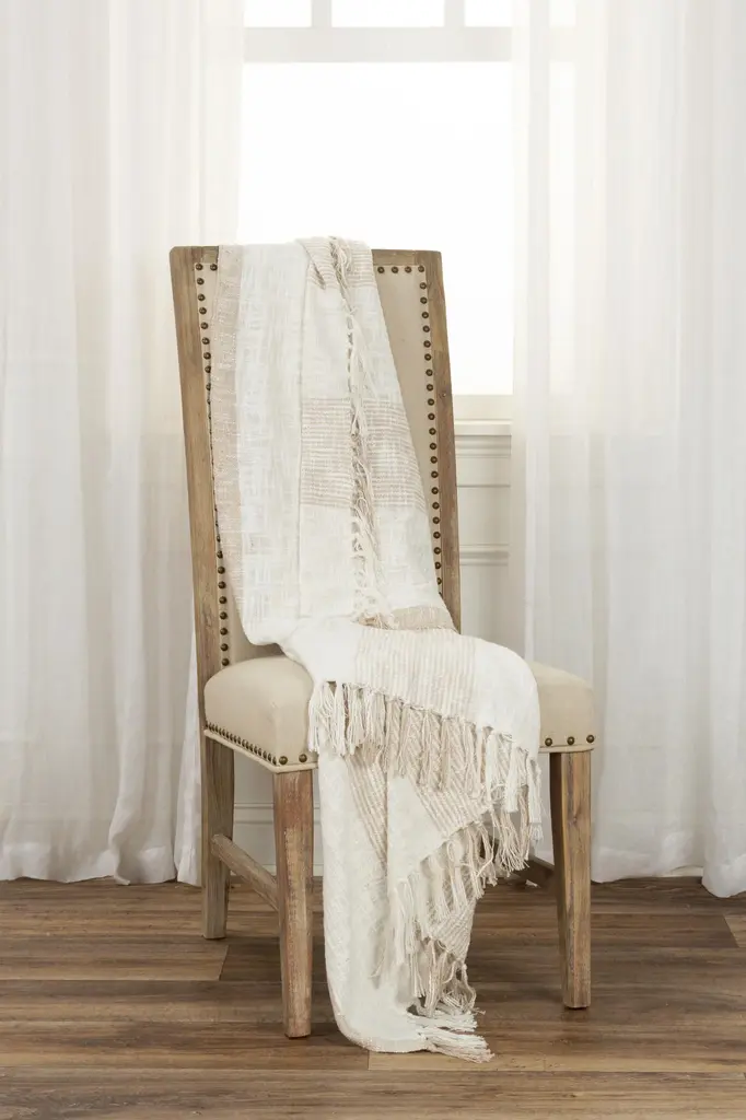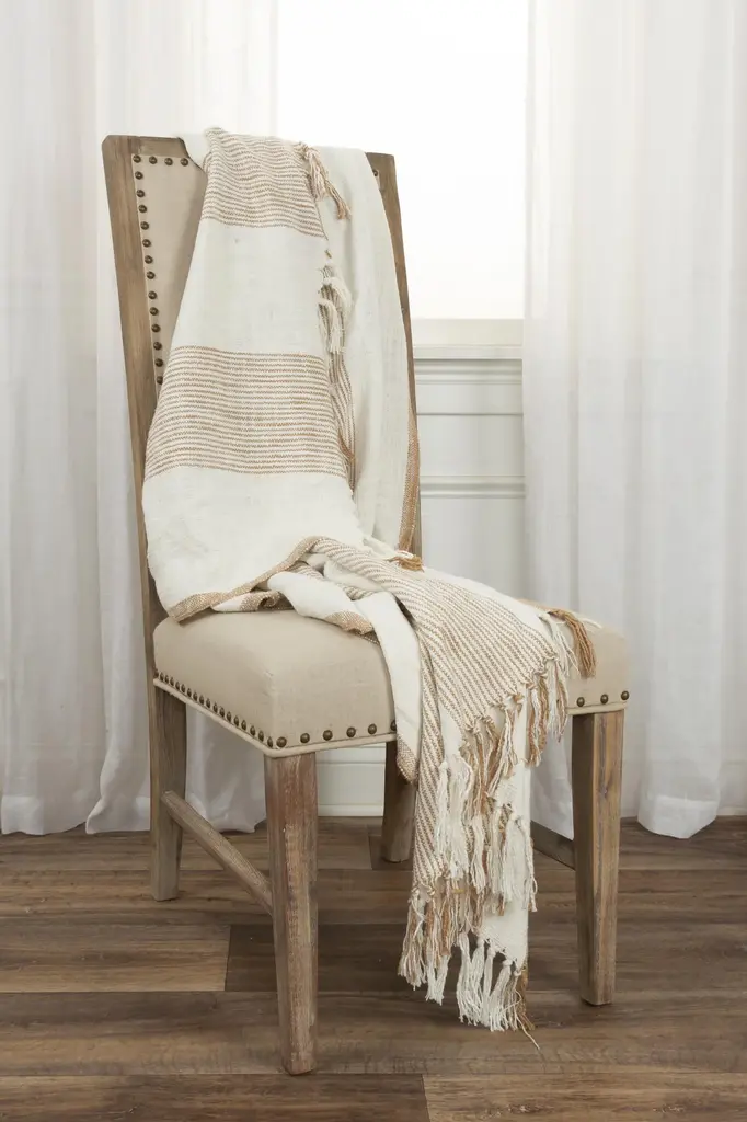 This gorgeous throw blanket has been expertly crafted using slubbed yarns to create a beautiful woven stripe design with a touch of boho-chic style. Hand-tied warp yarns are incorporated into the design, which are then elegantly woven into tassels, adding texture and stunning detail. Its medium weight is perfect for snuggling under on cool nights, specially washed to ensure extra softness. The ivory and natural colors are neutral and yet simply elegant. making it the perfect complement to any décor. This beautifully crafted throw is a must-have for any home looking to add a subtle touch of sophistication and contemporary style.