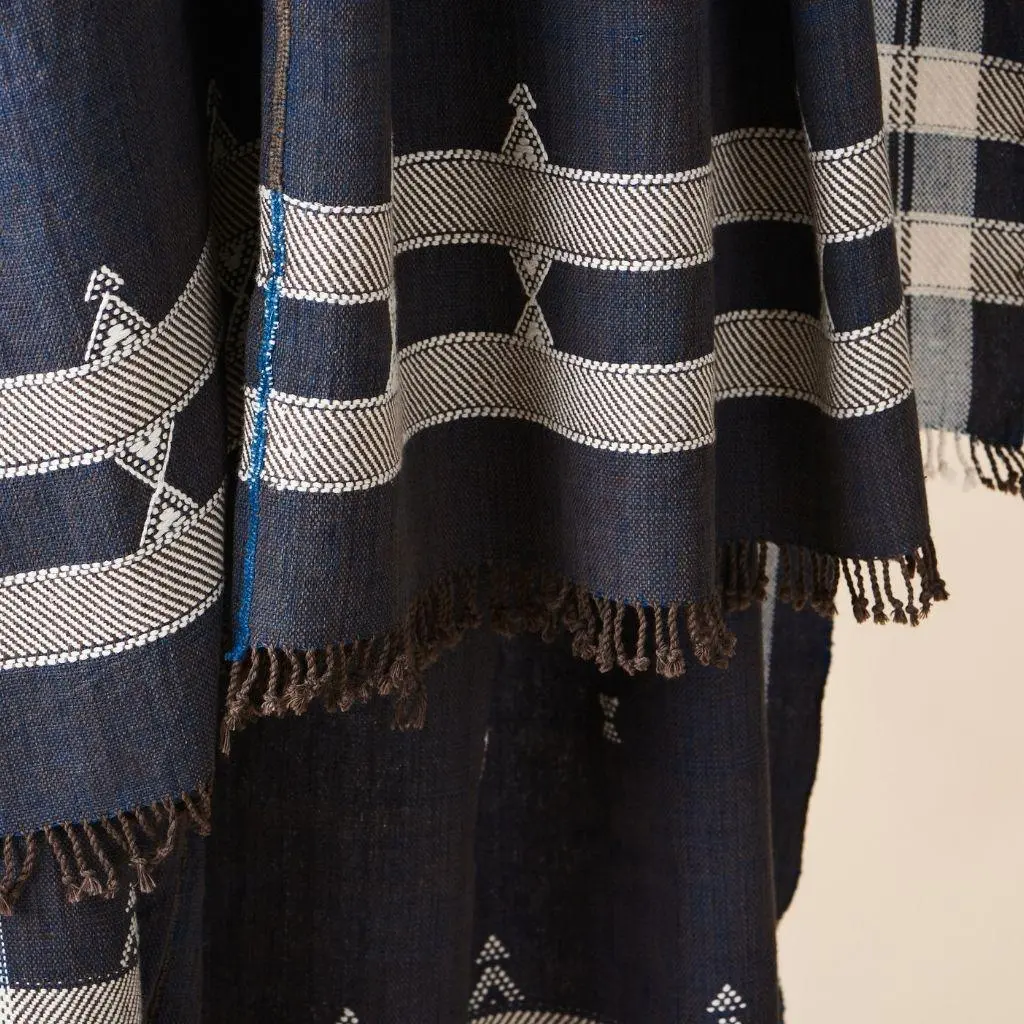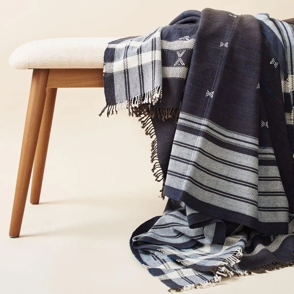 This textile's design is made up of minimal motifs that create the artisanal design stand out. This piece is made entirely on ancient pit loom. Hand-spun organic cotton has been used on ancient looms in rural artisan community in India. Each piece is hand embroidered in the centre to join the panels manually by artisans which makes it very unique. Fringes are neatly hand rolled as well. The organic cotton used in this throw has been cultivated by using rain water harvestation process making it truly sustainable in nature. The raw cotton has an earthly appeal. Requiring attention to detail and finishing, Indie luxuriously combines heritage value and high quality craftsmanship and can be used as a throw or blanket in your living space and adds up as a bedspread in your personal space. For this throw, we are using only the highest quality of soft natural old world hand-spun organic cotton yarn, which is later hand-dyed with eco-friendly dyes, free of toxic chemicals. Our dyes are specifically engineered to promote the lifespan of each throw. As this one of a kind throw is completely handmade from start to finish, each piece is unique. Classic in design, this textile will complement interior spaces and also support artisan communities ethically. Size: 83" x 43" (210 cm x 110 cm) Material: 100% organic hand-spun cotton. Colors: Indigo & Brown Artisan base: Ethically and responsibly handwoven by artisans in India. Wash care: Gently hand wash using gentle detergents. Hang dry in cool shaded place or delicately dry clean only. What Makes Your Purchase Sustainable ? 100% Organic dyes used. Support employment of women artisans & farmers. Supporting local small farms that cultivate indigenous organic cotton. Low carbon foot print as the cotton is 100% rain-fed. 100% handmade manufacturing process by artisans. Use only 100% natural + biodegradable responsibly sourced materials. Small batch production ensures higher quality & less wastage. Each product comes in reusable cotton pouches also made by our artisans.