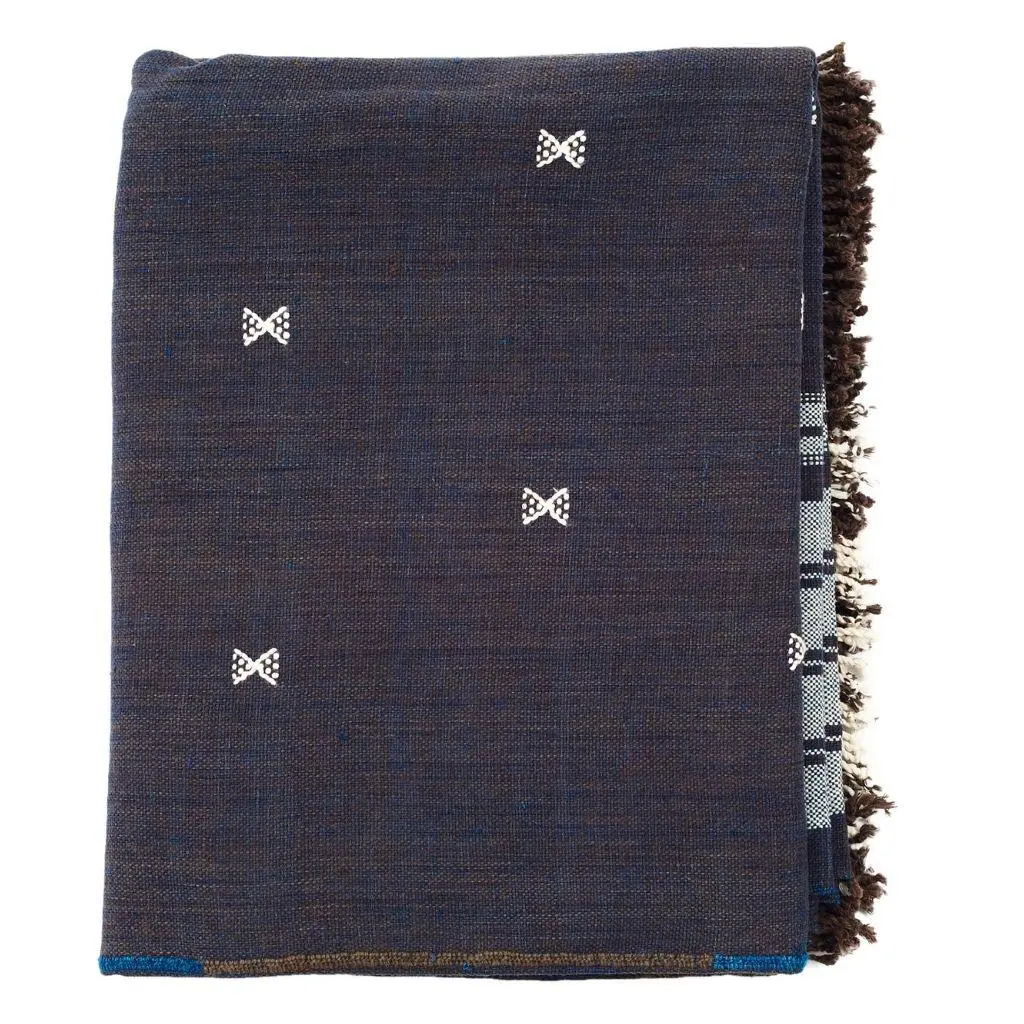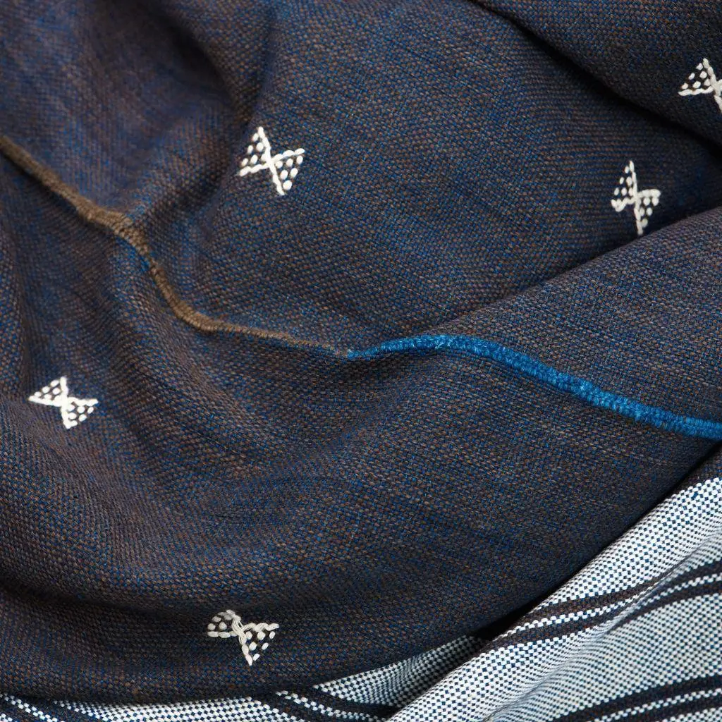 This textile's design is made up of minimal motifs that create the artisanal design stand out. This piece is made entirely on ancient pit loom. Hand-spun organic cotton has been used on ancient looms in rural artisan community in India. Each piece is hand embroidered in the centre to join the panels manually by artisans which makes it very unique. Fringes are neatly hand rolled as well. The organic cotton used in this throw has been cultivated by using rain water harvestation process making it truly sustainable in nature. The raw cotton has an earthly appeal. Requiring attention to detail and finishing, Indie luxuriously combines heritage value and high quality craftsmanship and can be used as a throw or blanket in your living space and adds up as a bedspread in your personal space. For this throw, we are using only the highest quality of soft natural old world hand-spun organic cotton yarn, which is later hand-dyed with eco-friendly dyes, free of toxic chemicals. Our dyes are specifically engineered to promote the lifespan of each throw. As this one of a kind throw is completely handmade from start to finish, each piece is unique. Classic in design, this textile will complement interior spaces and also support artisan communities ethically. Size: 83" x 43" (210 cm x 110 cm) Material: 100% organic hand-spun cotton. Colors: Indigo & Brown Artisan base: Ethically and responsibly handwoven by artisans in India. Wash care: Gently hand wash using gentle detergents. Hang dry in cool shaded place or delicately dry clean only. What Makes Your Purchase Sustainable ? 100% Organic dyes used. Support employment of women artisans & farmers. Supporting local small farms that cultivate indigenous organic cotton. Low carbon foot print as the cotton is 100% rain-fed. 100% handmade manufacturing process by artisans. Use only 100% natural + biodegradable responsibly sourced materials. Small batch production ensures higher quality & less wastage. Each product comes in reusable cotton pouches also made by our artisans.