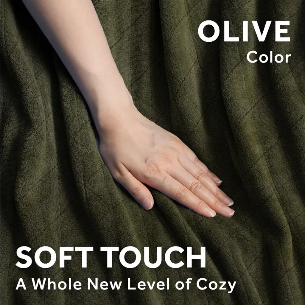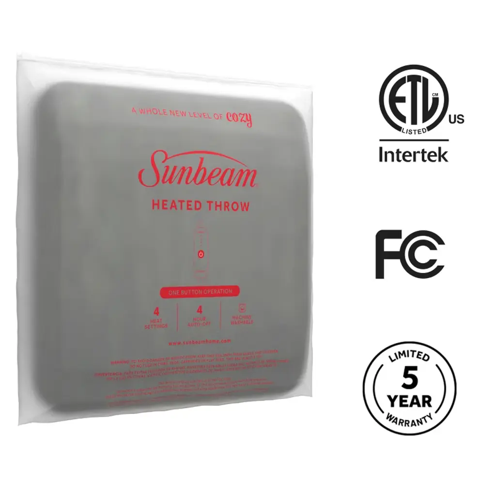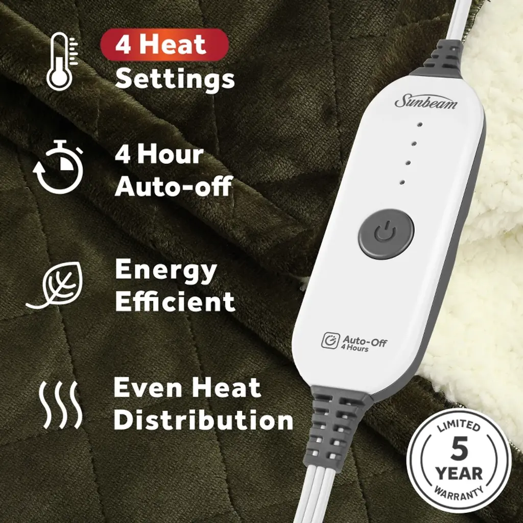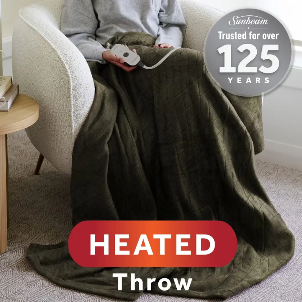 Sunbeam Heated Throw Blanket brings cozy comfort and personalized warmth with its quilted velvet face and plush sherpa reverse. The rich Olive color adds a warm, earthy accent to any room. Sized at 50" x 60", it’s perfect for curling up on the couch, reading in bed, or staying warm while you relax at home.The easy push-button controller offers 4 heat settings so you can choose your ideal level of warmth. Fast-heating technology delivers soothing comfort quickly, while advanced heating wires sense and adjust to maintain consistent, even heat. Built-in safety features include a 4-hour auto shut-off and overheat protection for added peace of mind.When it’s time to clean, simply detach the controller and place the blanket in the washing machine—it stays soft wash after wash.Sunbeam—bringing trusted warmth and comfort to homes for over 125 years.