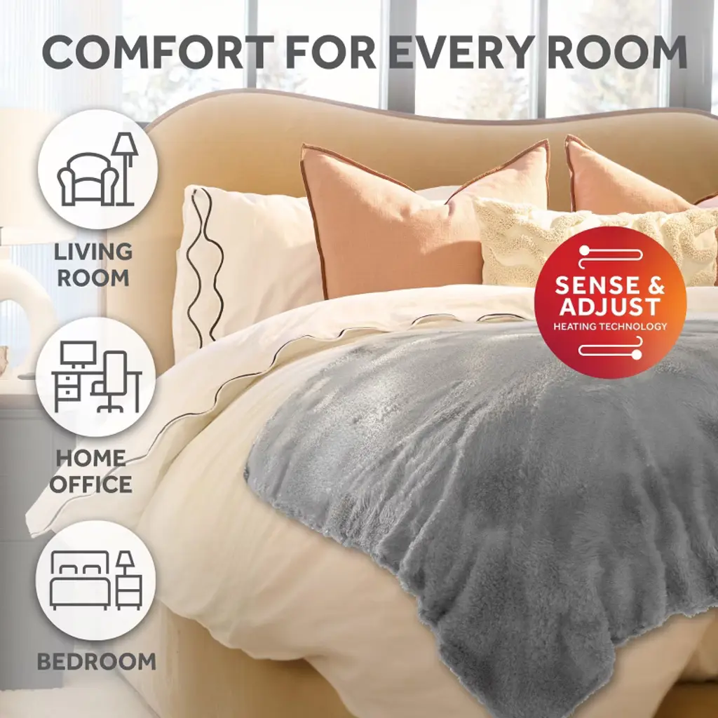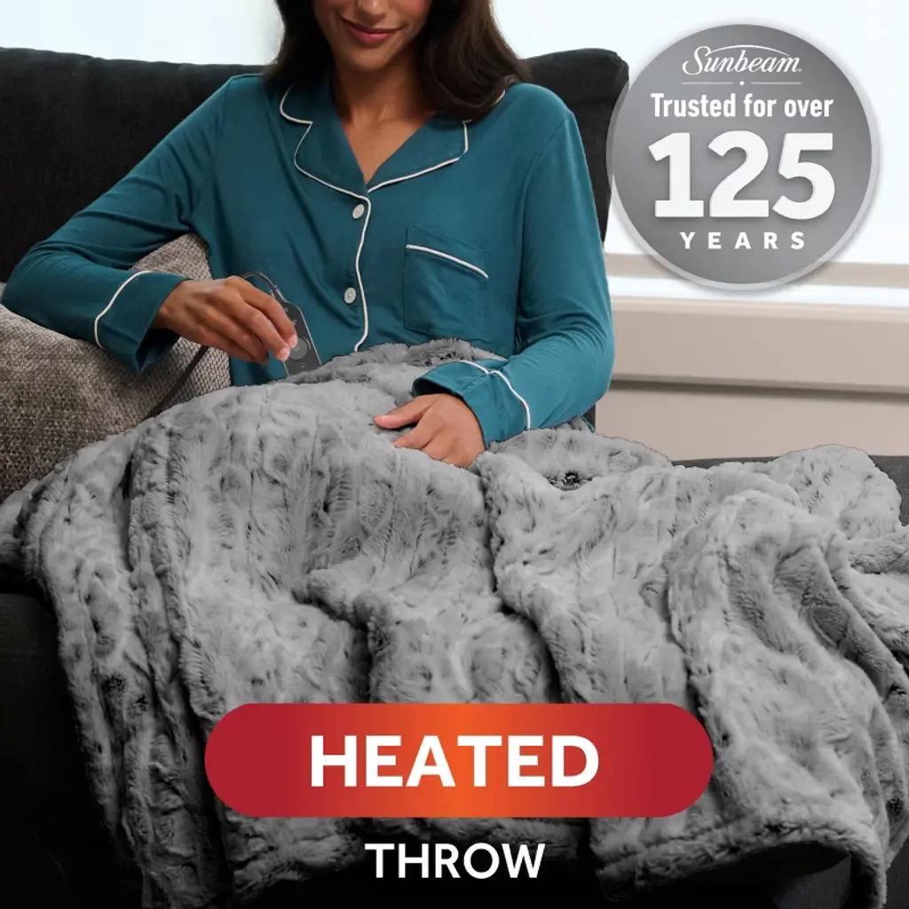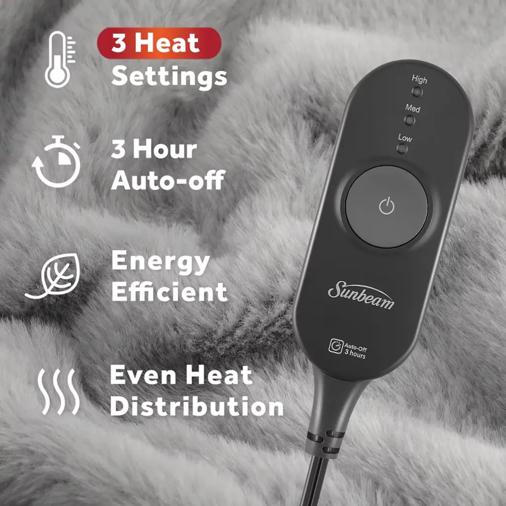 Sunbeam Electric Heated Throw Blanket delivers stylish warmth with its luxurious faux fur fabric and fast-heating technology. Featuring a soft, textured gray finish, this 50" x 60" heated throw adds a sophisticated touch to any room while wrapping you in cozy comfort—perfect for relaxing on the couch, reading in bed, or staying warm while working from home.The easy-to-use controller lets you choose from 3 heat settings to customize your comfort. The blanket heats up quickly and evenly thanks to advanced wire-sensing technology. Built-in safety features include a 3-hour auto shut-off and overheat protection, so you can relax with peace of mind.When it’s time to clean, simply detach the controller and toss the throw into the washing machine—it stays soft and elegant wash after wash.Sunbeam—trusted for over 125 years to bring safe, soothing warmth to your home.