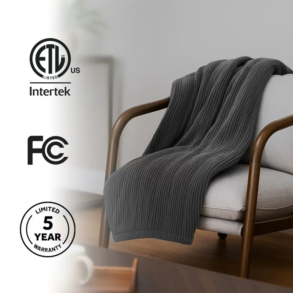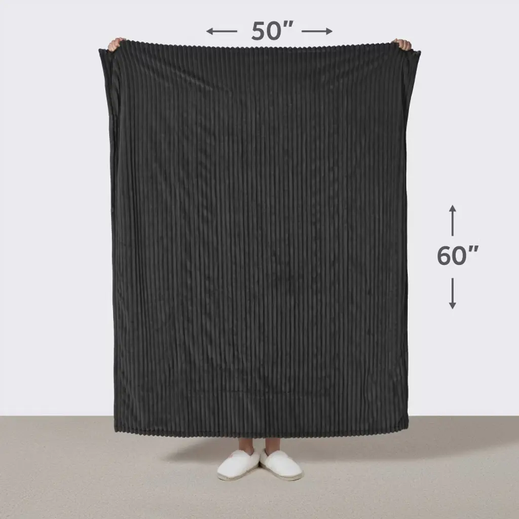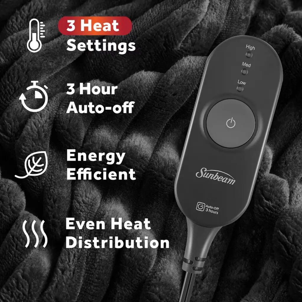 Sunbeam Heated Throw Blanket delivers cozy comfort and adjustable warmth with its ultra-soft textured velvet fabric. The Slate color offers a clean, modern look that complements any room. Sized at 50" x 60", it’s ideal for lounging on the couch, reading in bed, or staying warm at your desk.The easy-to-use push-button controller offers 3 heat settings so you can customize your comfort. Fast-heating technology delivers soothing warmth quickly, while advanced heating wires sense and adjust to maintain consistent, even heat. Built-in safety features include a 3-hour auto shut-off and overheat protection for added peace of mind.When it's time to clean, just detach the controller and place the blanket in the washing machine—it stays soft wash after wash.Sunbeam—bringing trusted warmth and comfort to homes for over 125 years.