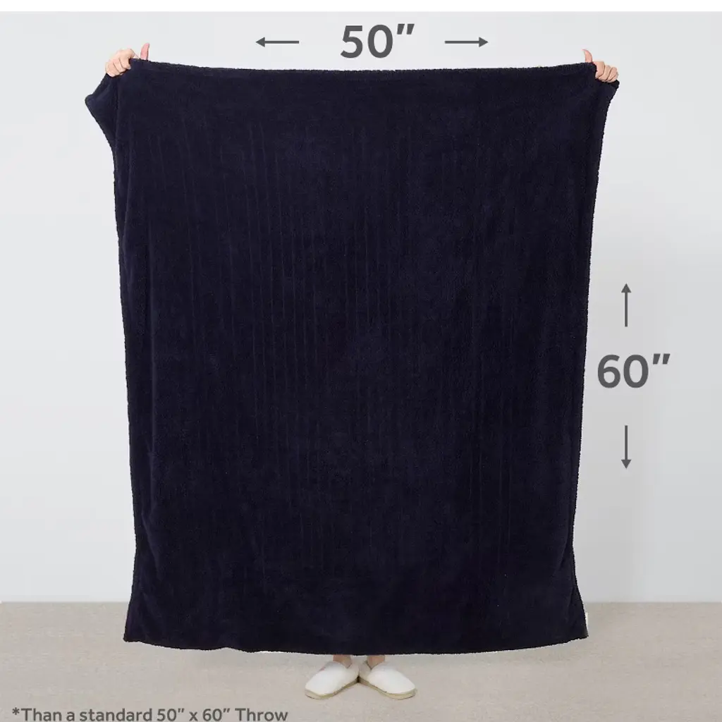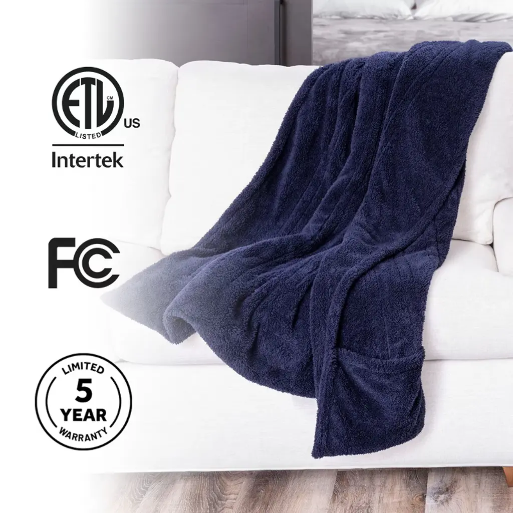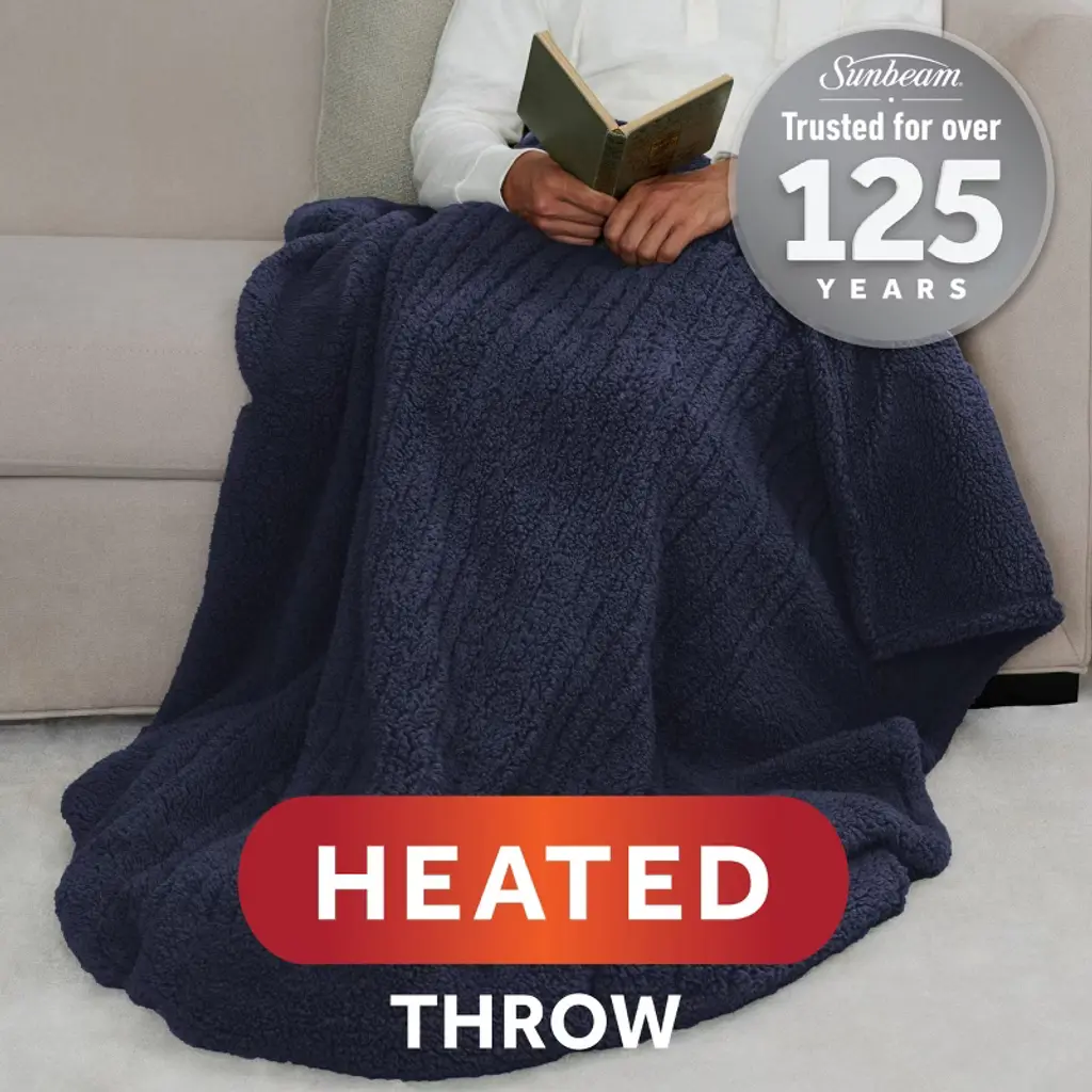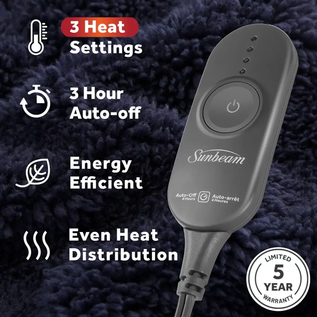 Sunbeam LoftTec Electric Heated Throw with Foot Pocket wraps you in plush, fast-heating comfort from head to toe. Made from ultra-soft LoftTec fabric in a classic navy blue, this 50" x 60" throw is designed for full-body warmth—perfect for lounging on the couch, winding down in bed, or staying warm while working from home.A built-in foot pocket helps lock in heat exactly where you need it most. The push-button controller offers 3 heat settings so you can find your ideal temperature with ease. Fast-heating technology warms quickly, while a 3-hour auto shut-off and overheat protection provide added safety and peace of mind.When it’s time to clean, simply detach the controller and toss the throw in the washer. It stays soft and cozy wash after wash.Sunbeam—trusted for over 125 years to deliver warmth, safety, and comfort you can rely on.