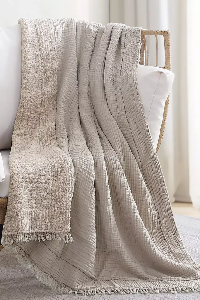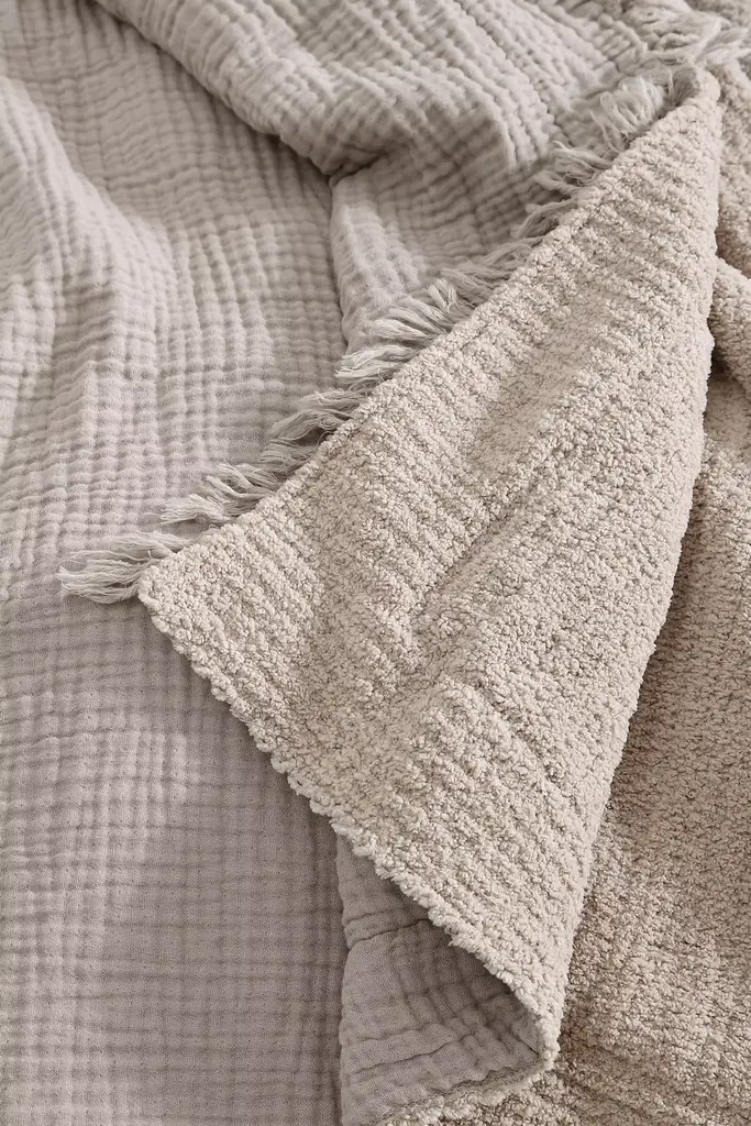 Lovers of style and softness, unite. This delicious throw features lightweight Muslin cotton on one side and our signature Snug fabric on the other. As airy and breathable as it is soft and oversized, embrace that freshly wrinkled look and fringed edge. Machine wasable & OEKO-TEX certified.* Front: 100% Cotton. Back: 100% Microfiber.* Machine wash cold. Gentle cycle. Do not bleach. Tumble dry low.* Imported#### *Dimensions** 75" x 52"