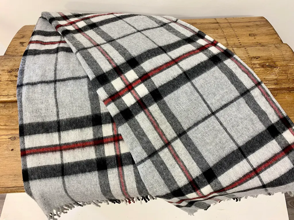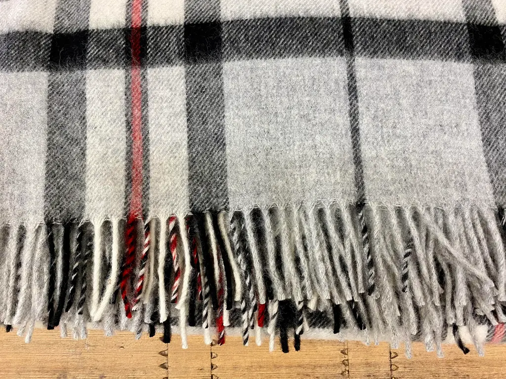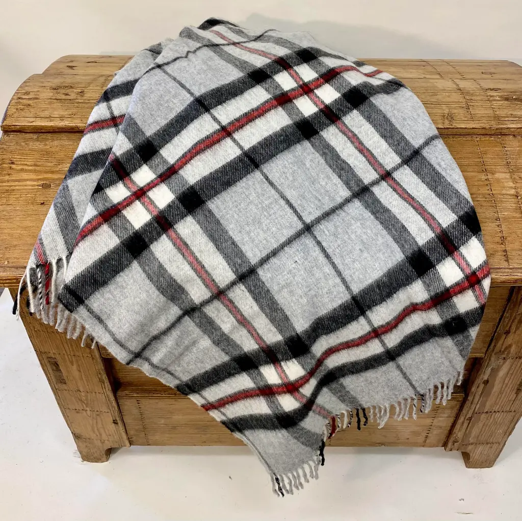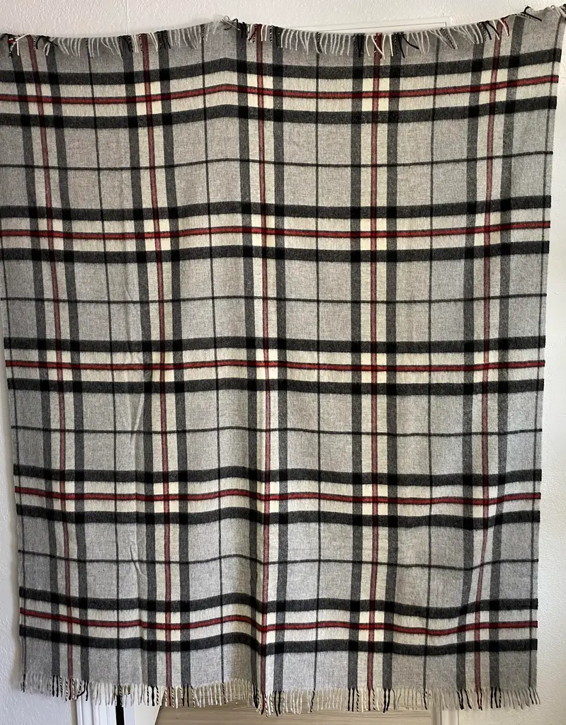 Super Soft Merino Wool Throw In a Burberry-like grey plaid pattern. Made in England A versatile throw in a very familiar Burberry-like plaid pattern. The colors are grey, black & red. It is made in England. Established in 1837 with over 180 years of proud British manufacturing & design heritage. already to our name, The are one of Great Britain’s last remaining vertical woolen mills. The term ‘vertical’ is a throwback to the Victorian era when mills would rise several stories, with each floor containing separate parts of the manufacturing process. Today it remains a unique confirmation of our authenticity; we control every stage of production from raw wool to finished product including Dyeing, Blending, Carding, Spinning, Warping, Weaving, and Finishing. They create their products with a balance between innovative design & traditional craft, maintaining their position at the forefront of commercial trends with consistent high quality. Perfect for a wedding gift or a birthday gift. Can also be worn like a shawl. Size = Approx 66 inches x 56 inches, not including the fringe. Dry clean.