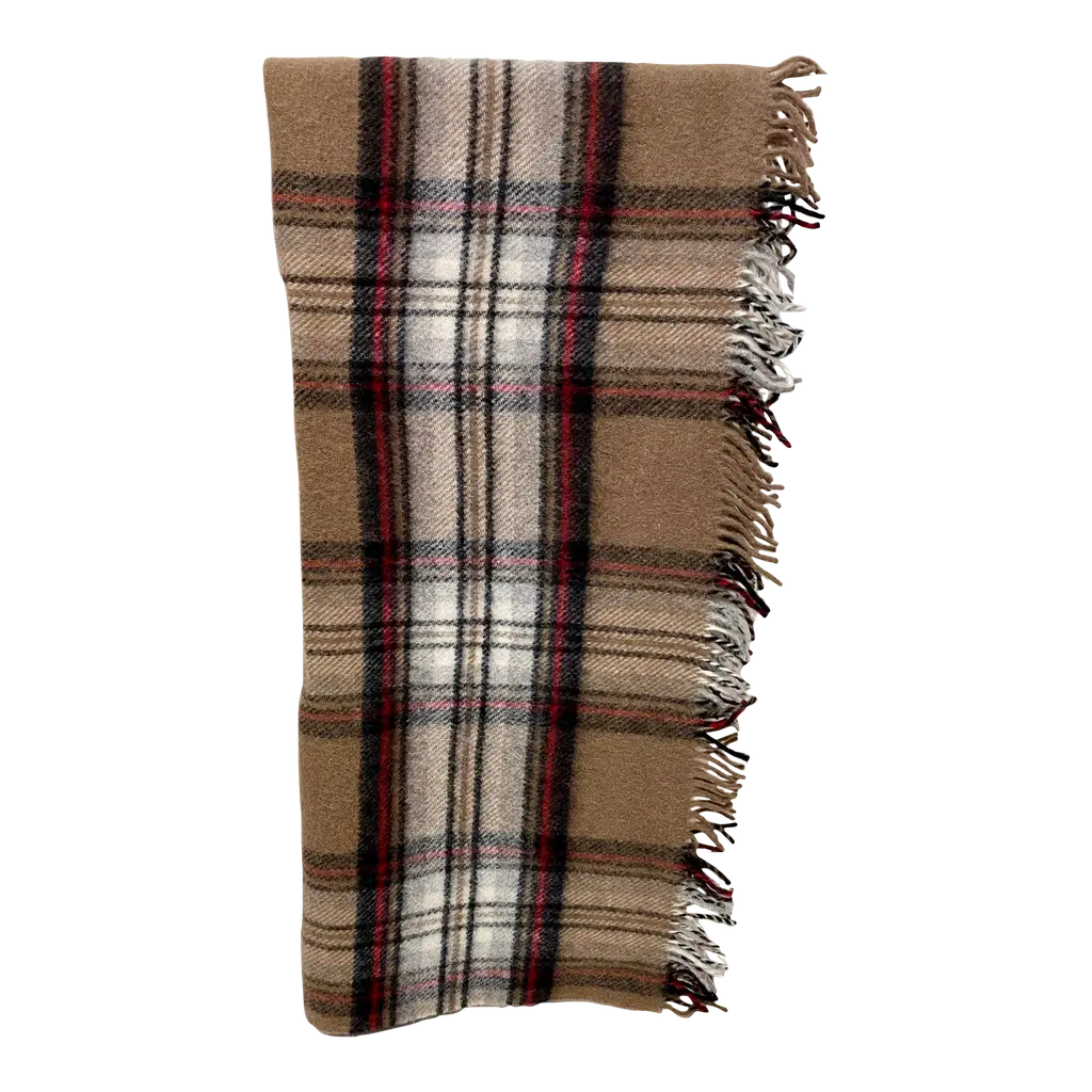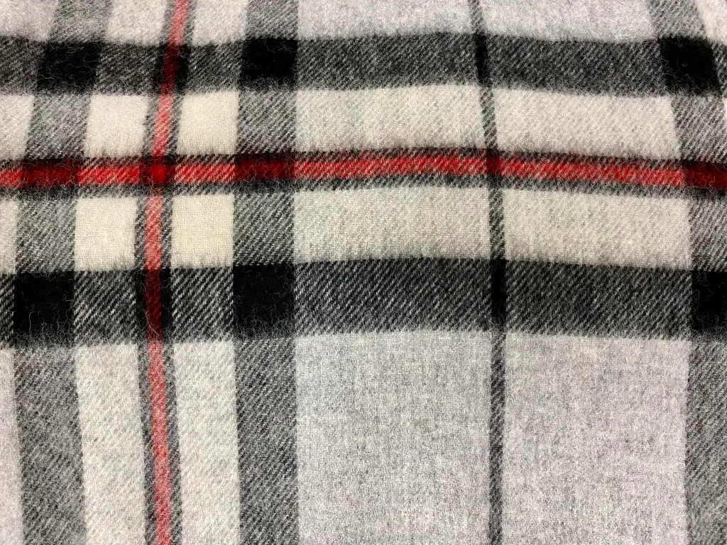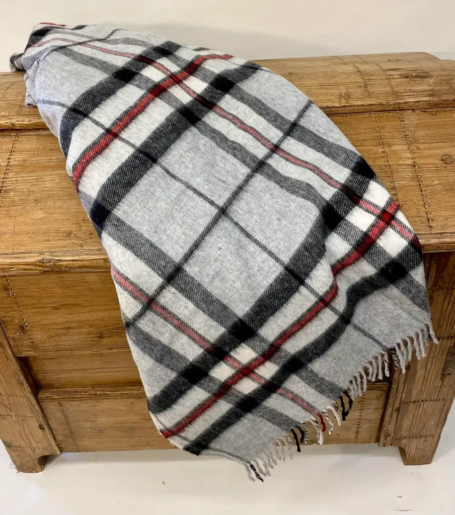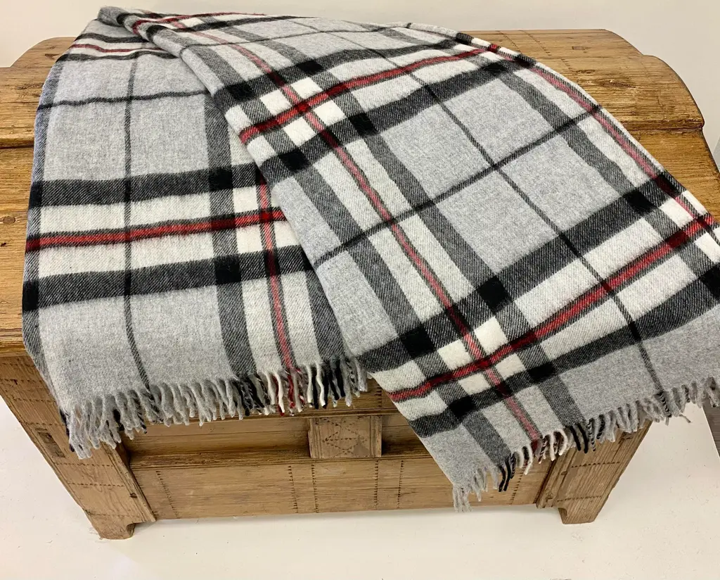 Super Soft Merino Wool Throw In a Burberry-like grey plaid pattern. Made in England A versatile throw in a very familiar Burberry-like plaid pattern. The colors are grey, black & red. It is made in England. Established in 1837 with over 180 years of proud British manufacturing & design heritage. already to our name, The are one of Great Britain’s last remaining vertical woolen mills. The term ‘vertical’ is a throwback to the Victorian era when mills would rise several stories, with each floor containing separate parts of the manufacturing process. Today it remains a unique confirmation of our authenticity; we control every stage of production from raw wool to finished product including Dyeing, Blending, Carding, Spinning, Warping, Weaving, and Finishing. They create their products with a balance between innovative design & traditional craft, maintaining their position at the forefront of commercial trends with consistent high quality. Perfect for a wedding gift or a birthday gift. Can also be worn like a shawl. Size = Approx 66 inches x 56 inches, not including the fringe. Dry clean.